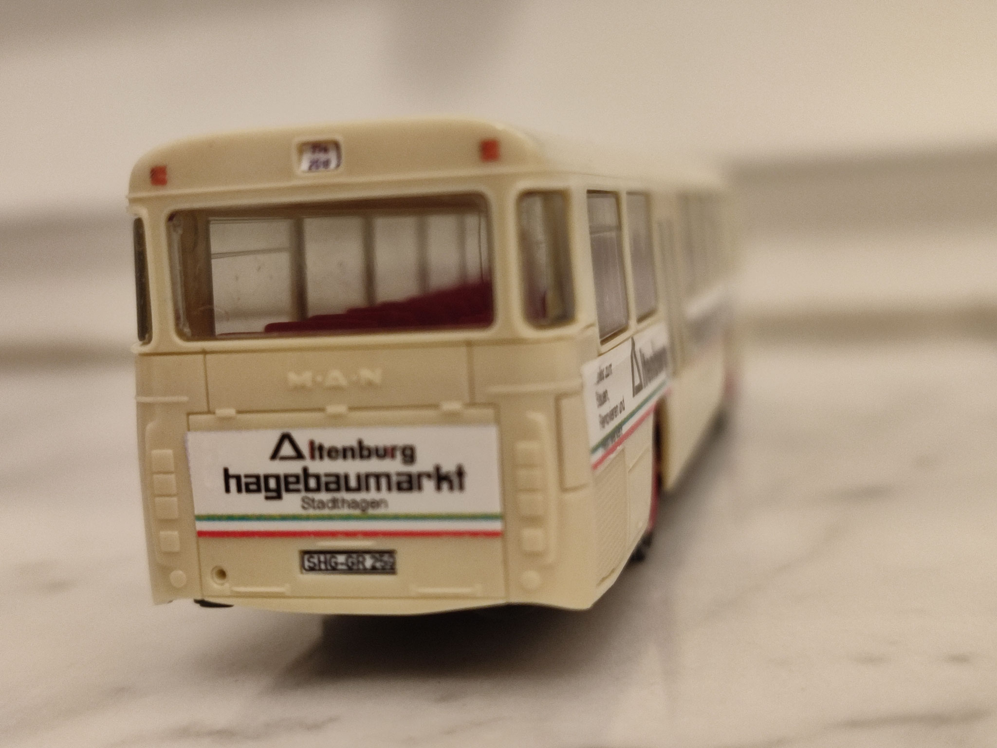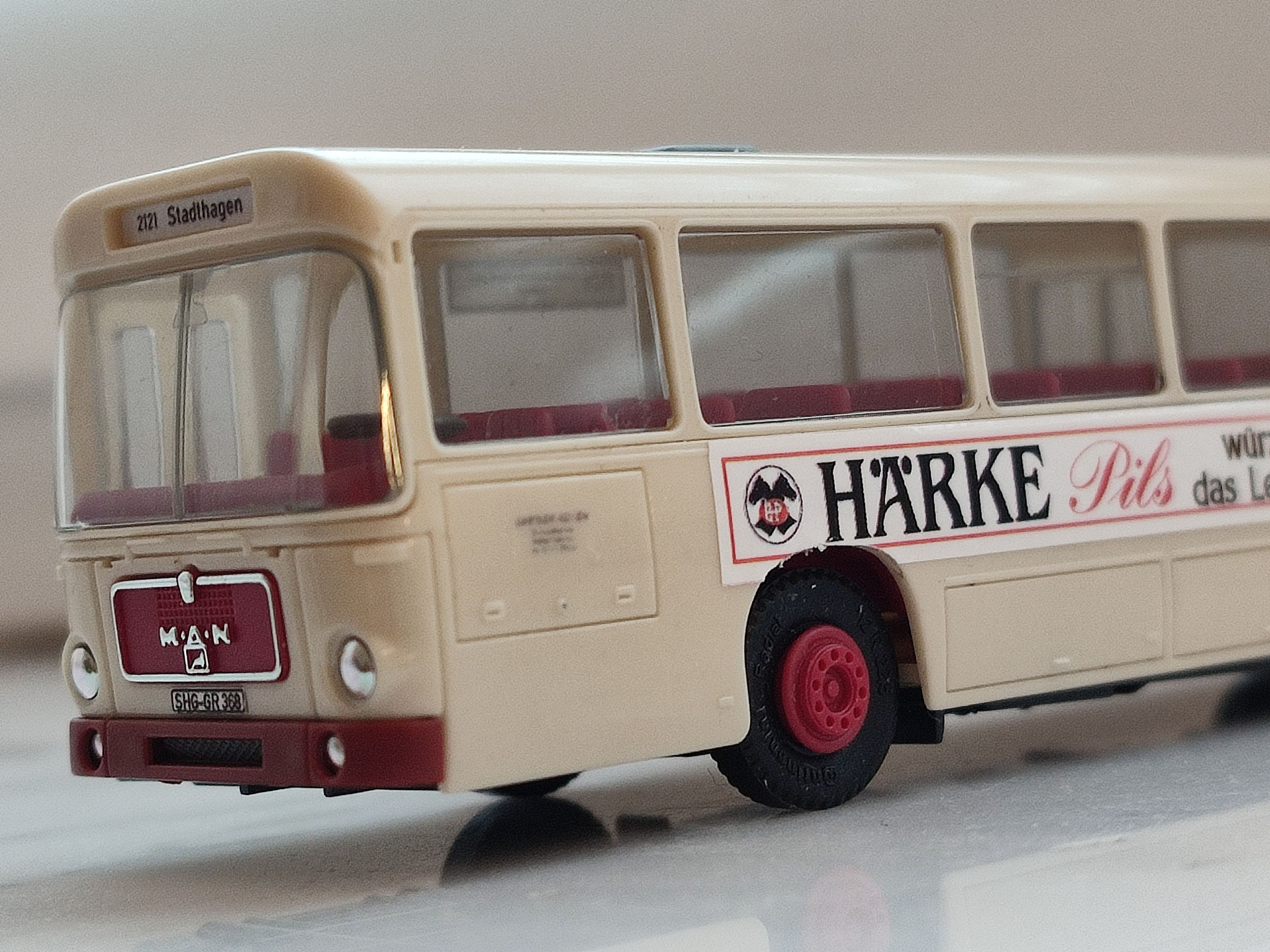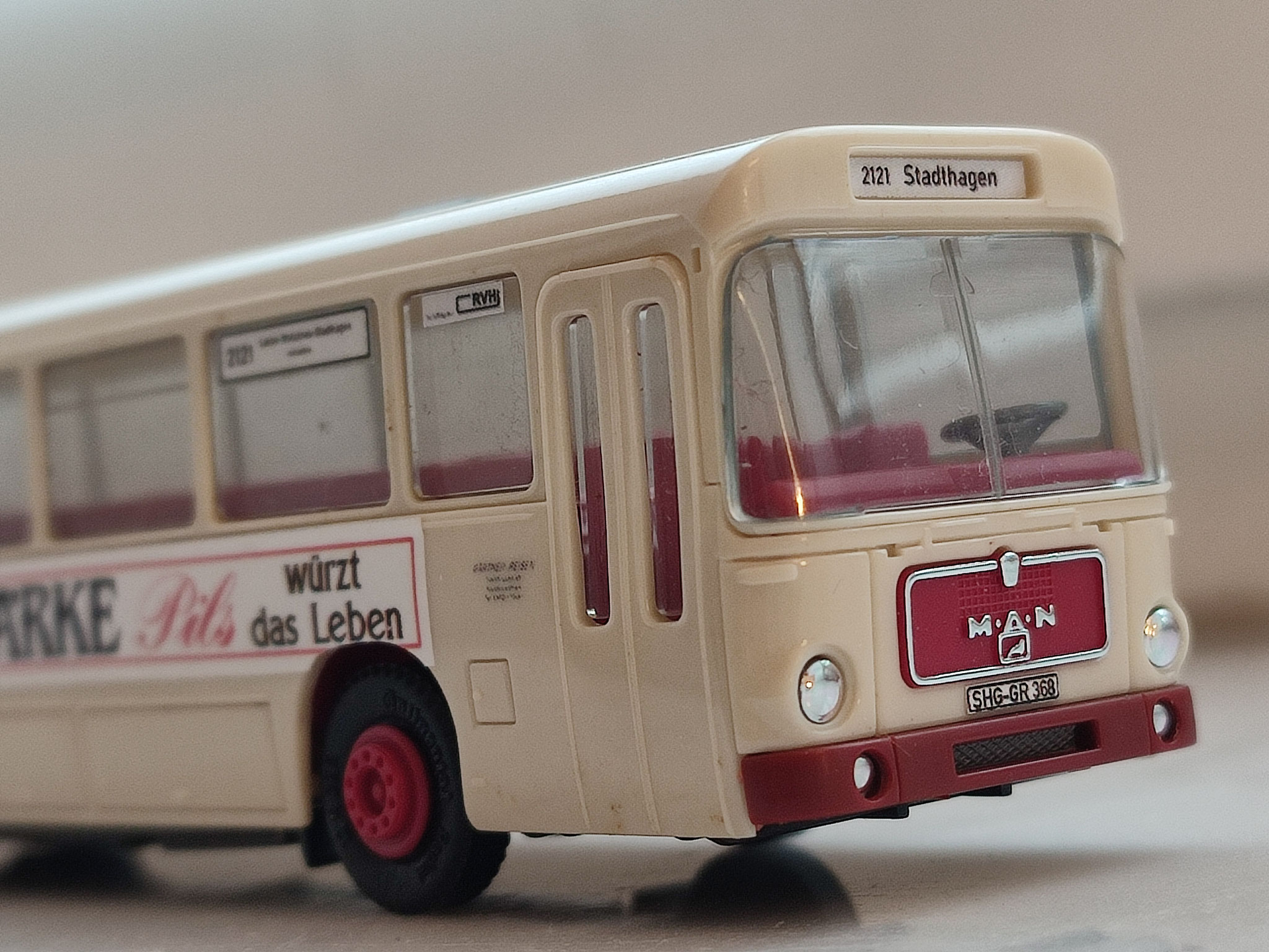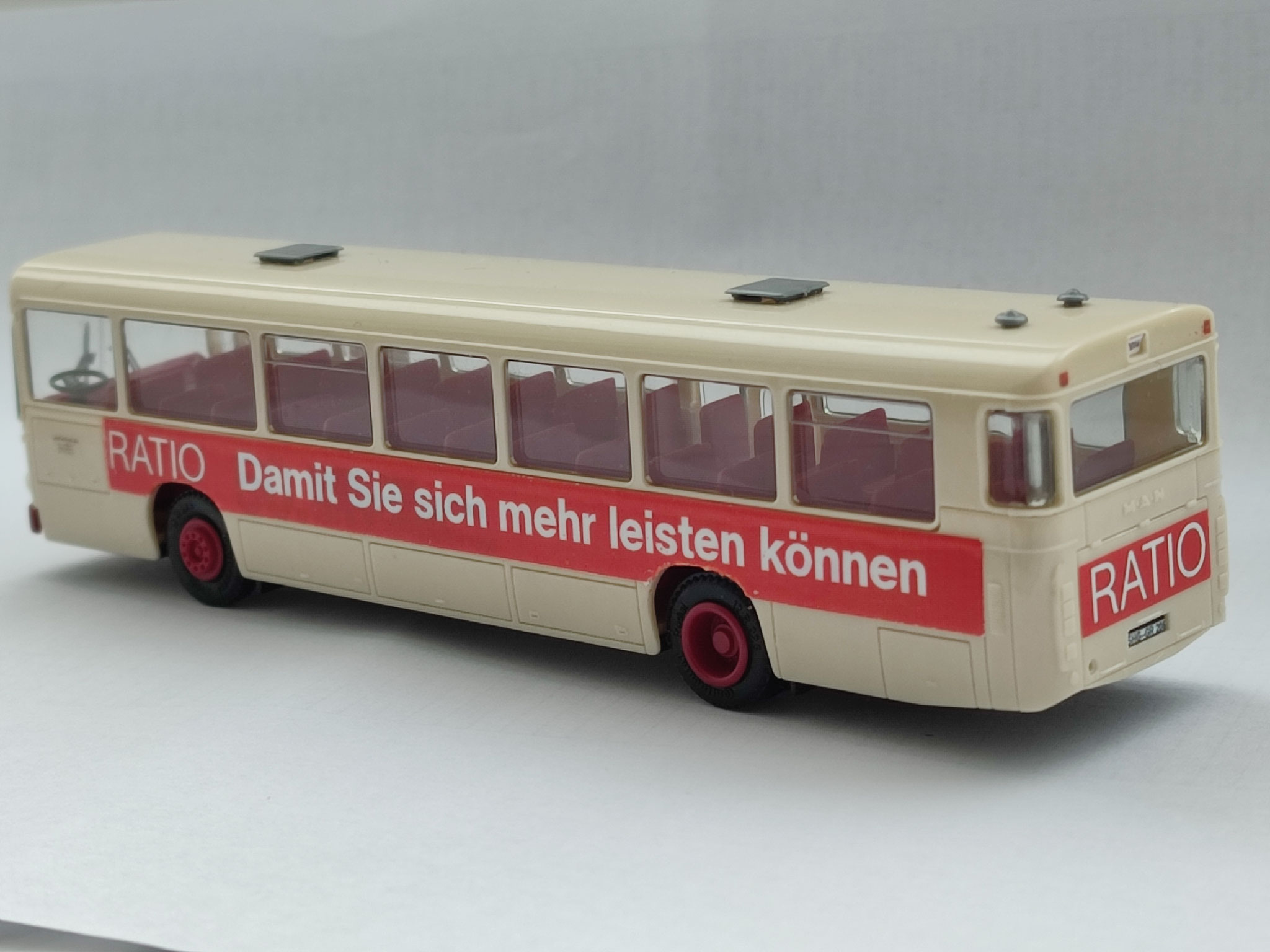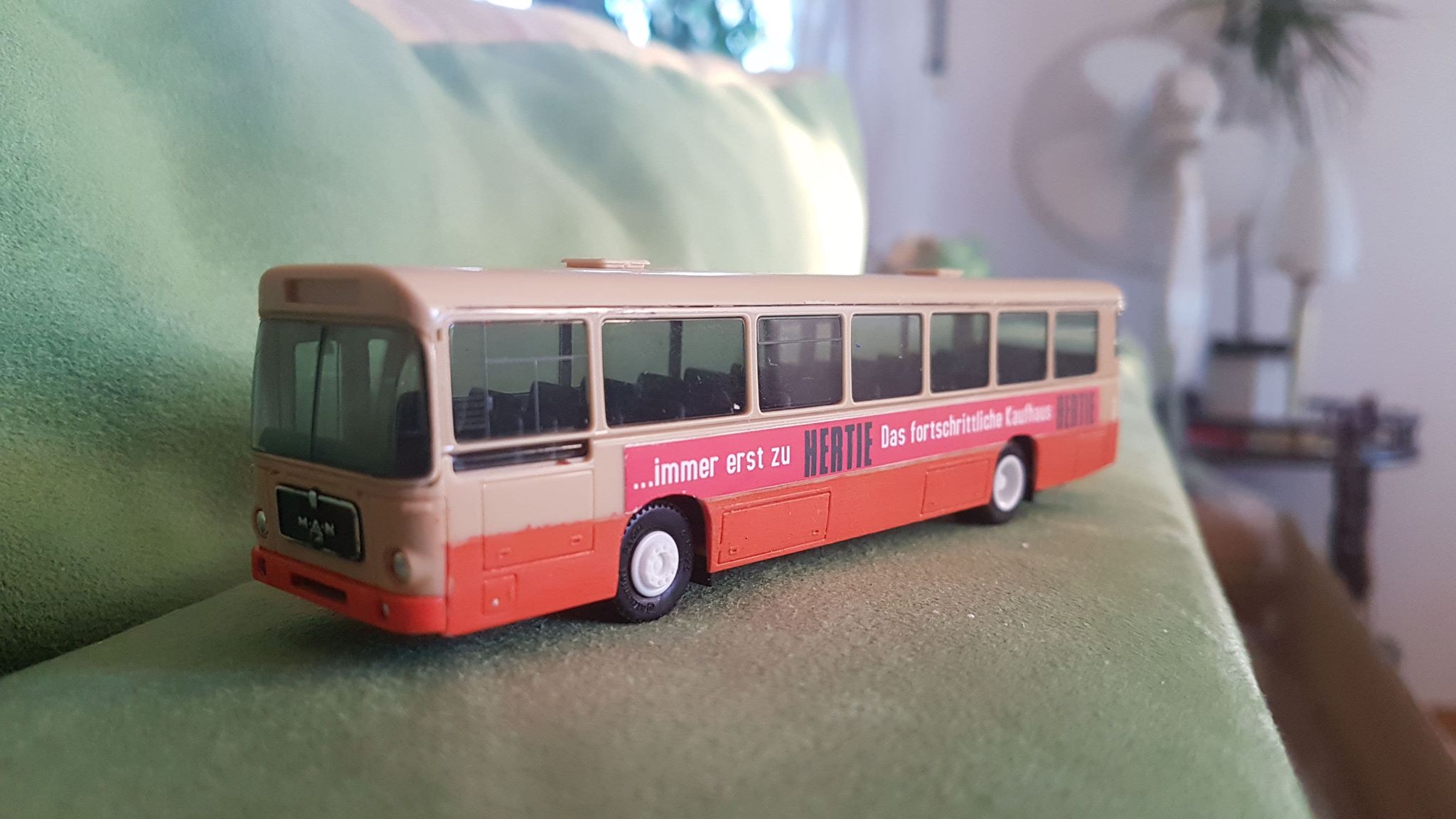 Von Herrn Wisotzki wurden diese Fotos eines MAN SÜ210 zur Verfügung gestellt. Werbung und Zielanzeiger stammen von RGModellbau, der Rest wurde vom Kunden besorgt. Basis das Modell von Herpa.