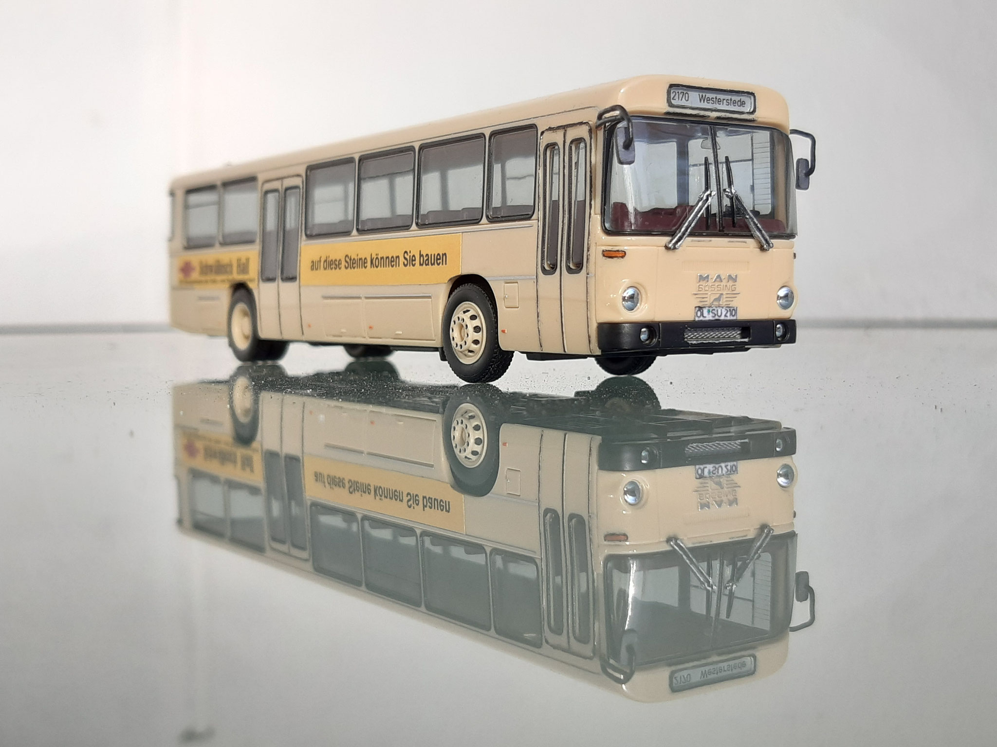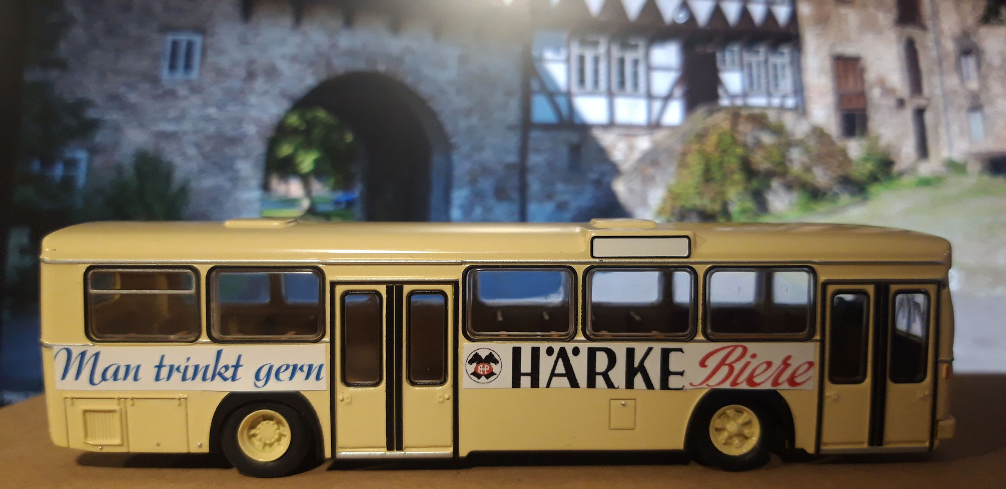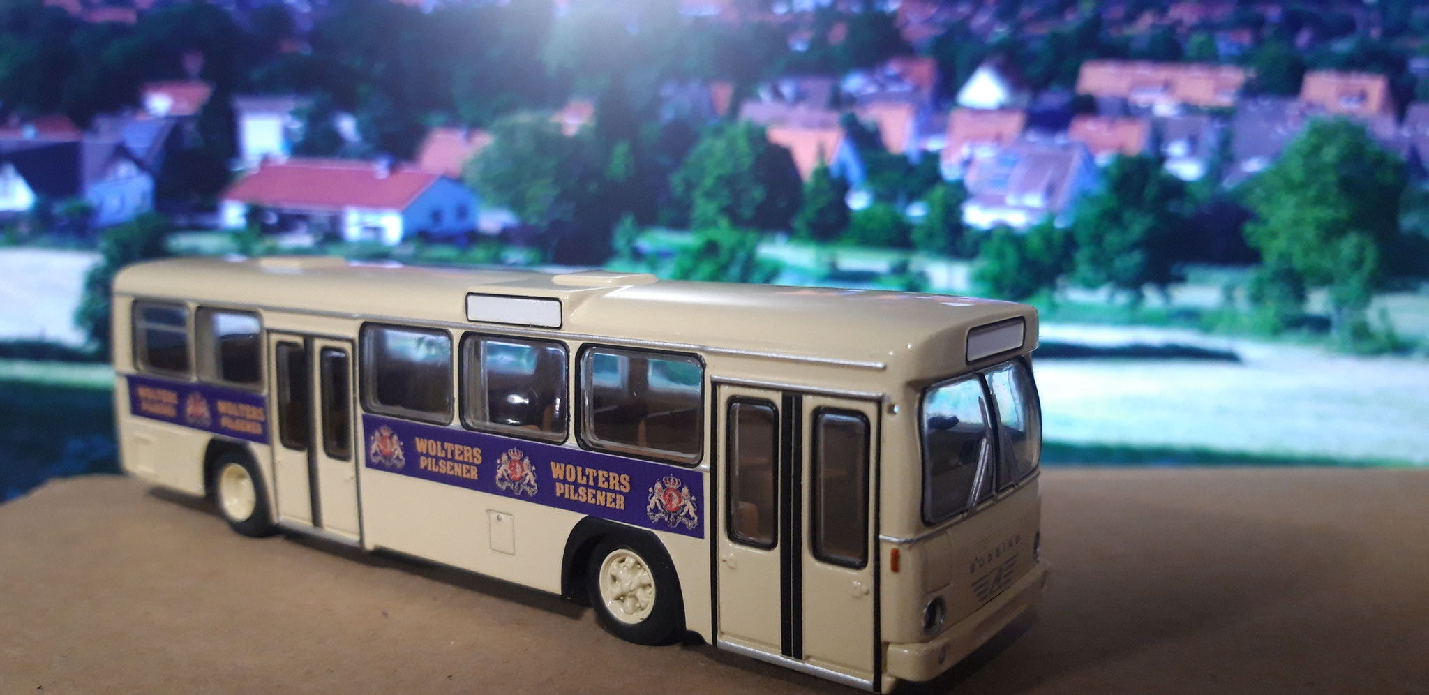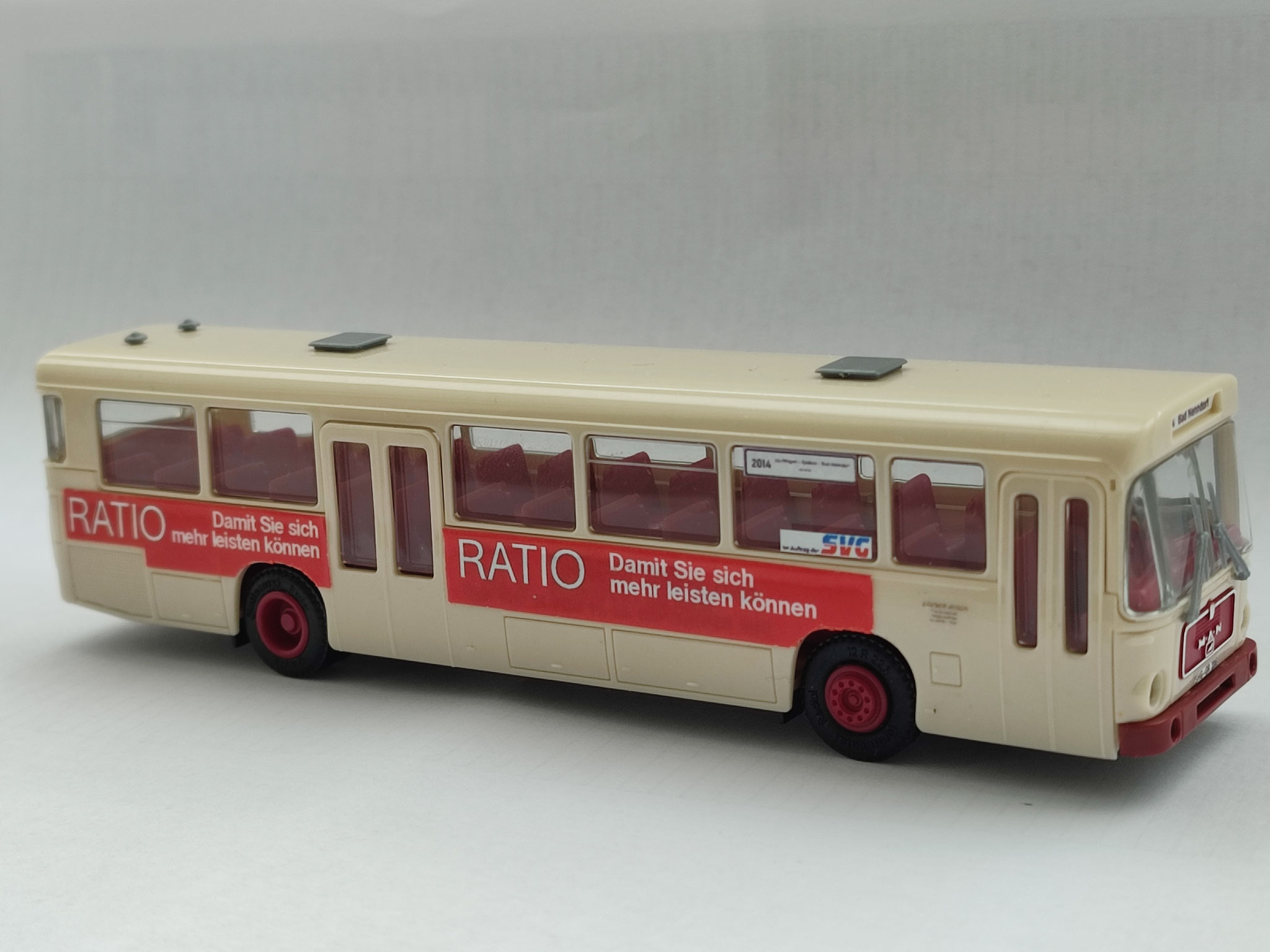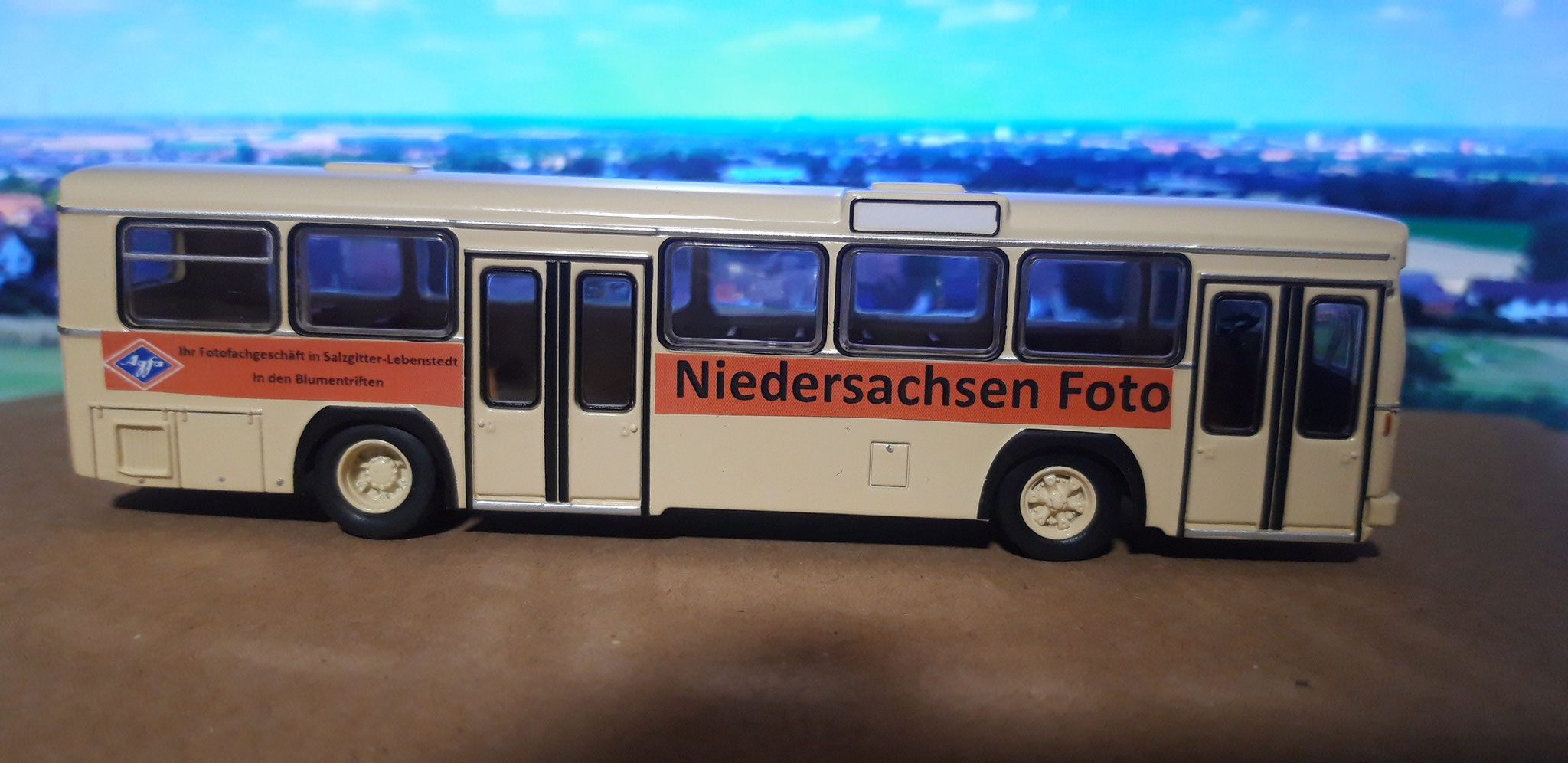 Von Herrn Wisotzki wurden diese Fotos eines MAN SÜ210 zur Verfügung gestellt. Werbung und Zielanzeiger stammen von RGModellbau, der Rest wurde vom Kunden besorgt. Basis das Modell von Herpa.