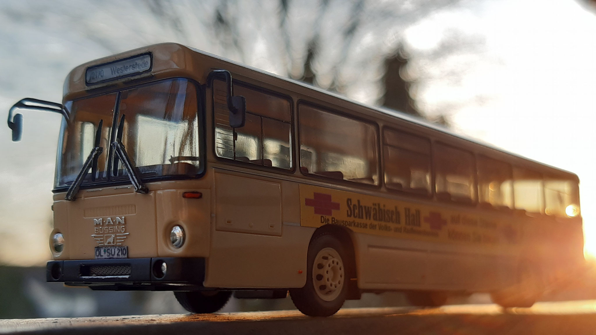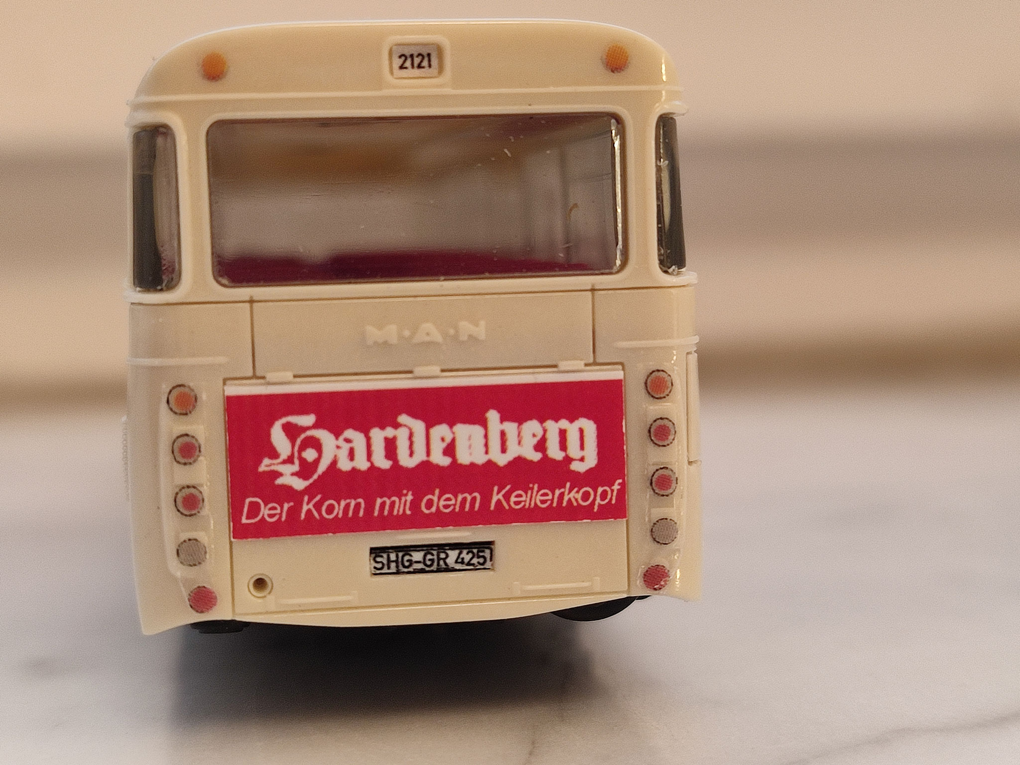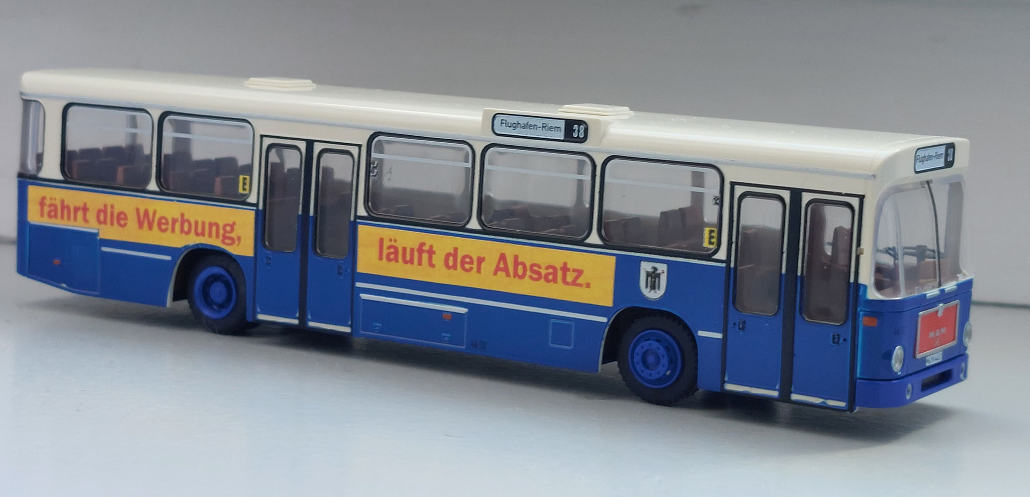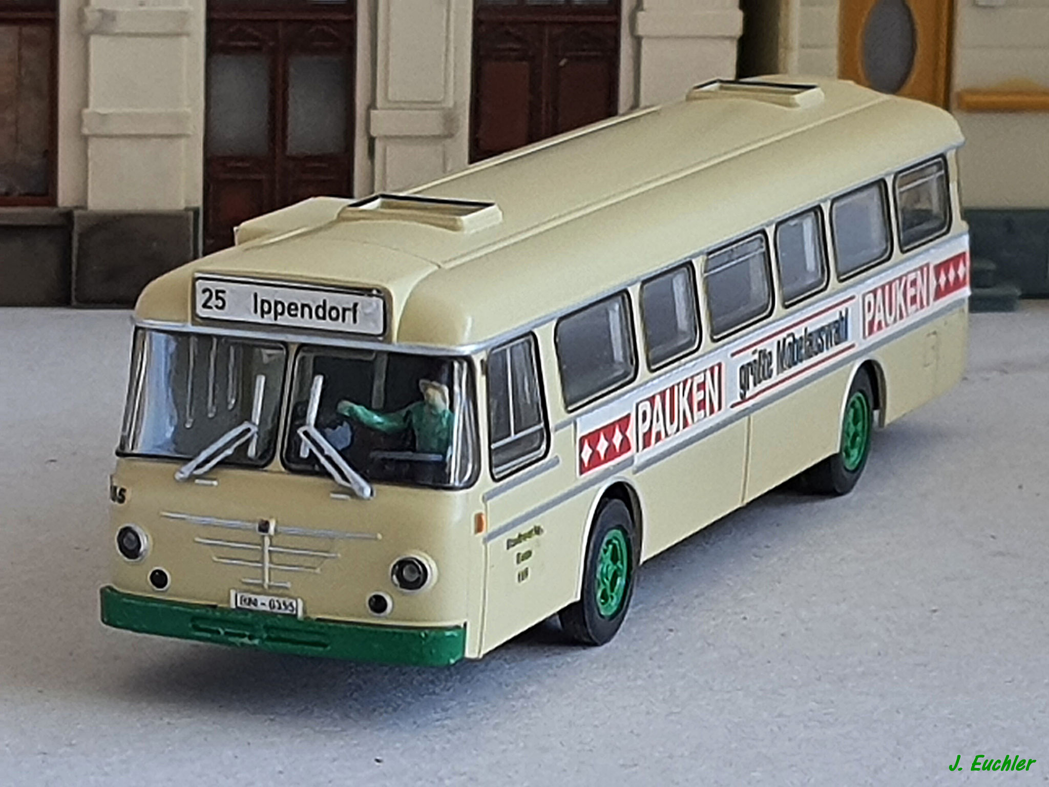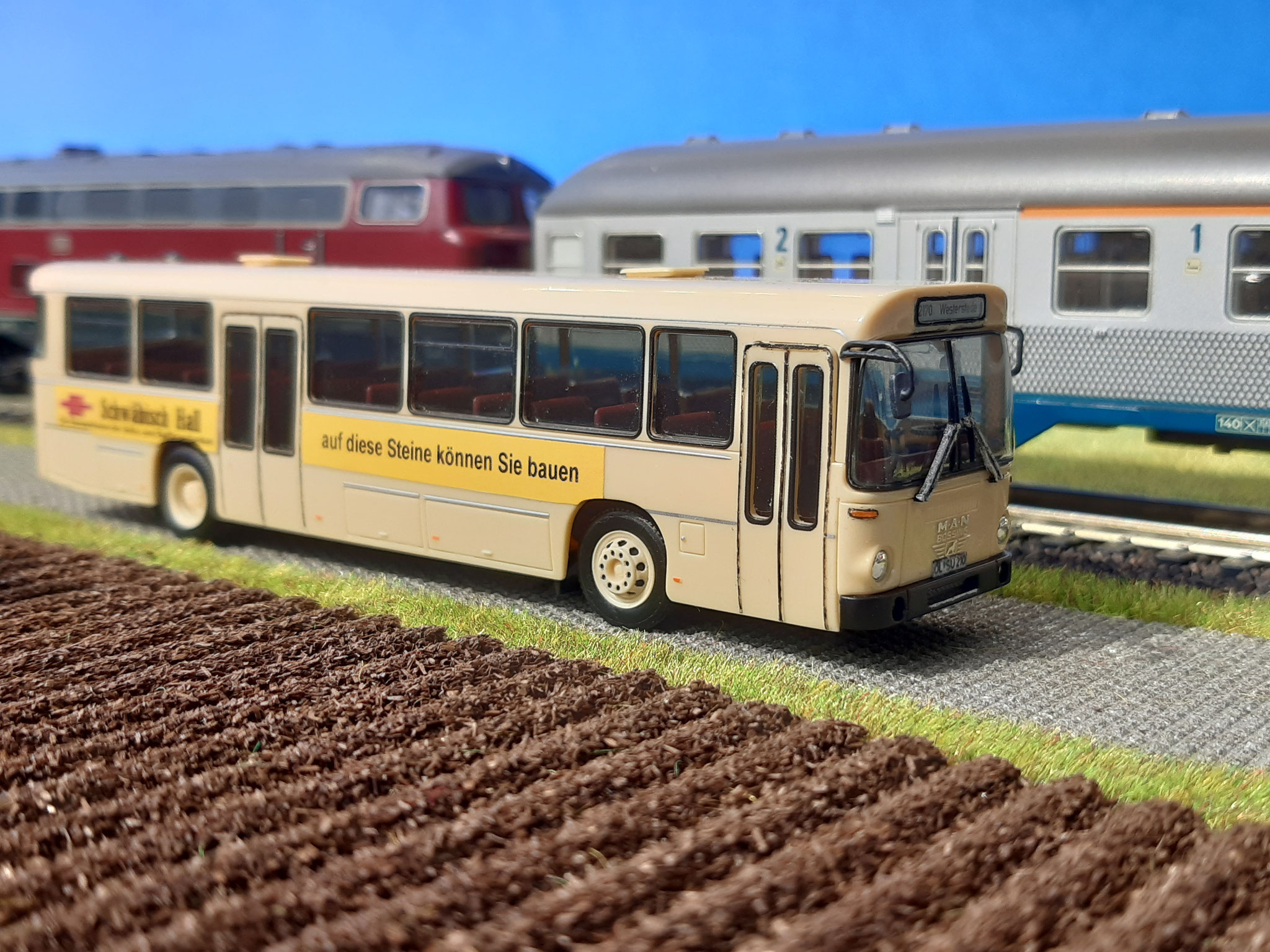 Von Herrn Wisotzki wurden diese Fotos eines MAN SÜ210 zur Verfügung gestellt. Werbung und Zielanzeiger stammen von RGModellbau, der Rest wurde vom Kunden besorgt. Basis das Modell von Herpa.