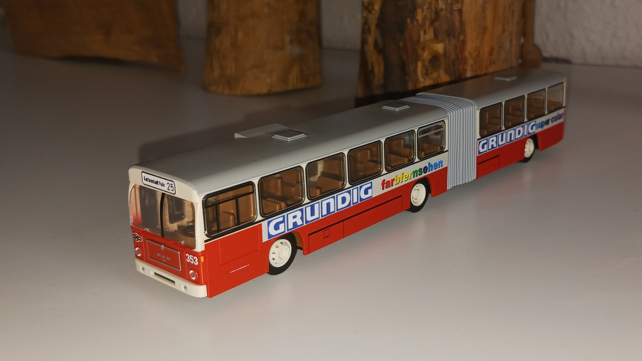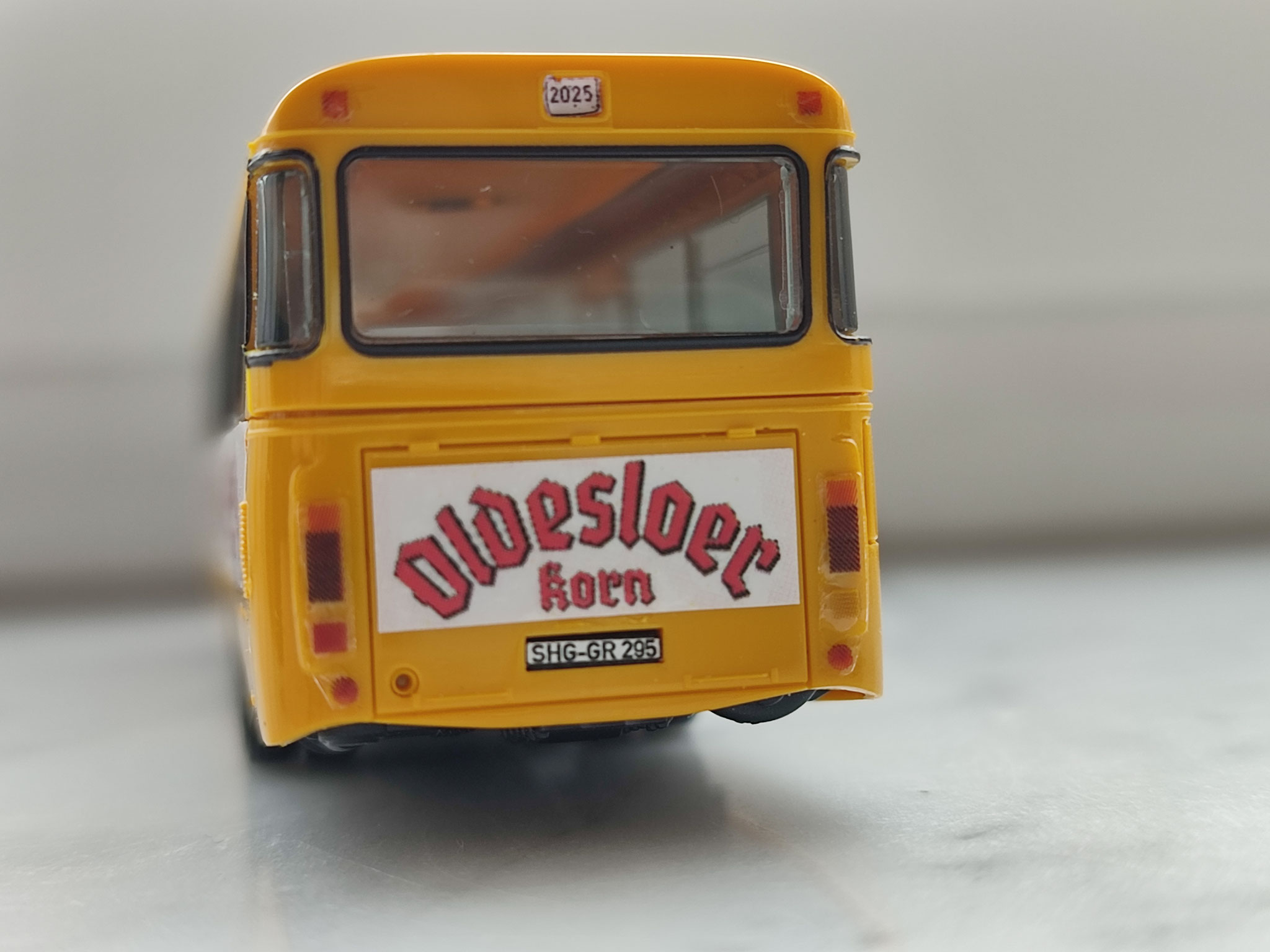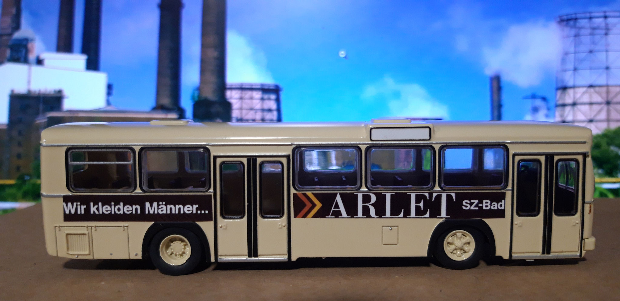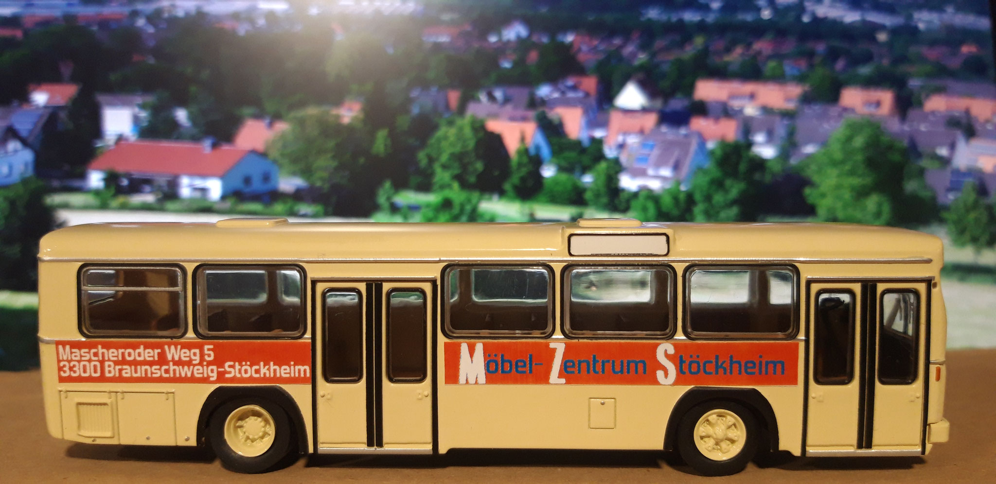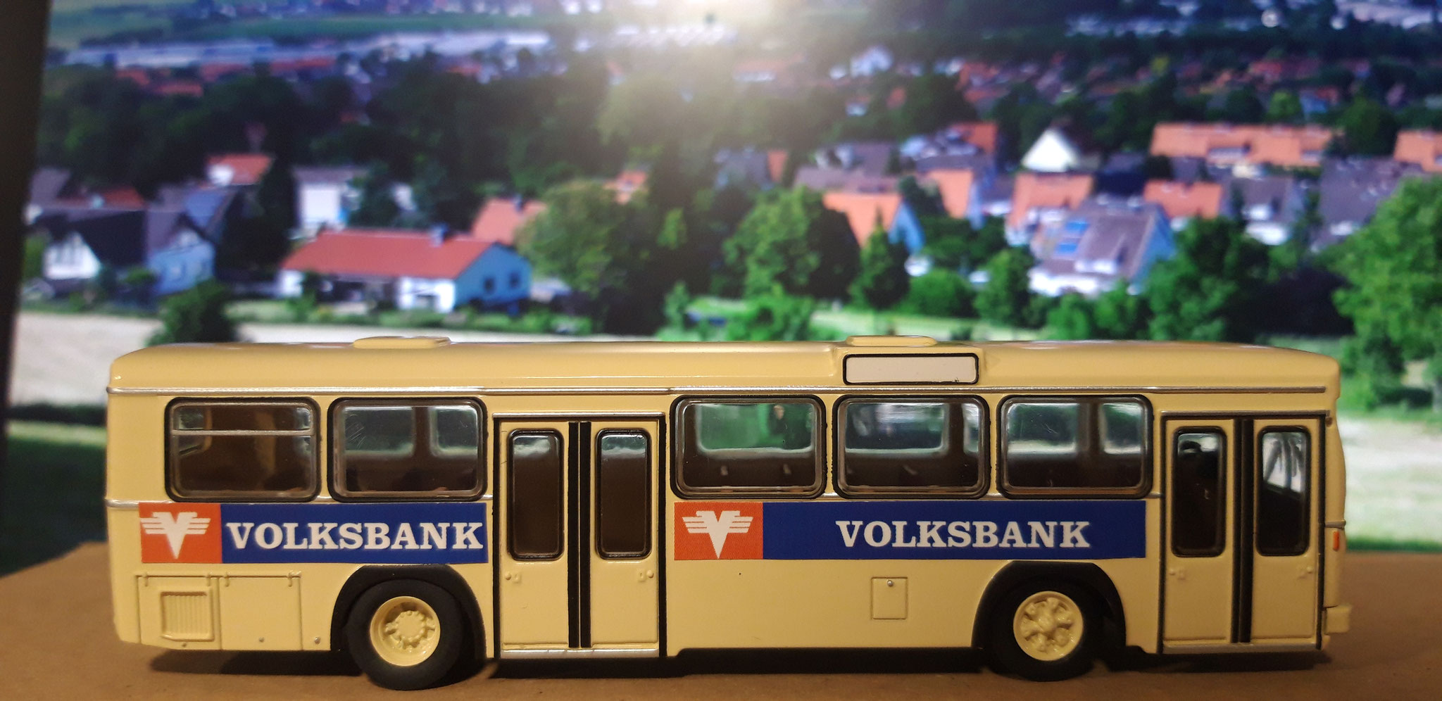 Von Herrn Wisotzki wurden diese Fotos eines MAN SÜ210 zur Verfügung gestellt. Werbung und Zielanzeiger stammen von RGModellbau, der Rest wurde vom Kunden besorgt. Basis das Modell von Herpa.