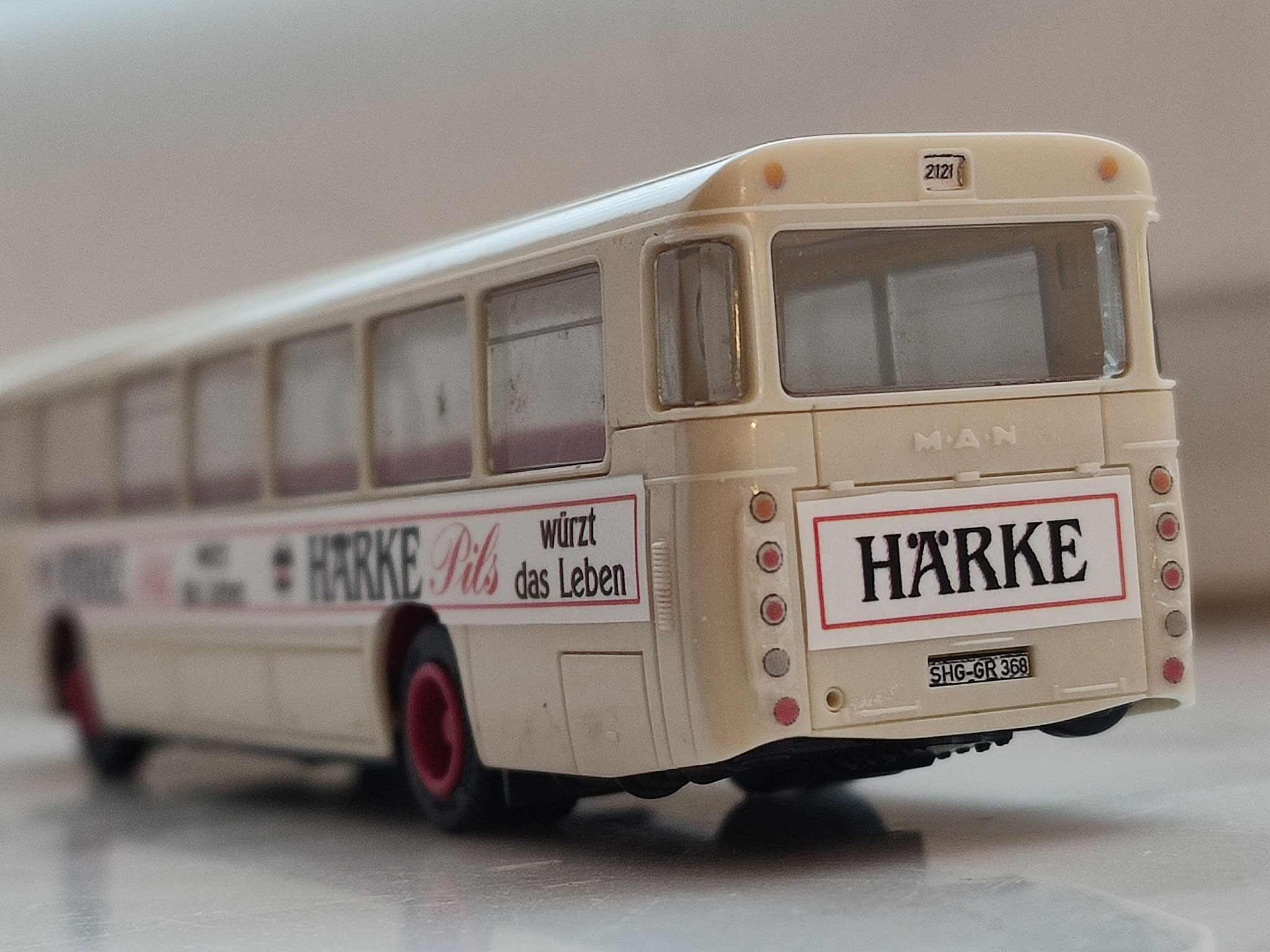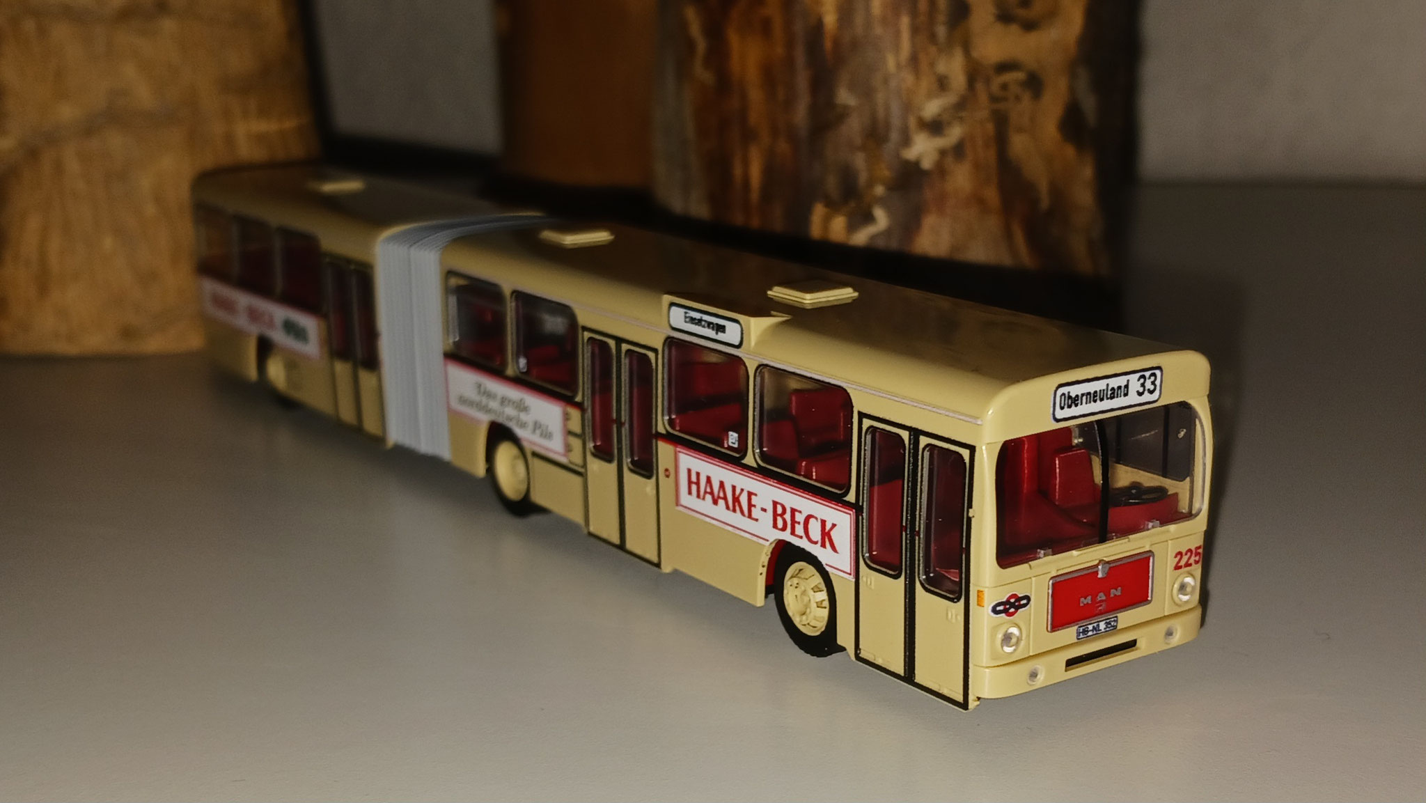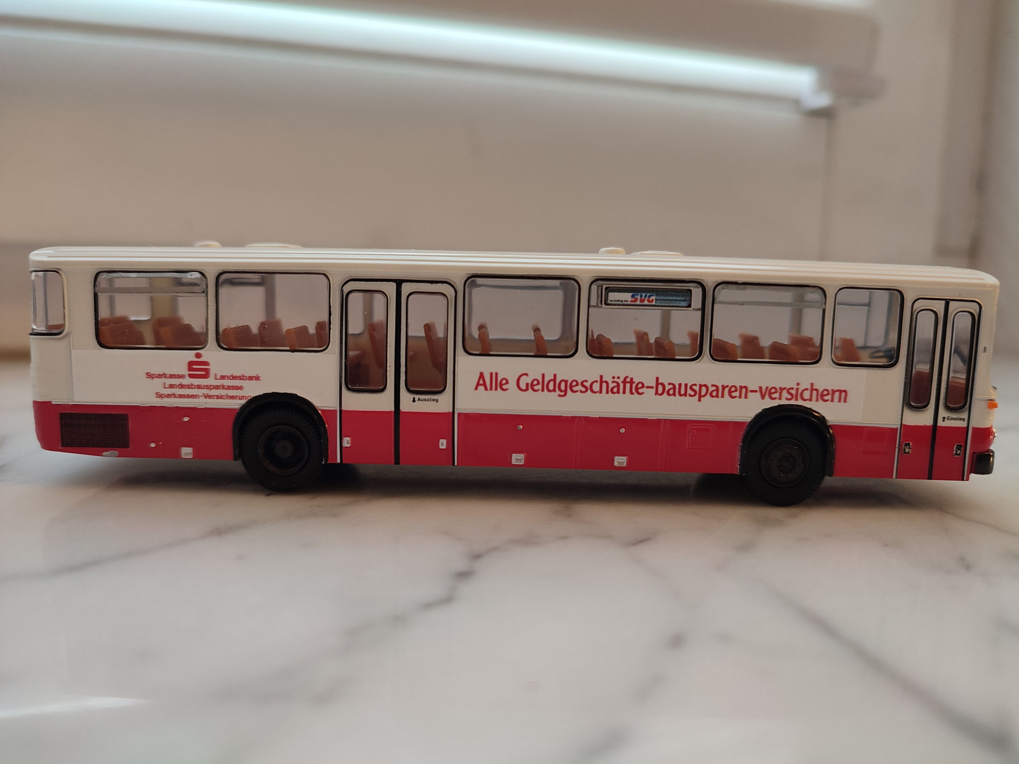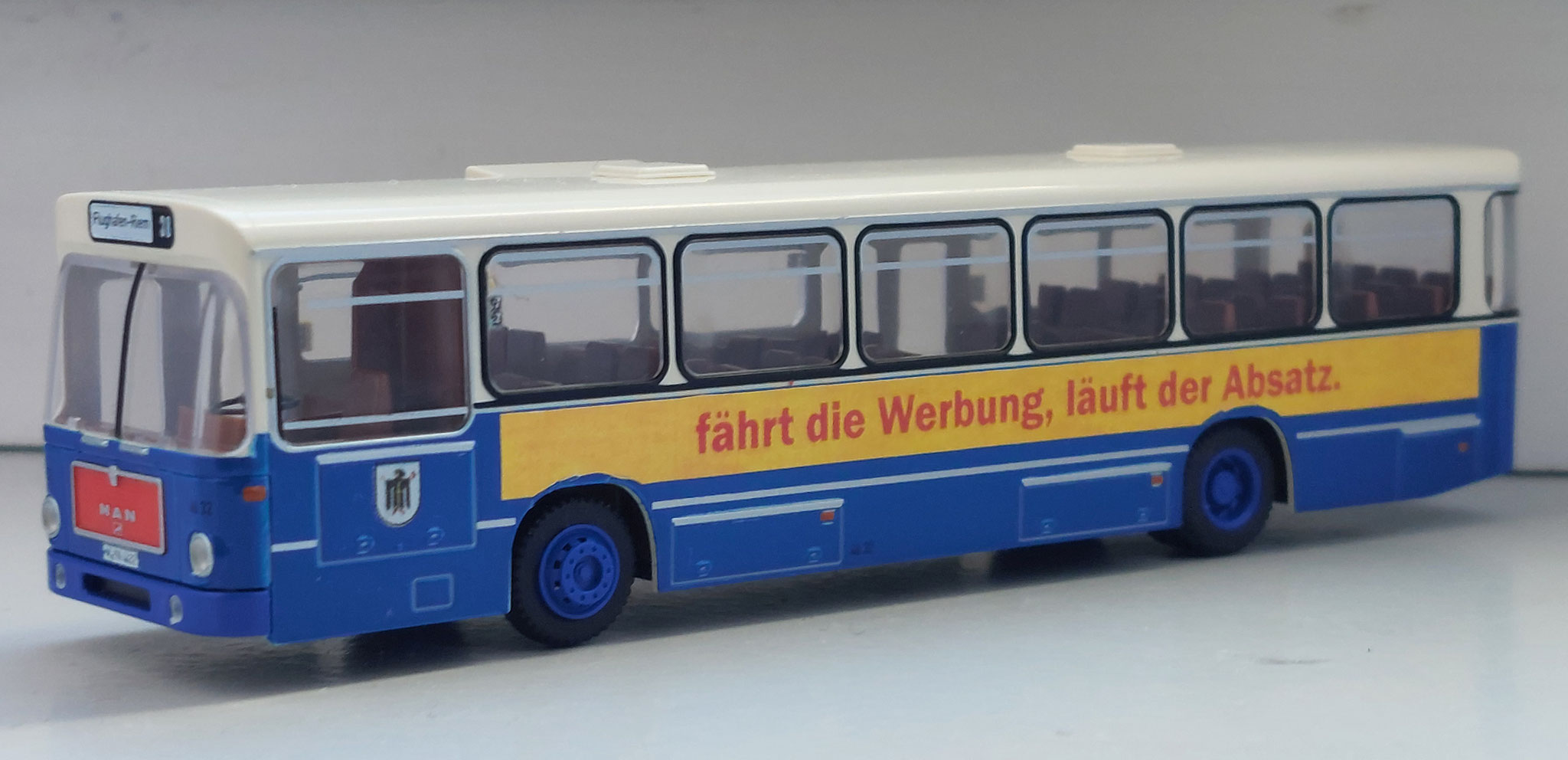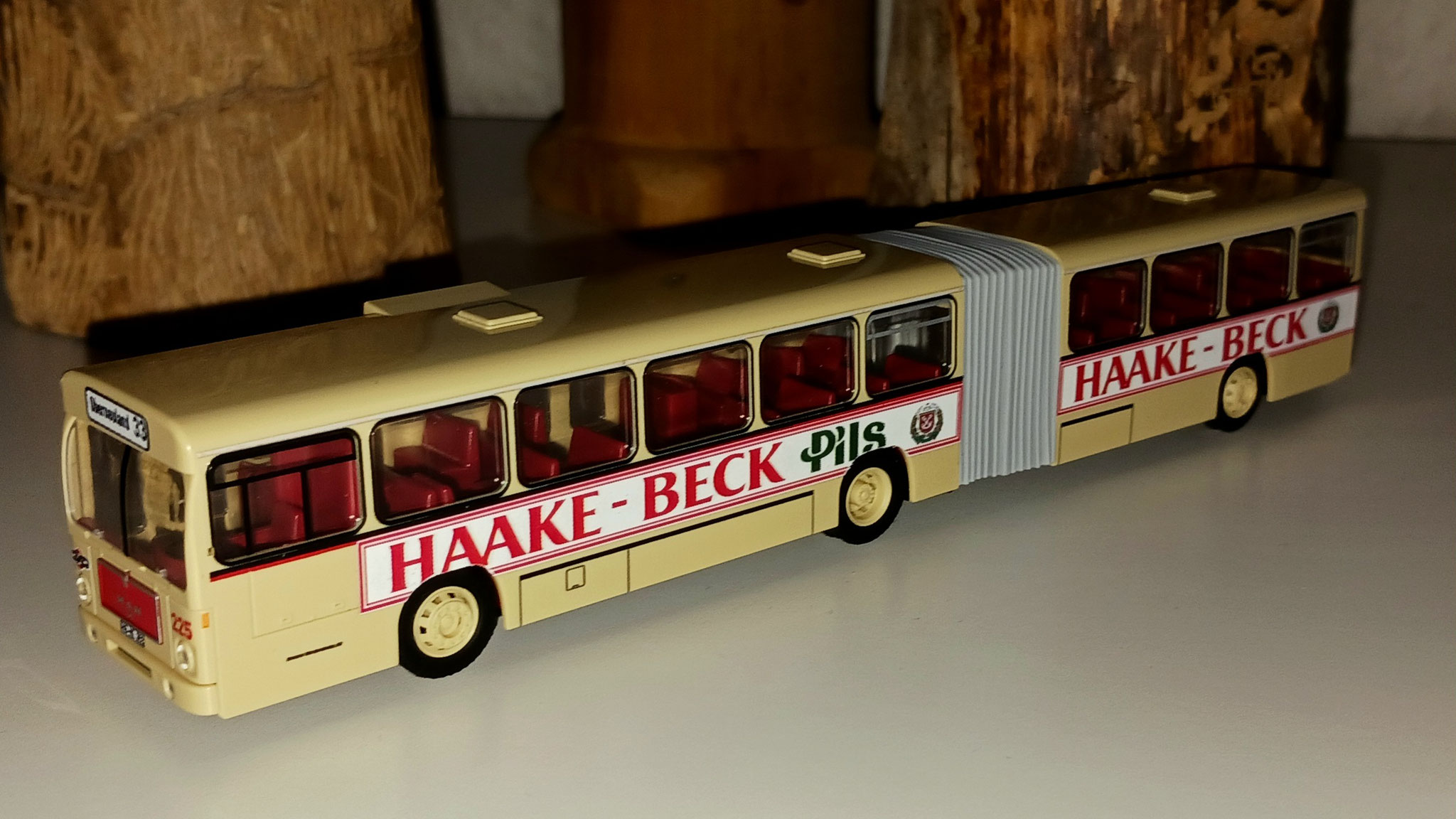 Von Herrn Wisotzki wurden diese Fotos eines MAN SÜ210 zur Verfügung gestellt. Werbung und Zielanzeiger stammen von RGModellbau, der Rest wurde vom Kunden besorgt. Basis das Modell von Herpa.