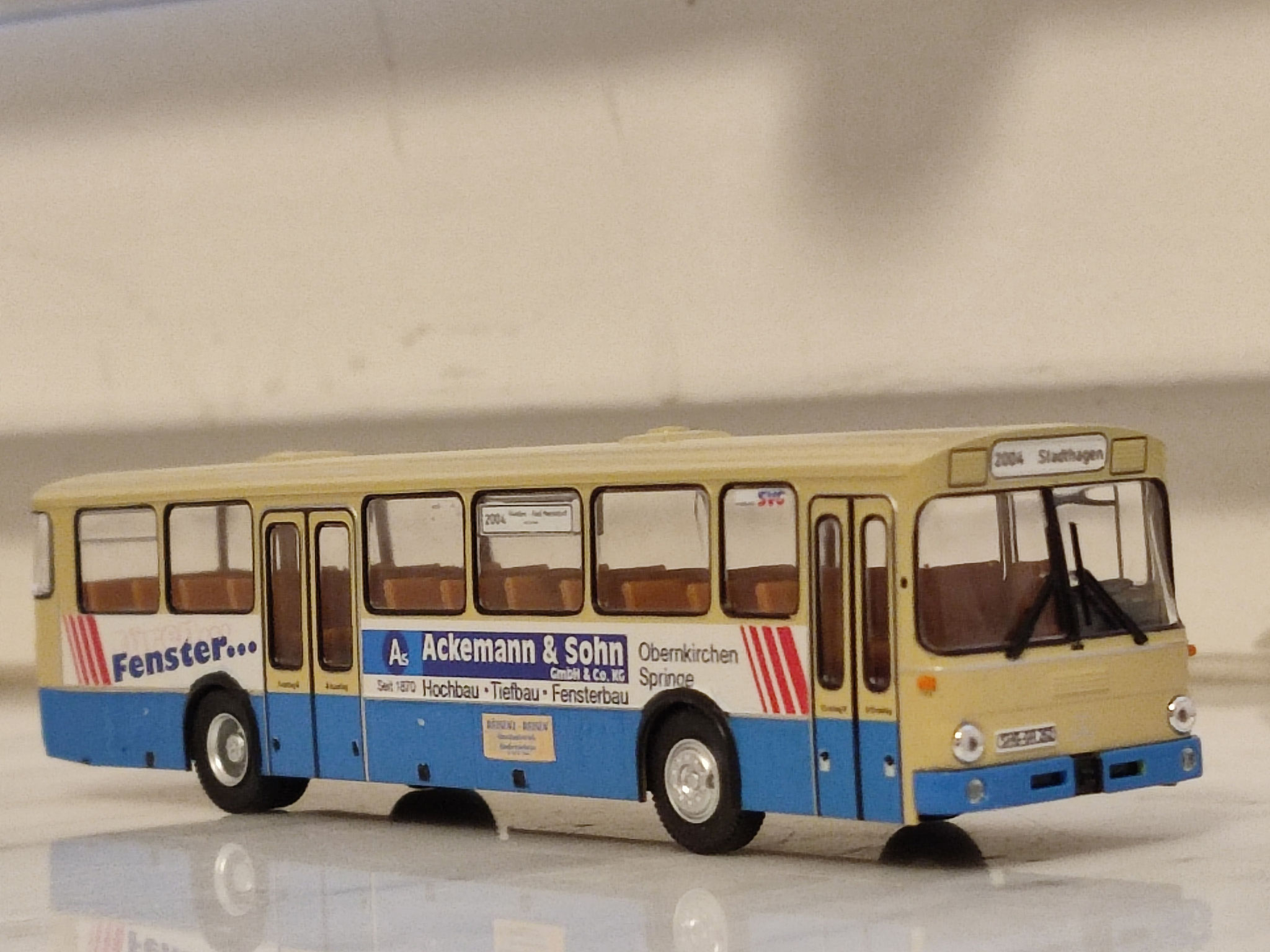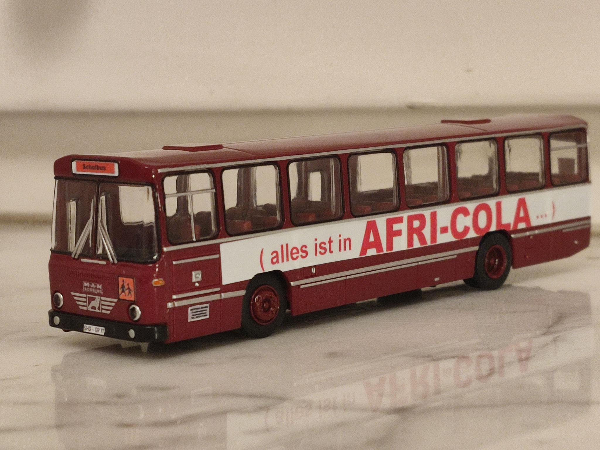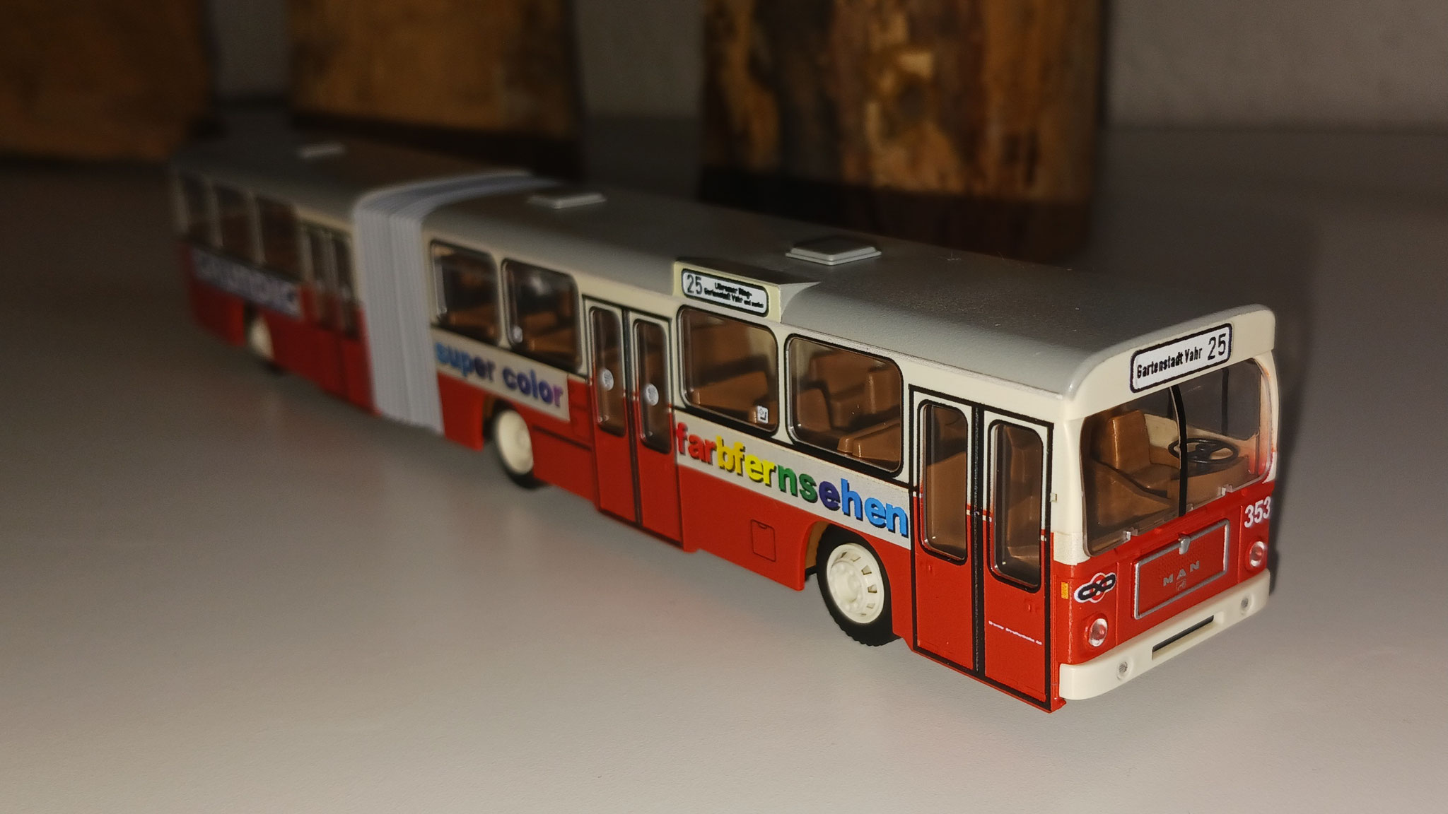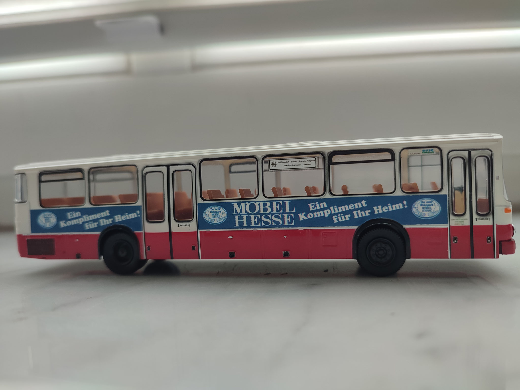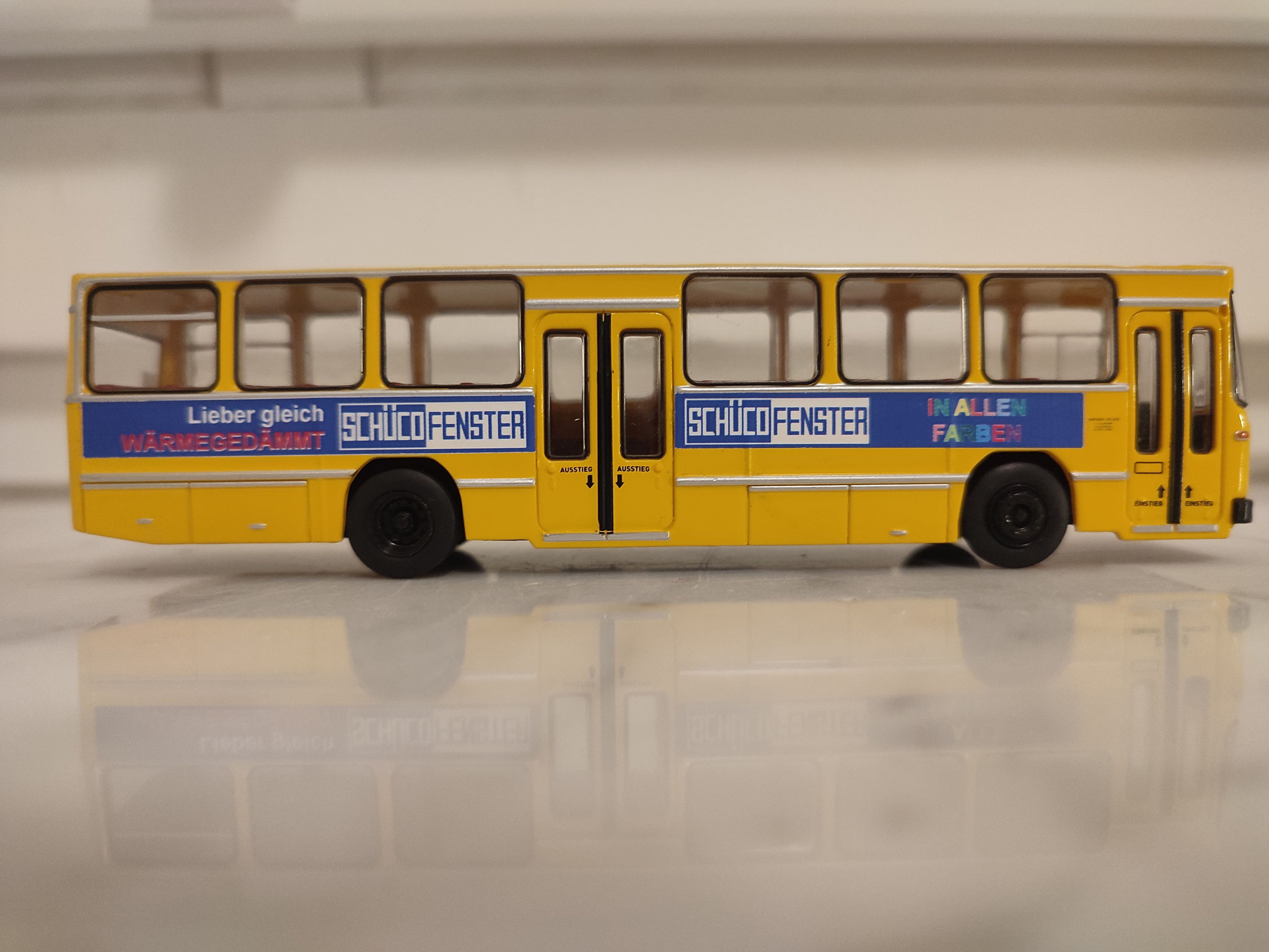 Von Herrn Wisotzki wurden diese Fotos eines MAN SÜ210 zur Verfügung gestellt. Werbung und Zielanzeiger stammen von RGModellbau, der Rest wurde vom Kunden besorgt. Basis das Modell von Herpa.