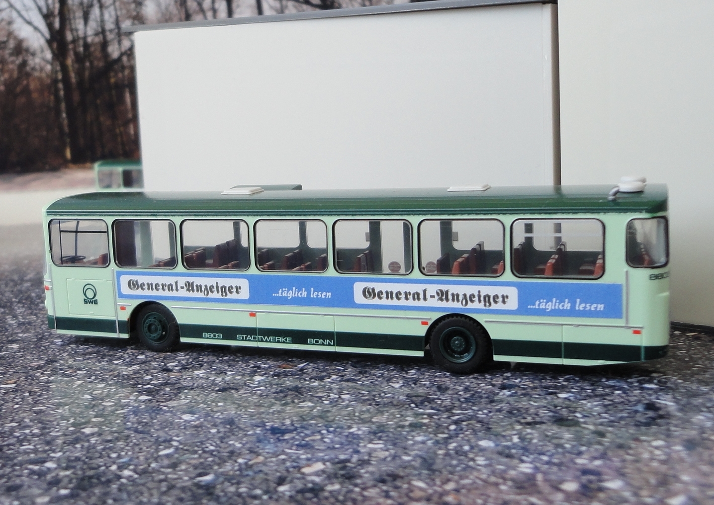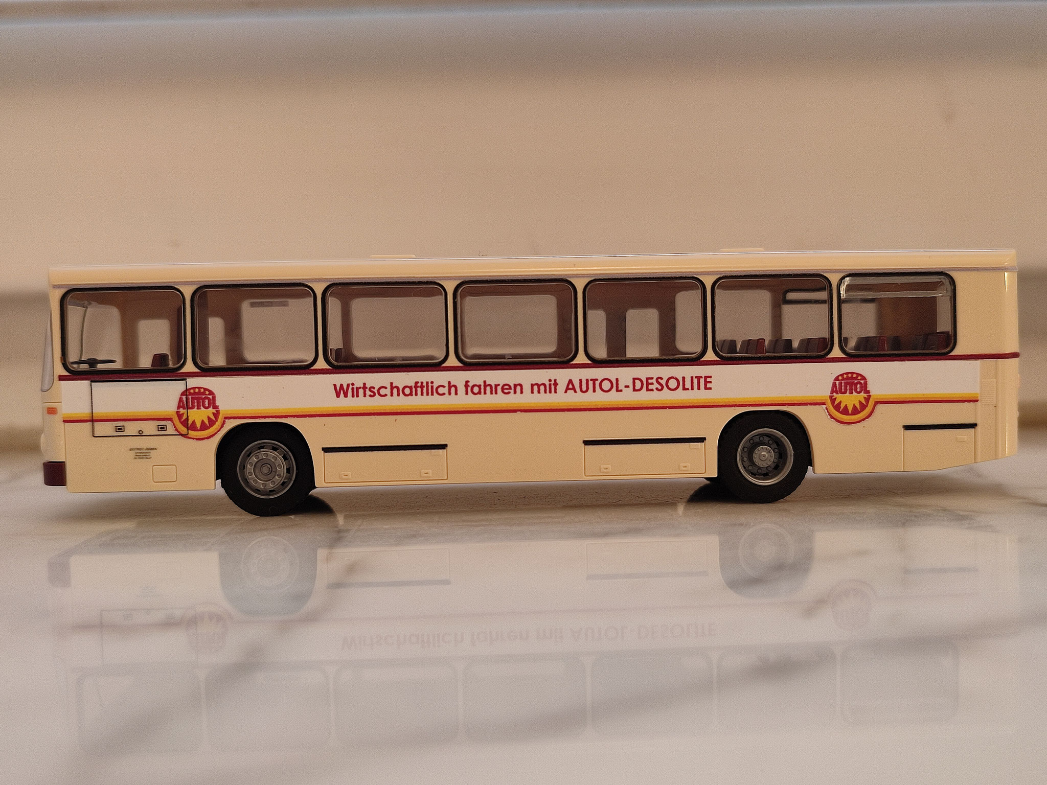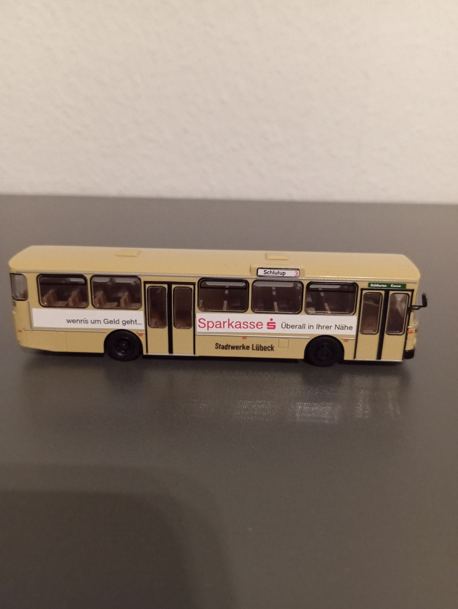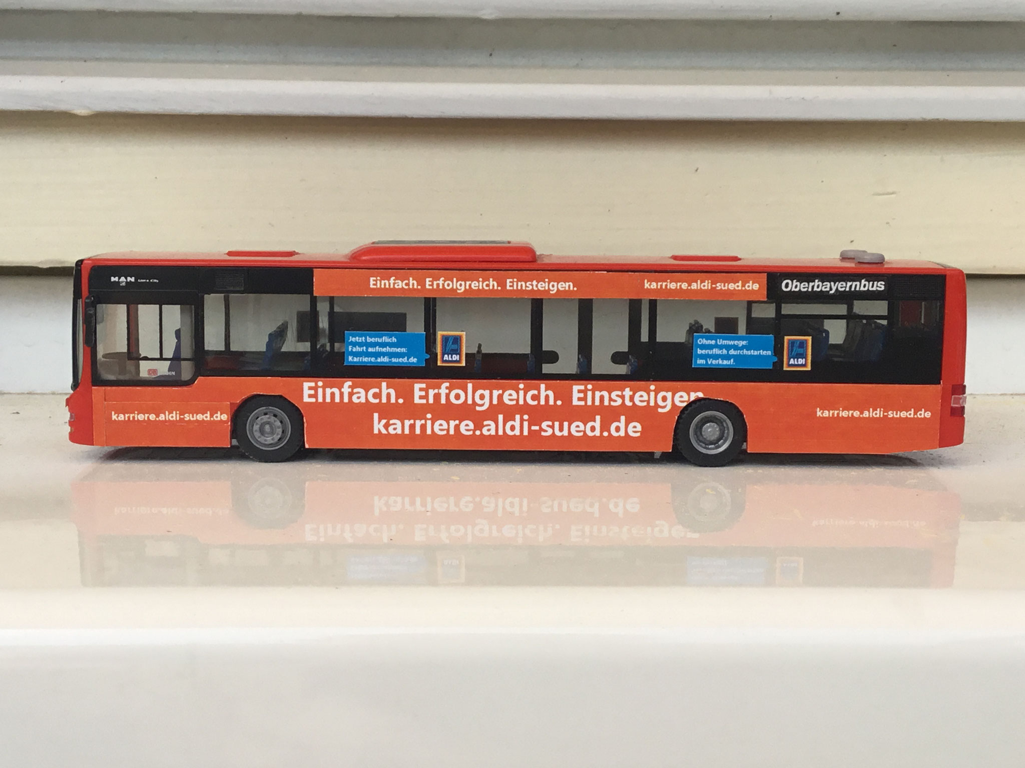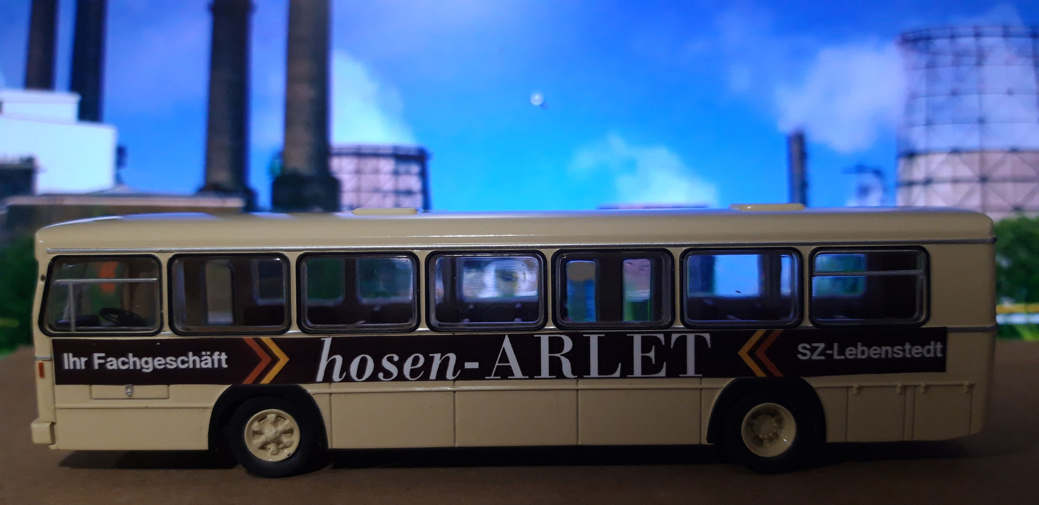 Von Herrn Wisotzki wurden diese Fotos eines MAN SÜ210 zur Verfügung gestellt. Werbung und Zielanzeiger stammen von RGModellbau, der Rest wurde vom Kunden besorgt. Basis das Modell von Herpa.