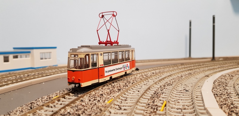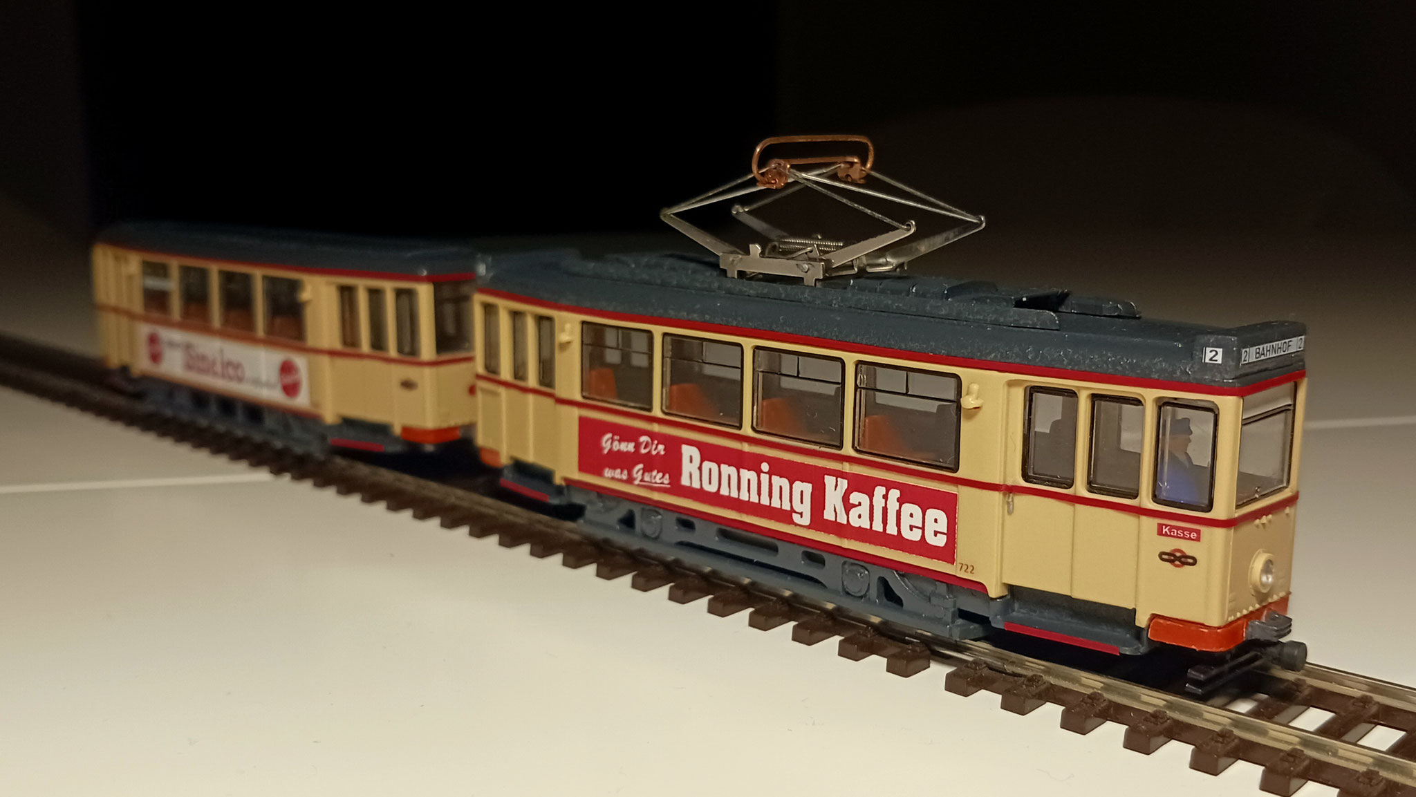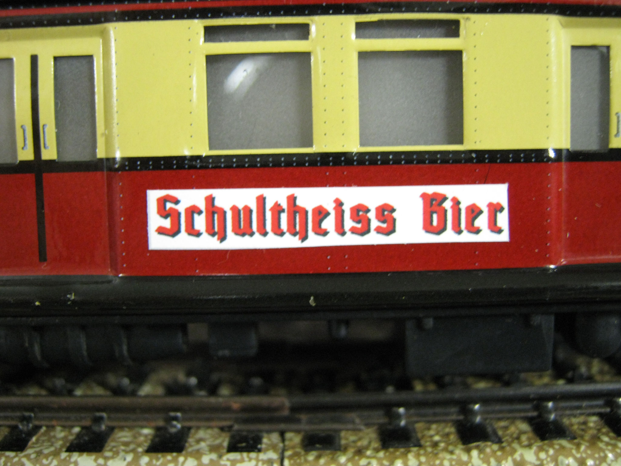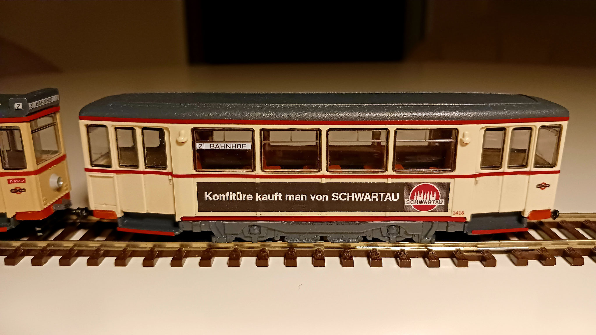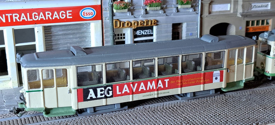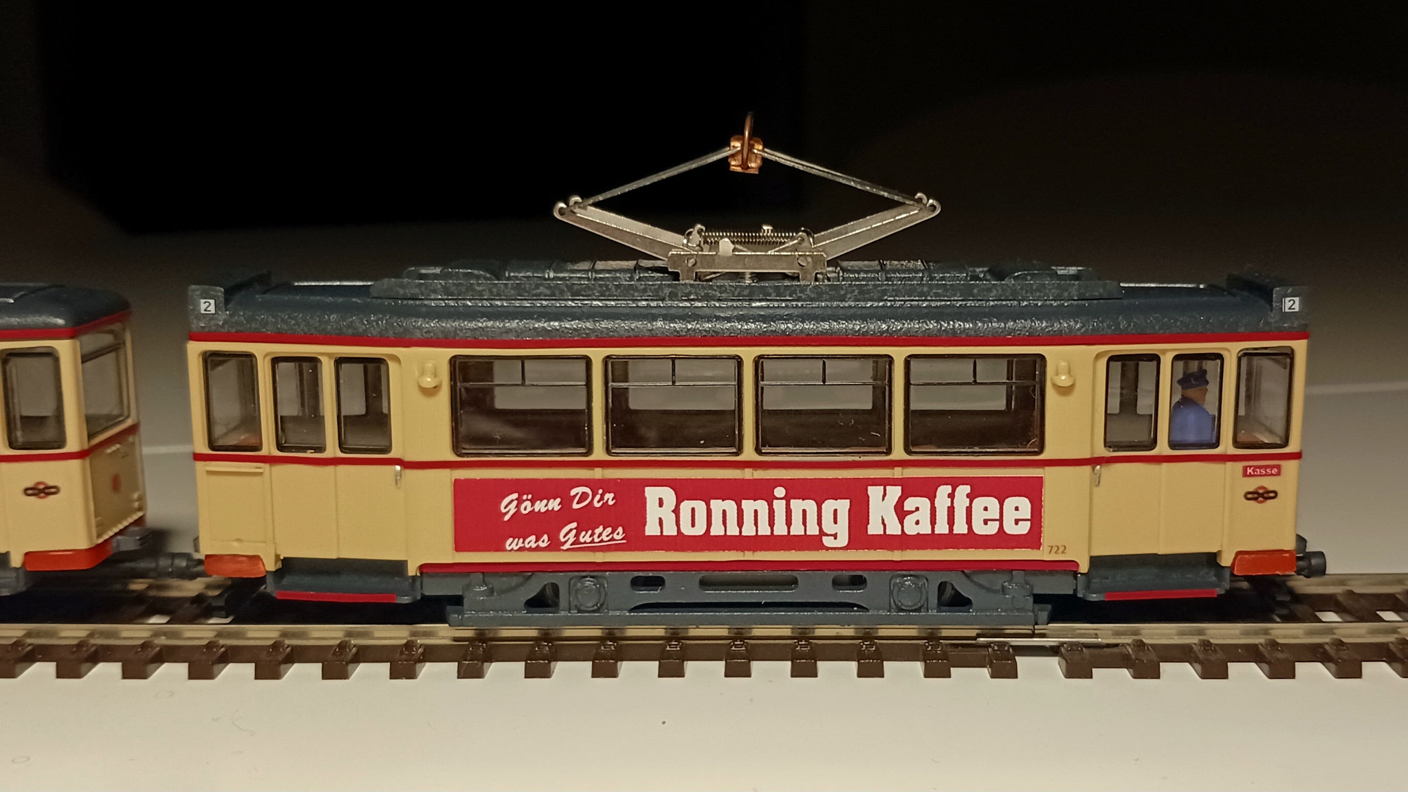 Jetzt ist der Wagen mit Laufwerk von pmt und Werbung und Beschriftung von RGModellbau doch noch fertig geworden, wobei man der heute nicht mehr ganz zeitgemäßen Verglasung das Alter der