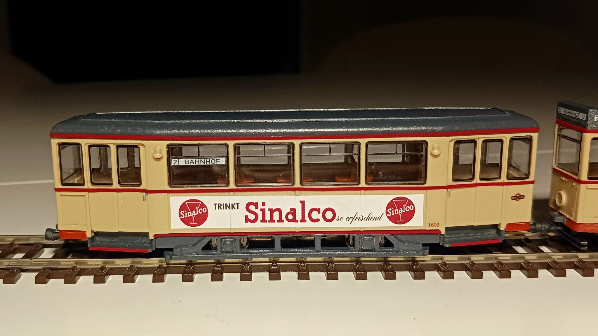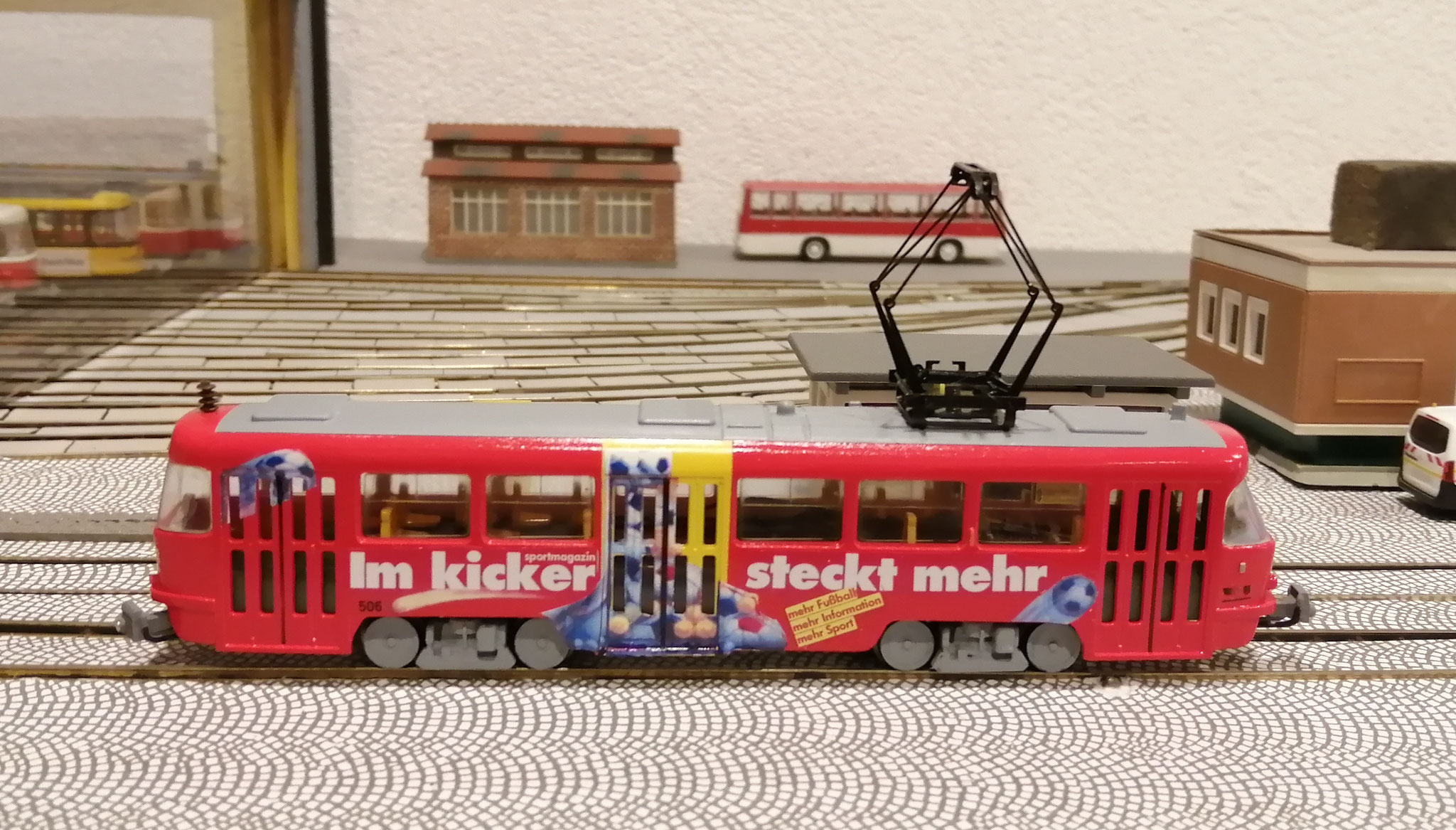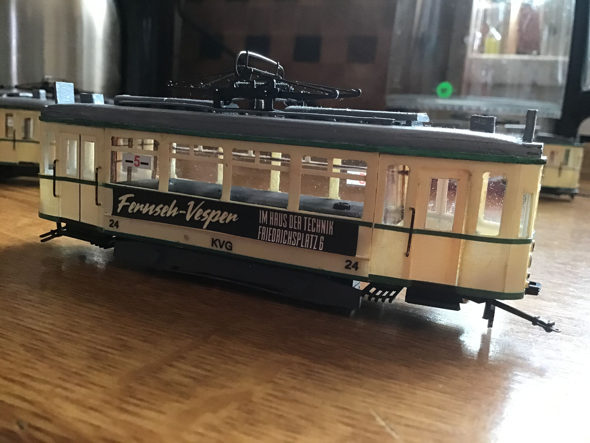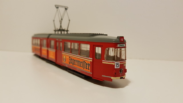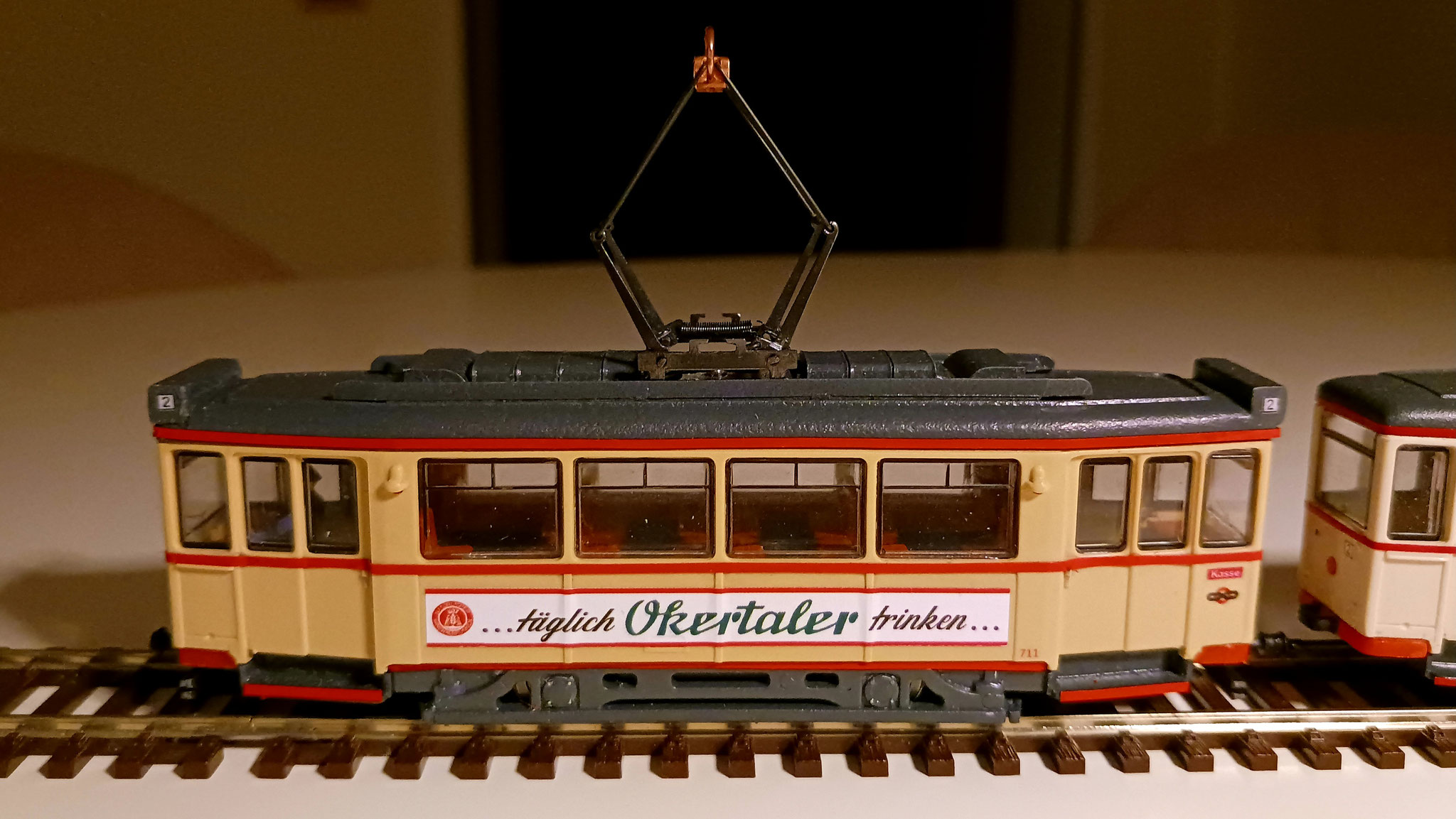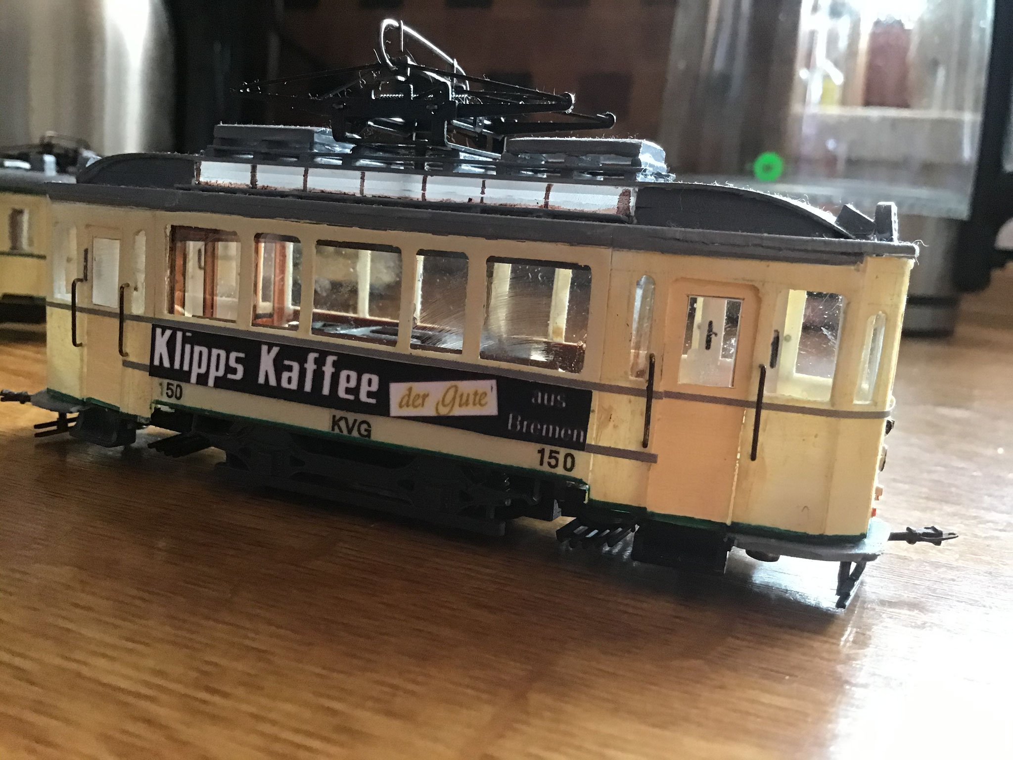 Jetzt ist der Wagen mit Laufwerk von pmt und Werbung und Beschriftung von RGModellbau doch noch fertig geworden, wobei man der heute nicht mehr ganz zeitgemäßen Verglasung das Alter der