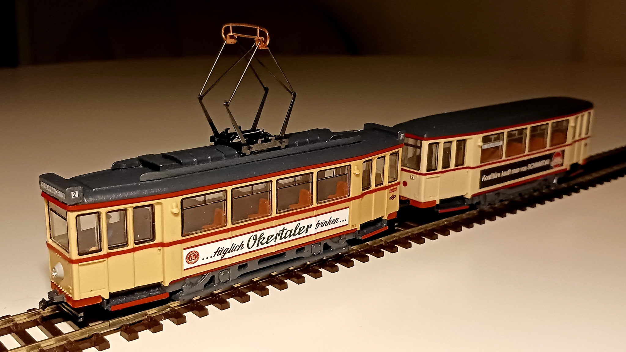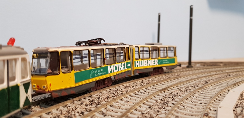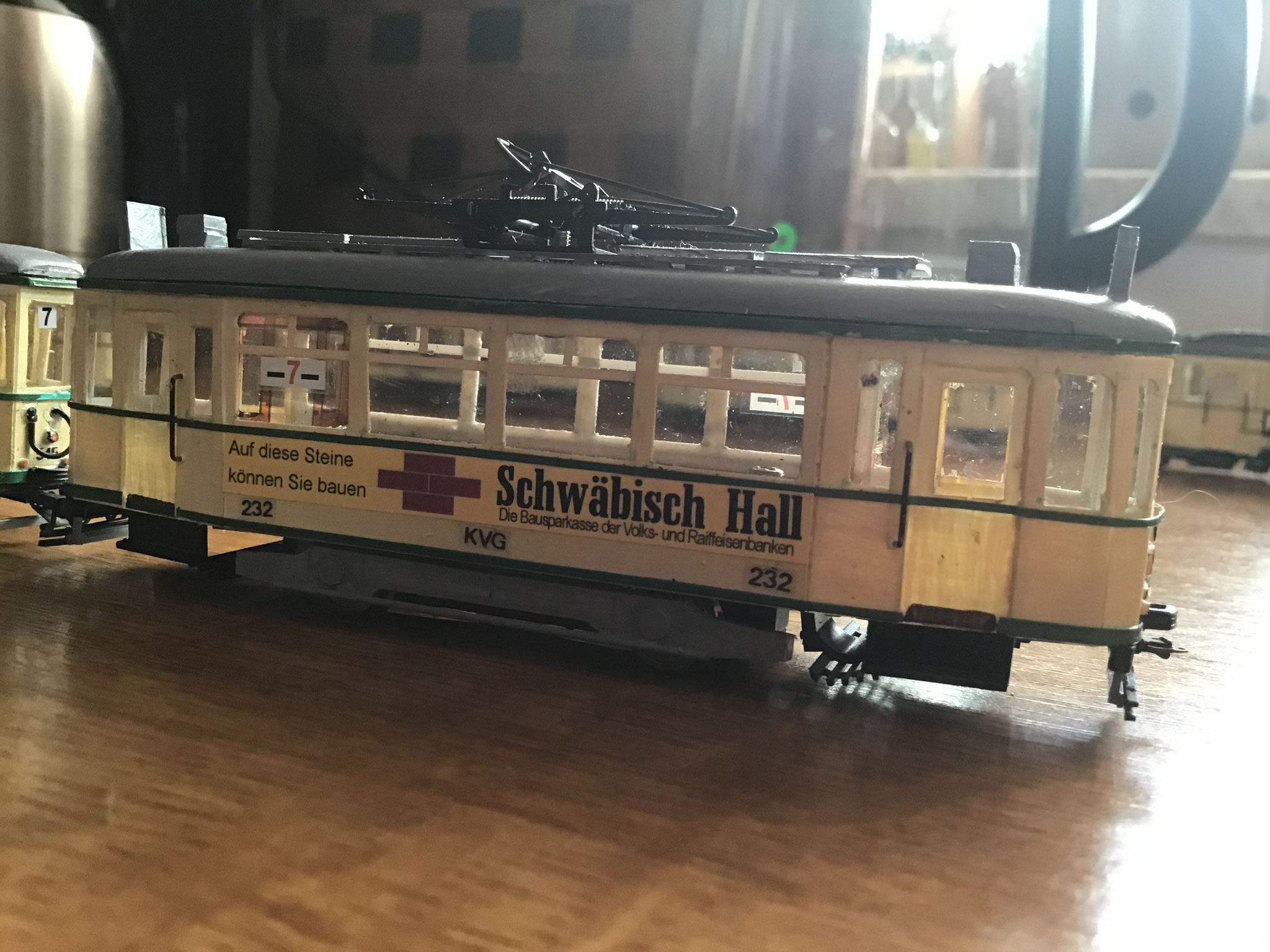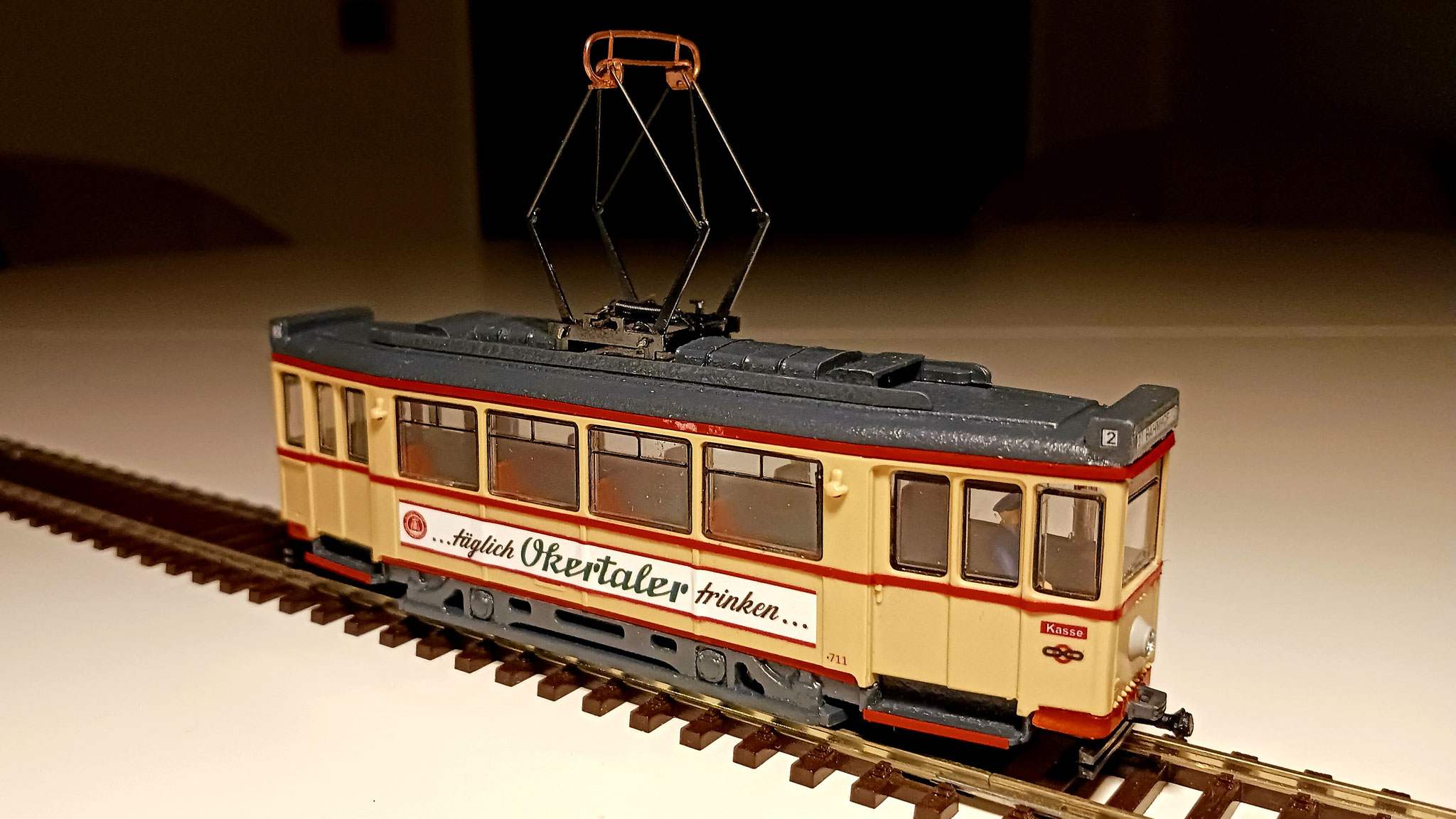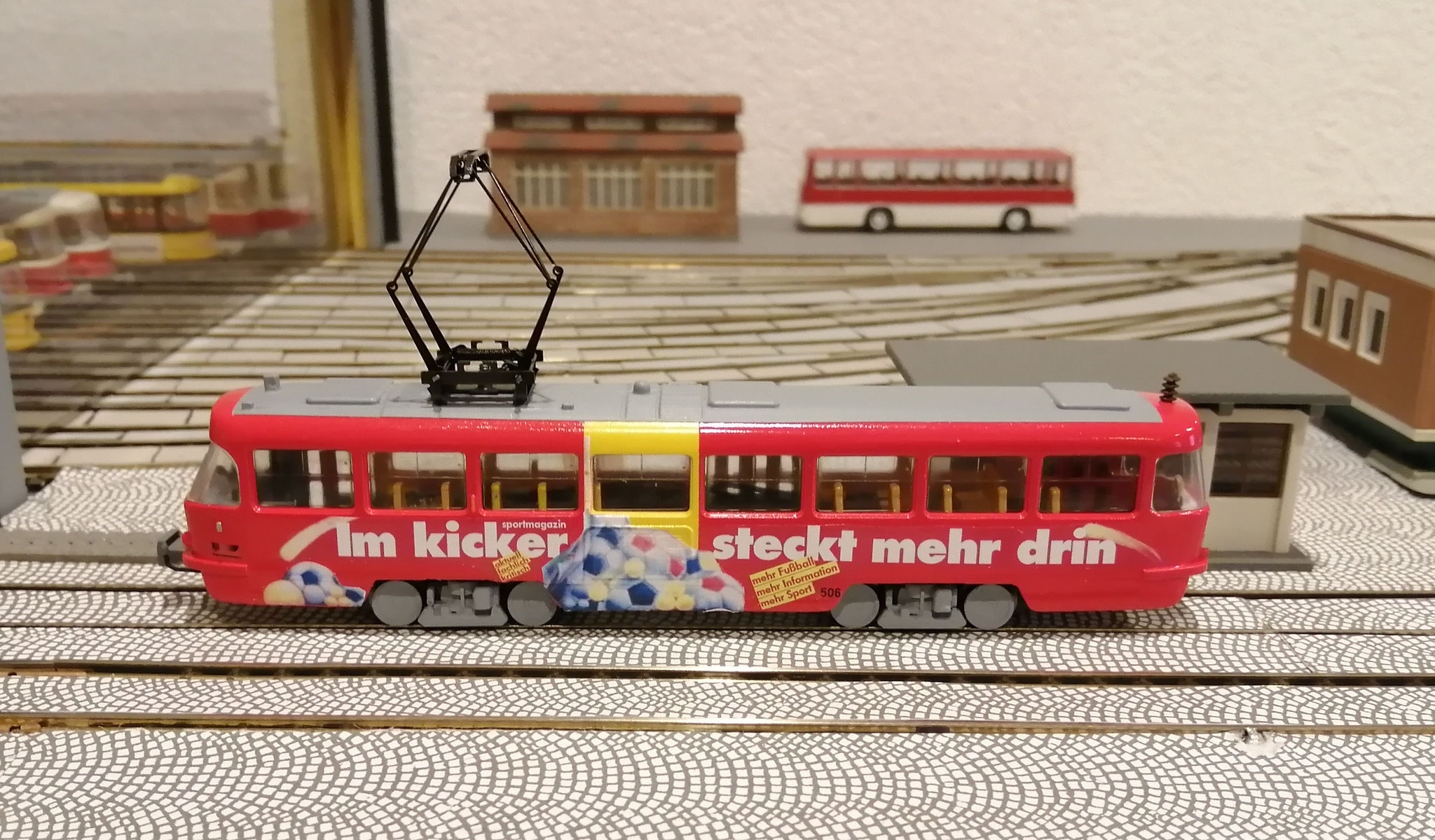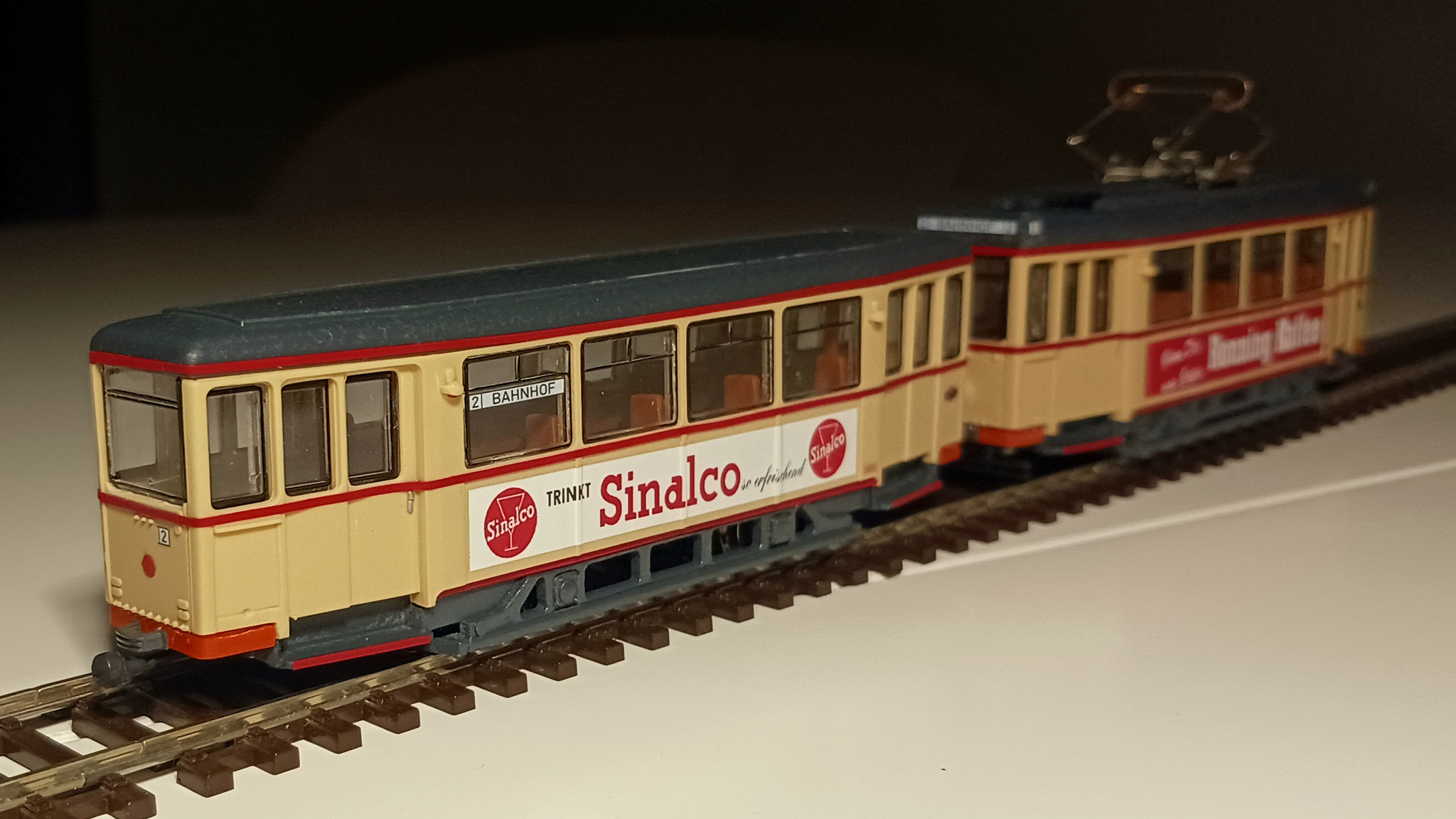 Jetzt ist der Wagen mit Laufwerk von pmt und Werbung und Beschriftung von RGModellbau doch noch fertig geworden, wobei man der heute nicht mehr ganz zeitgemäßen Verglasung das Alter der