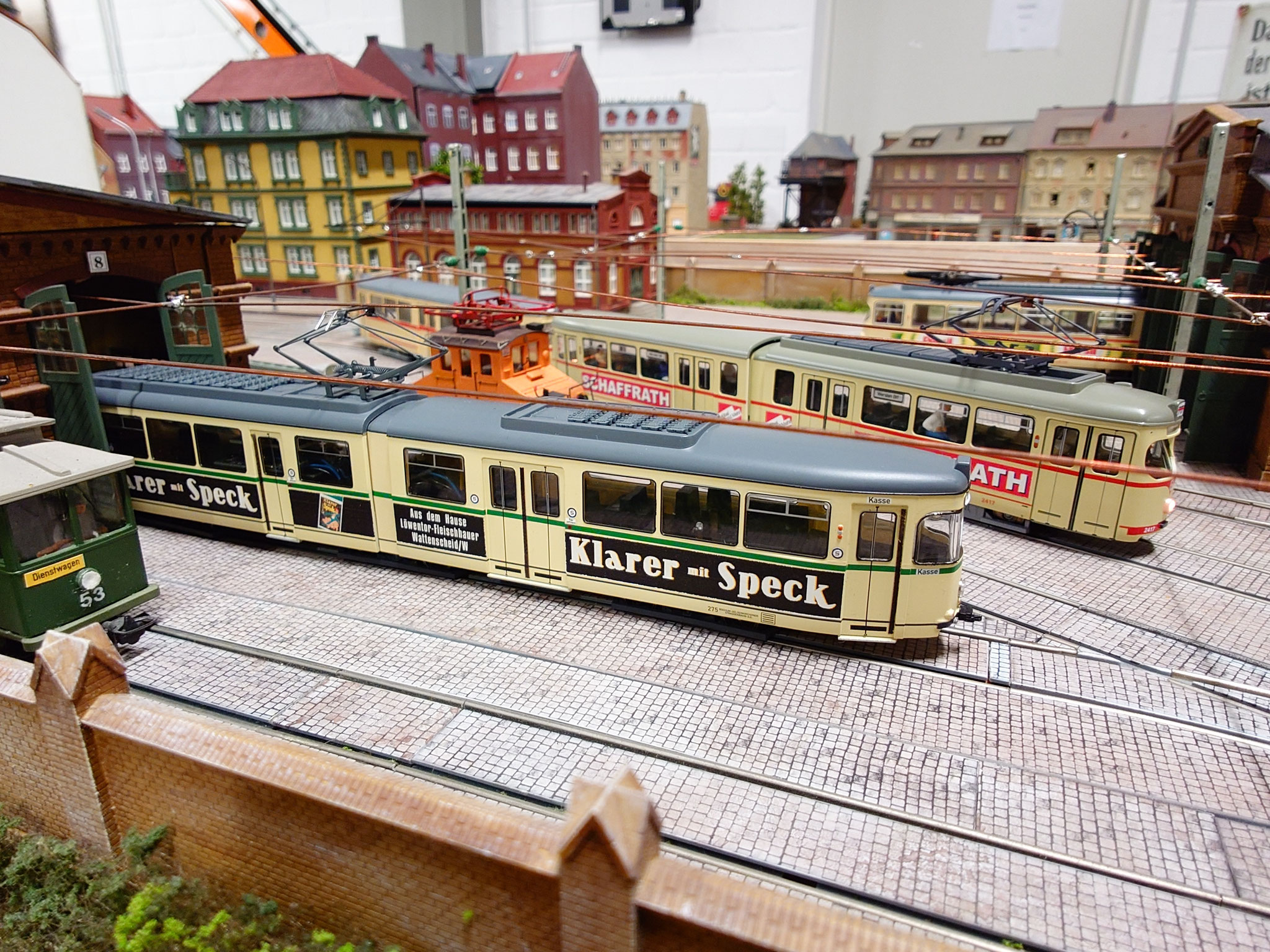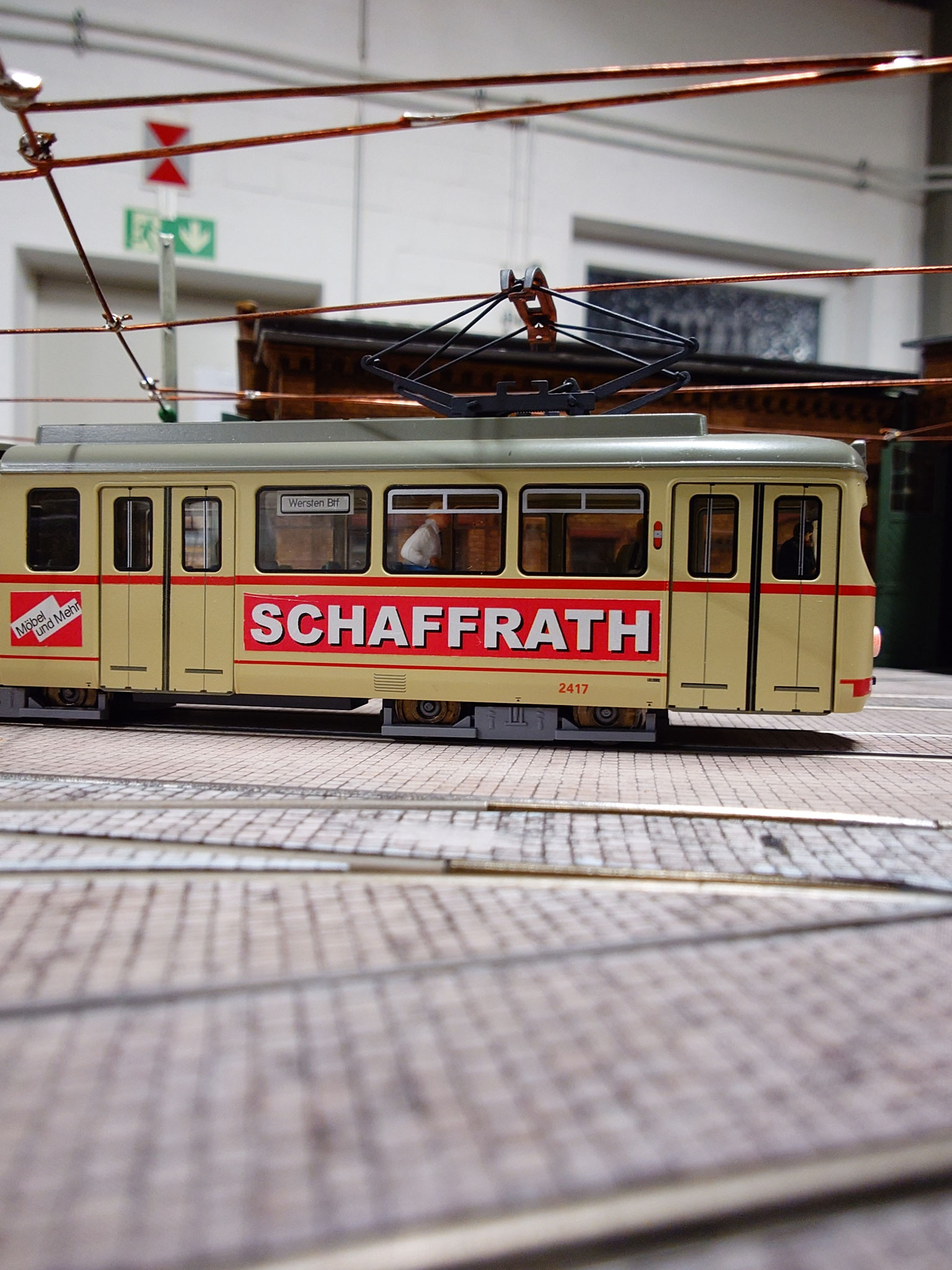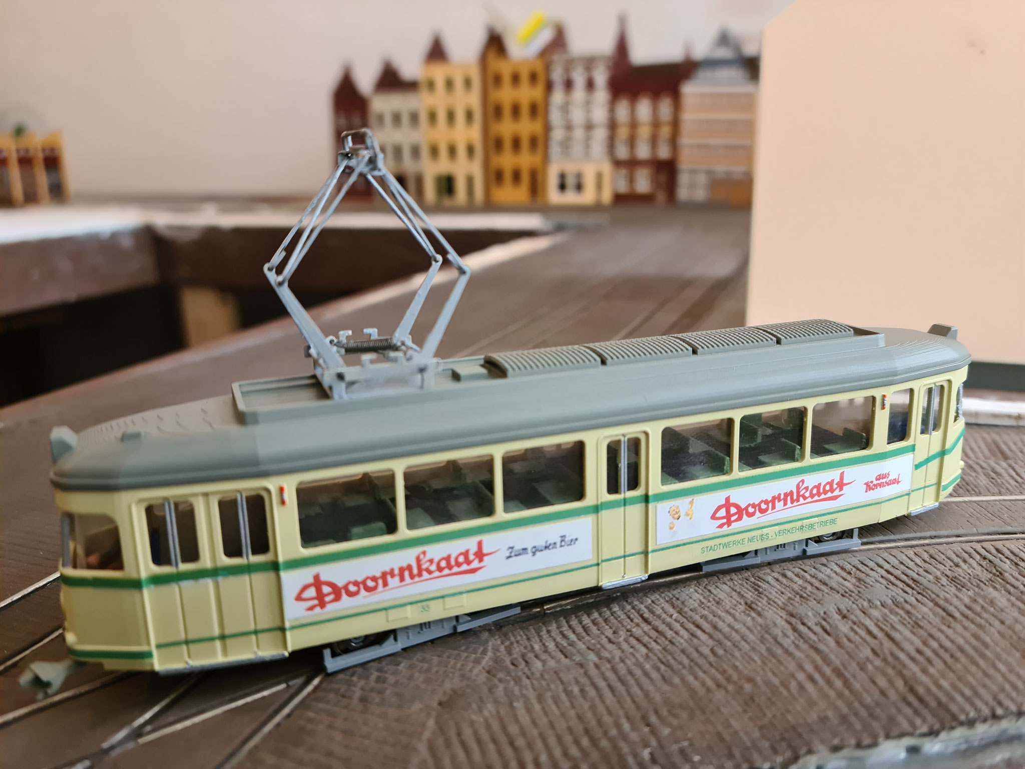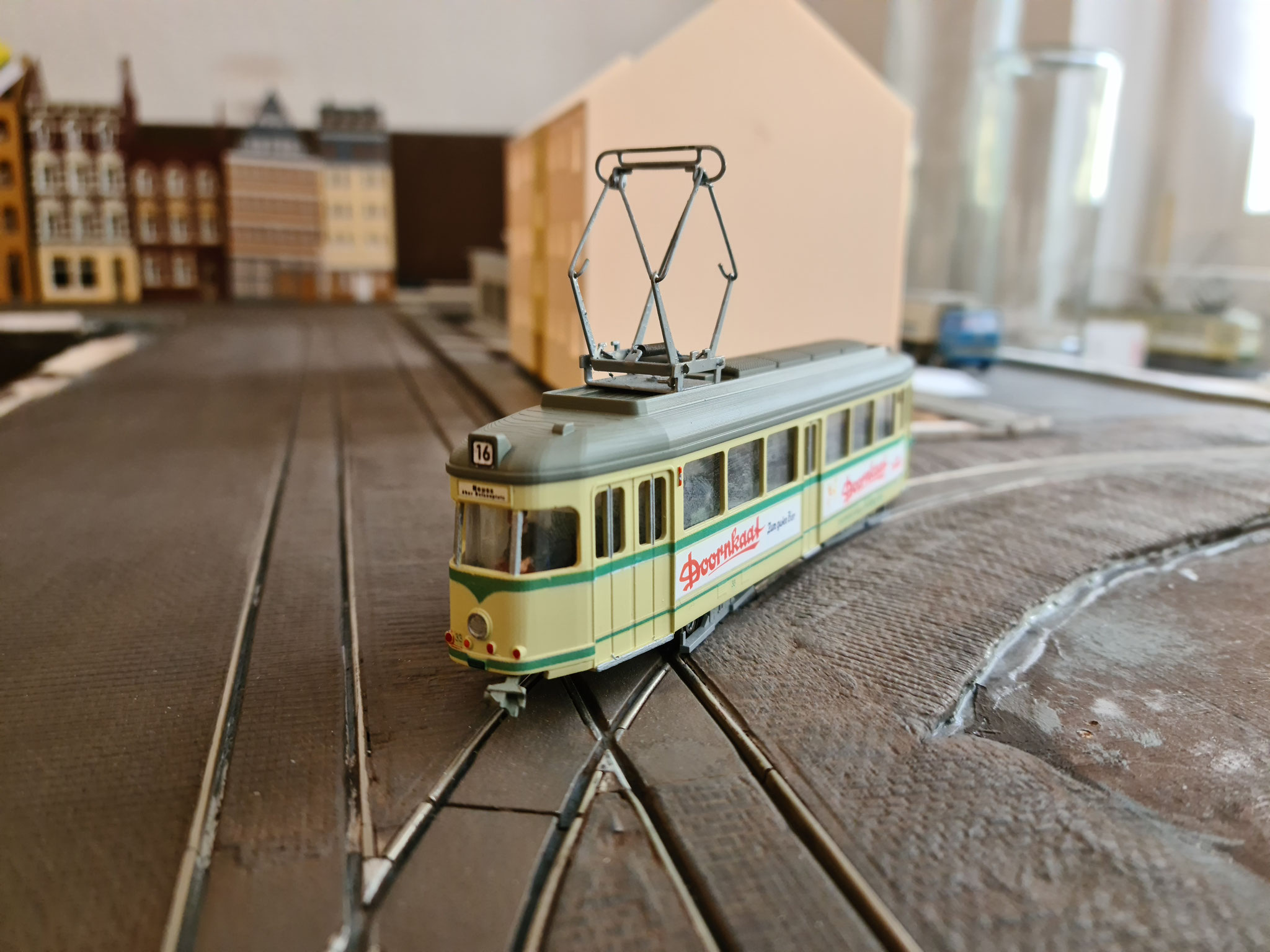 Zu sehen sind hier Triebwagen von Herrn Görsch. Die Tw haben beide die vorbildgerechte Werbung die sie einmal trugen. Der Rheinbahn Triebwagen zusätzlich Zielschilder aus meiner Fertigung.
