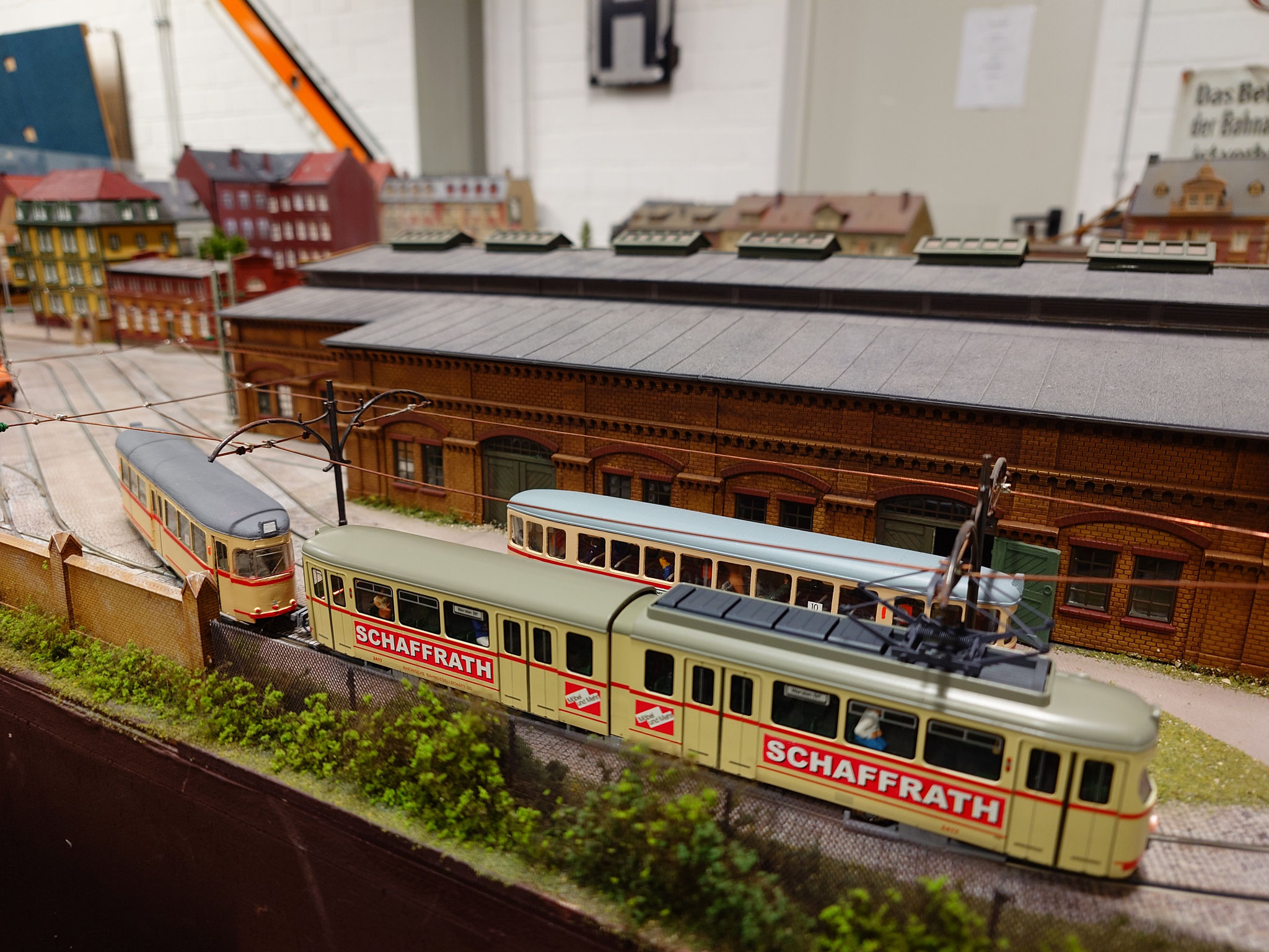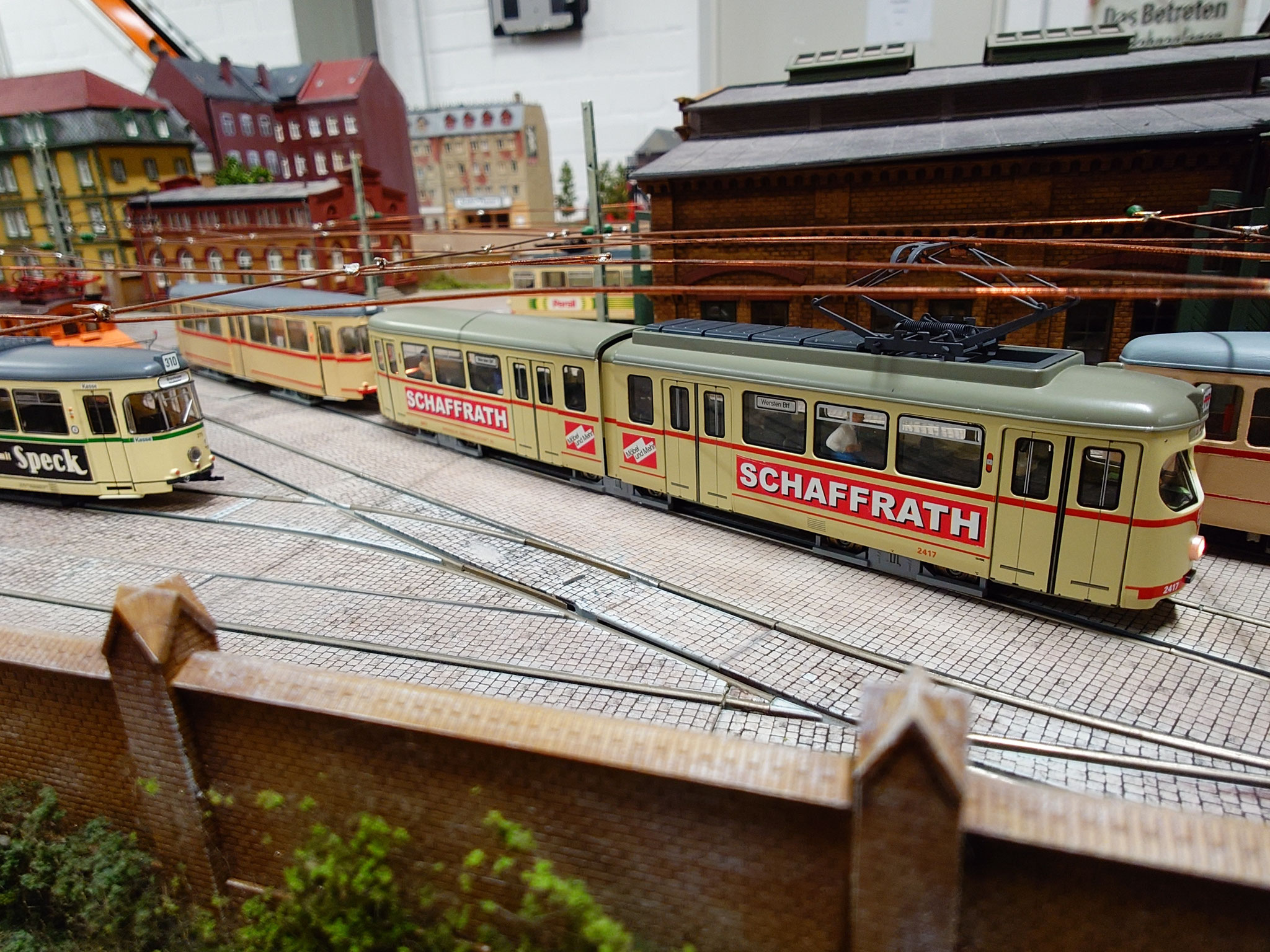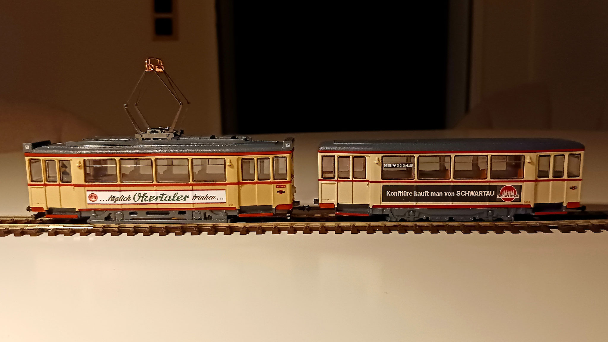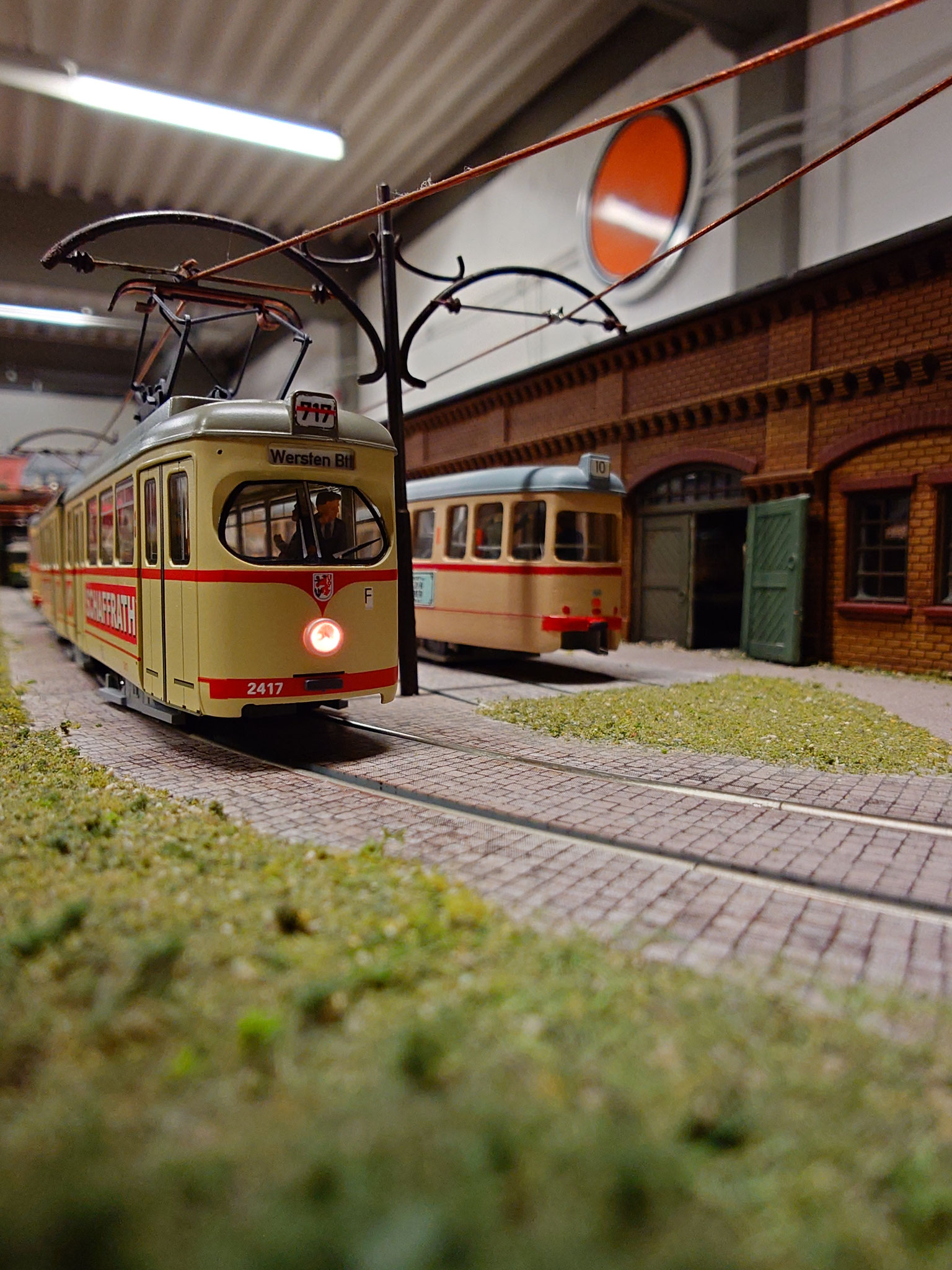 Zu sehen sind hier Triebwagen von Herrn Görsch. Die Tw haben beide die vorbildgerechte Werbung die sie einmal trugen. Der Rheinbahn Triebwagen zusätzlich Zielschilder aus meiner Fertigung.