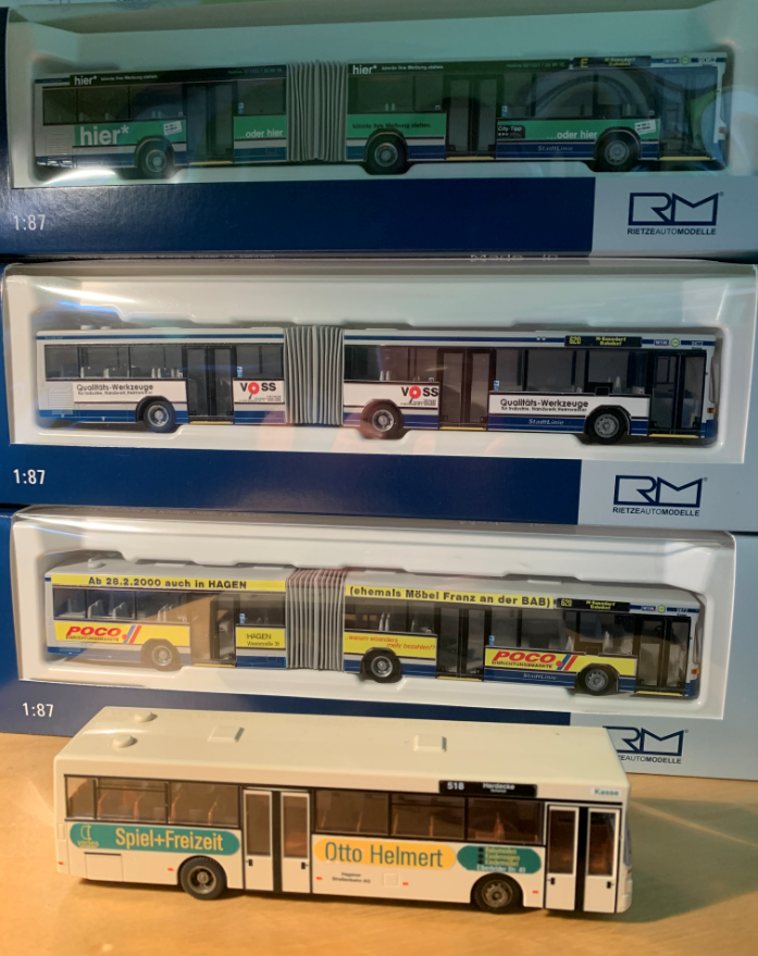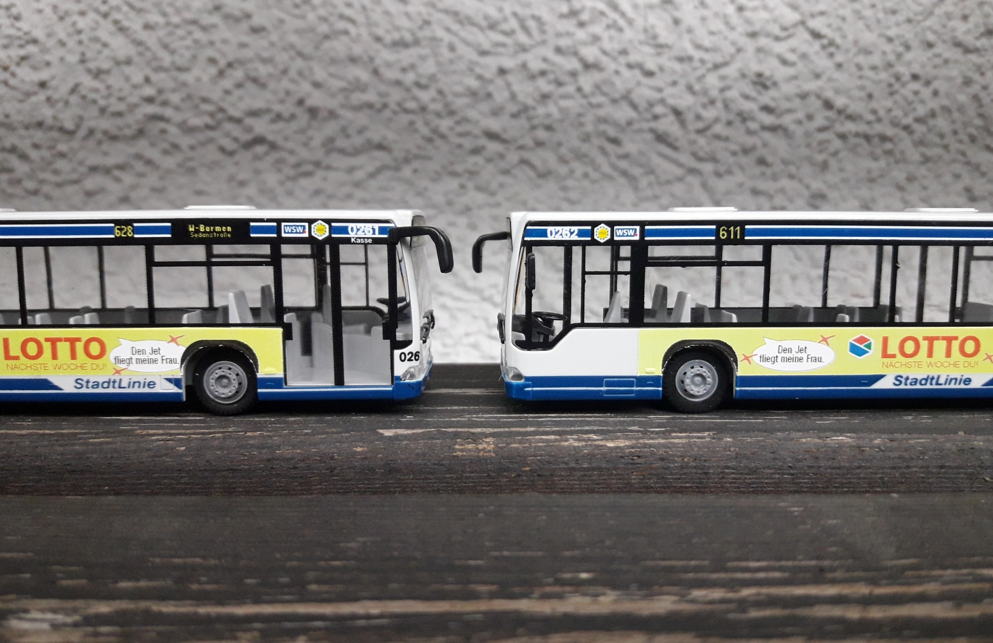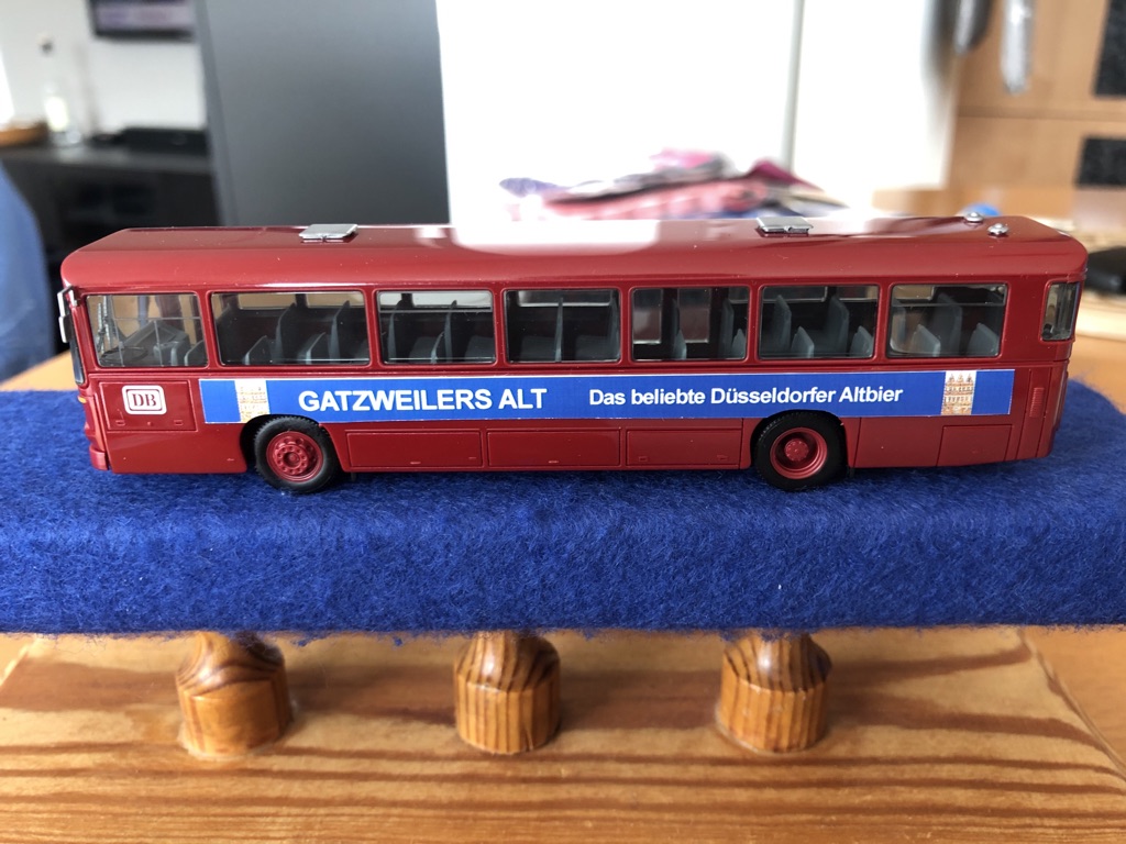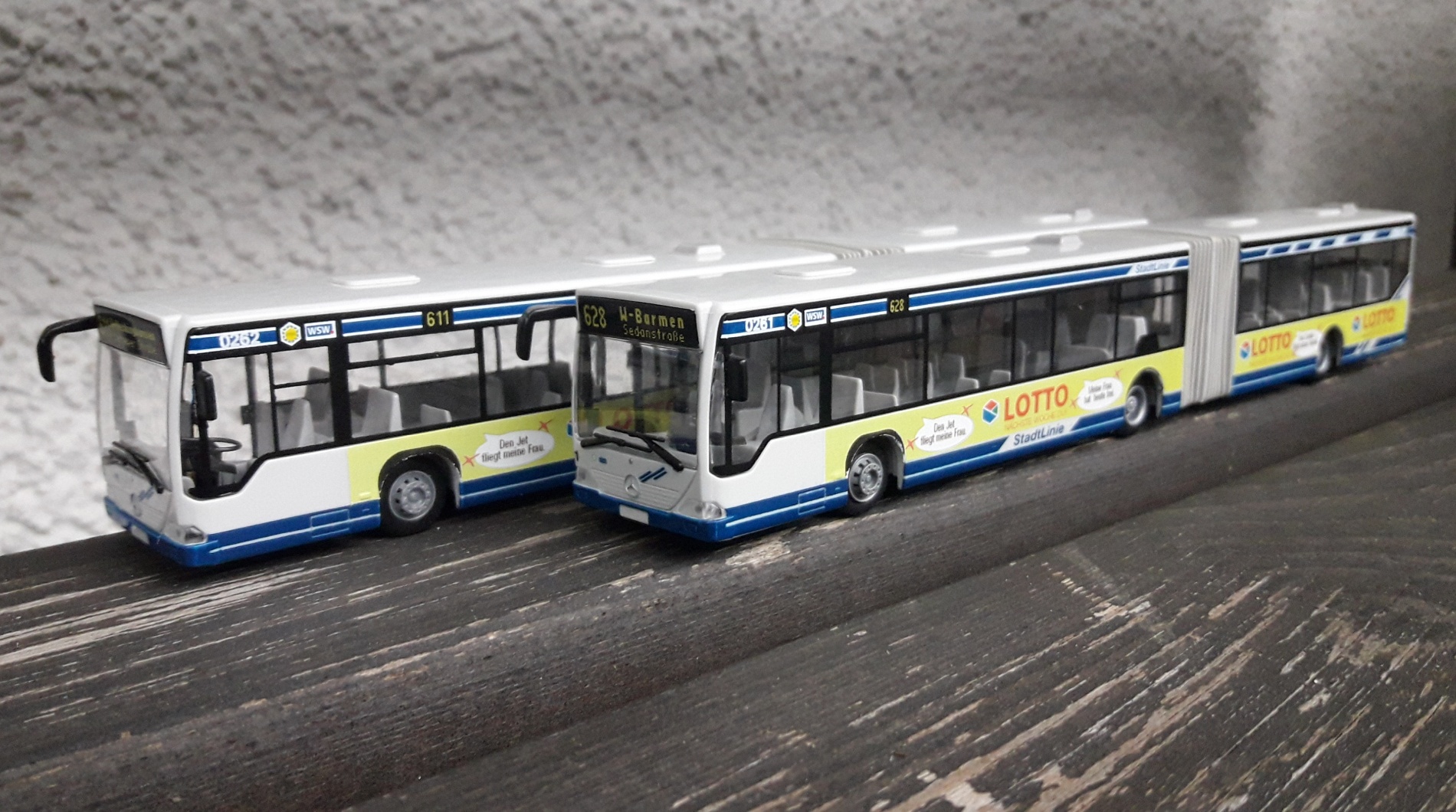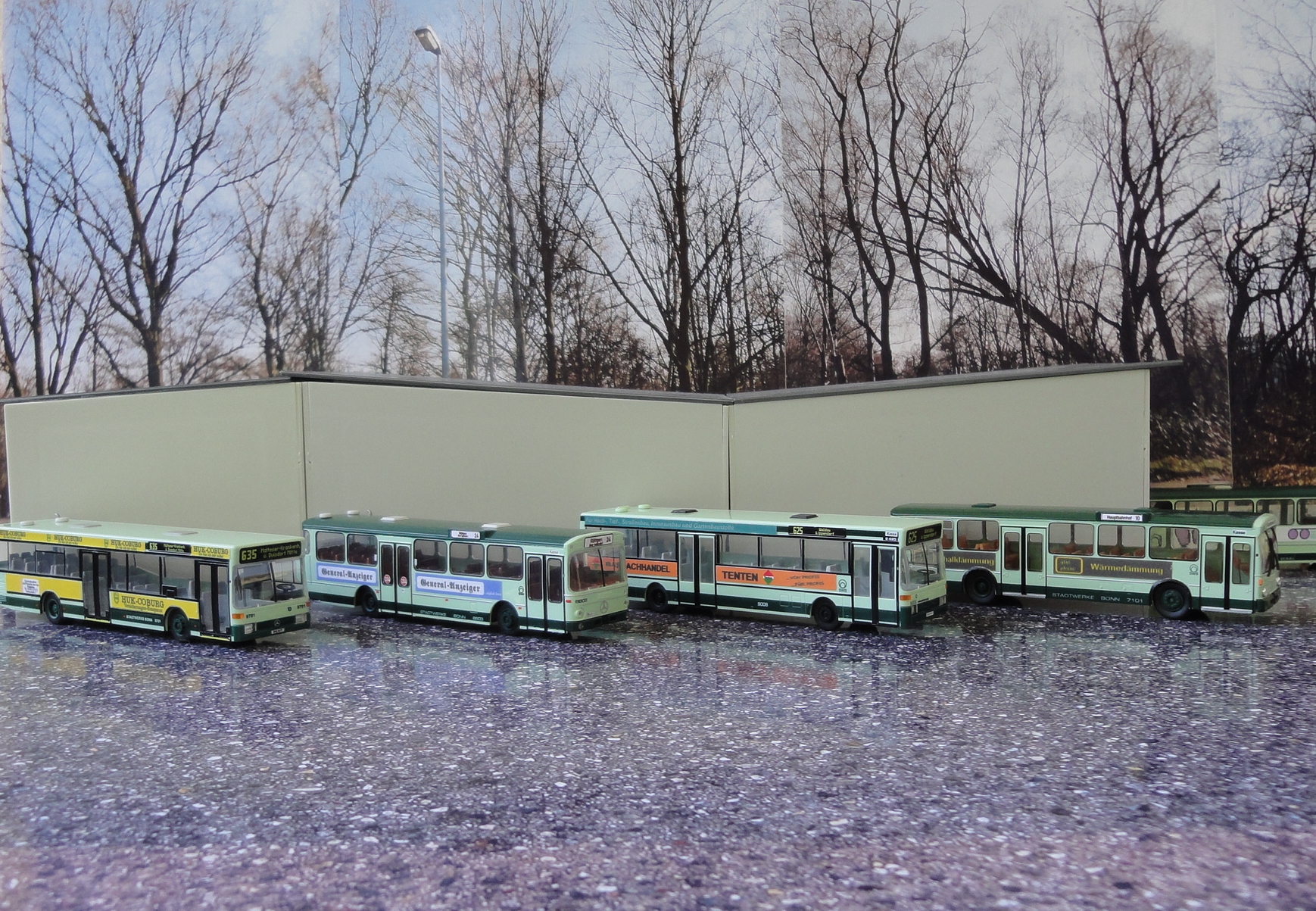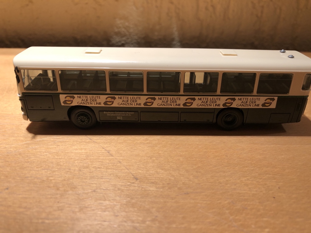 Im Maßstab 1:43 entstanden bei Herrn Steingroever zwei MB O305 nach Essener und Wuppertaler Vorbild auf Basis des IXO Modell. Werbung , Beschriftung und Kennzeichen entstanden bei RGModellbau.