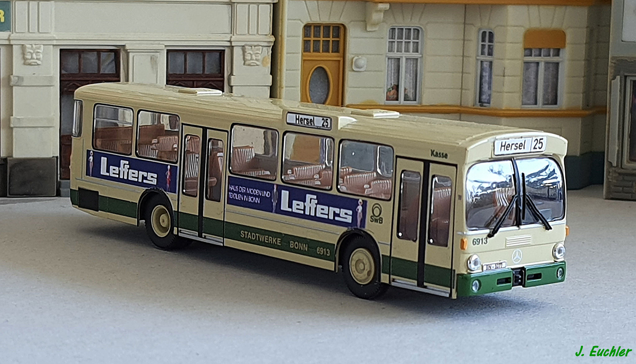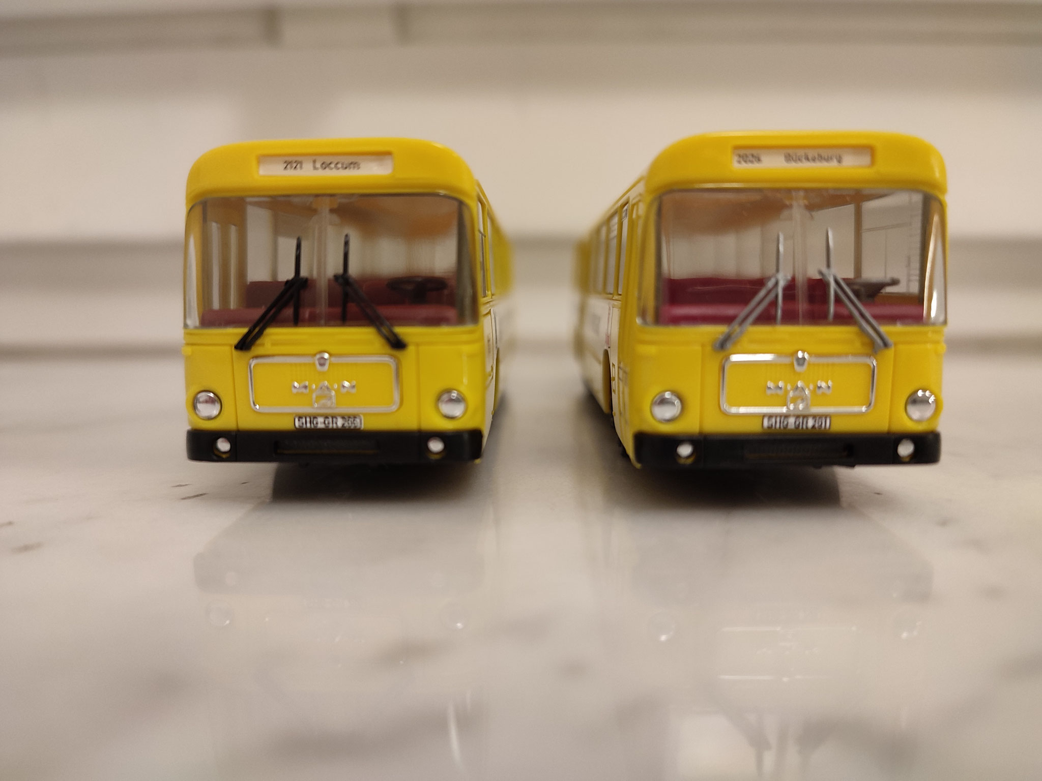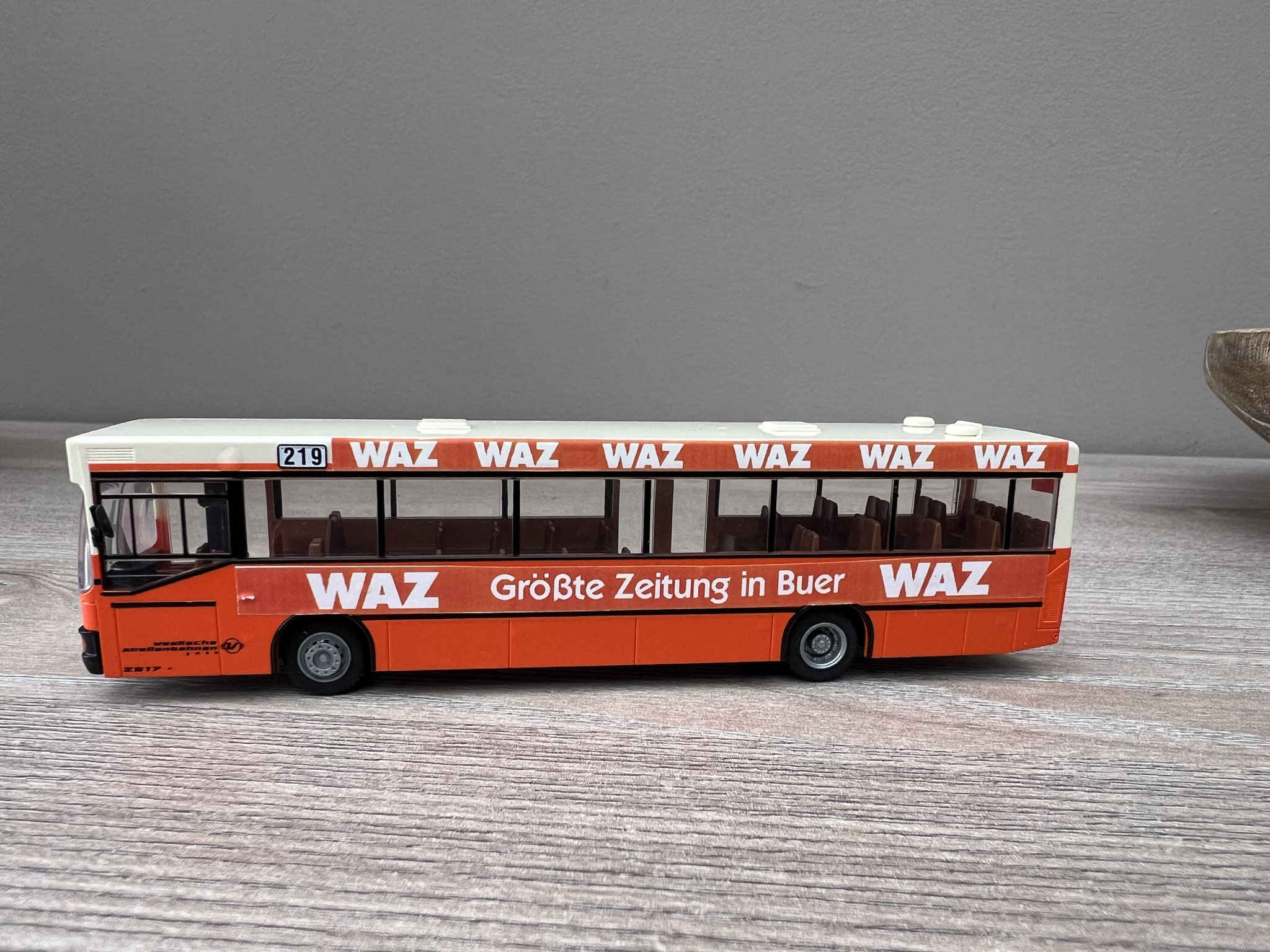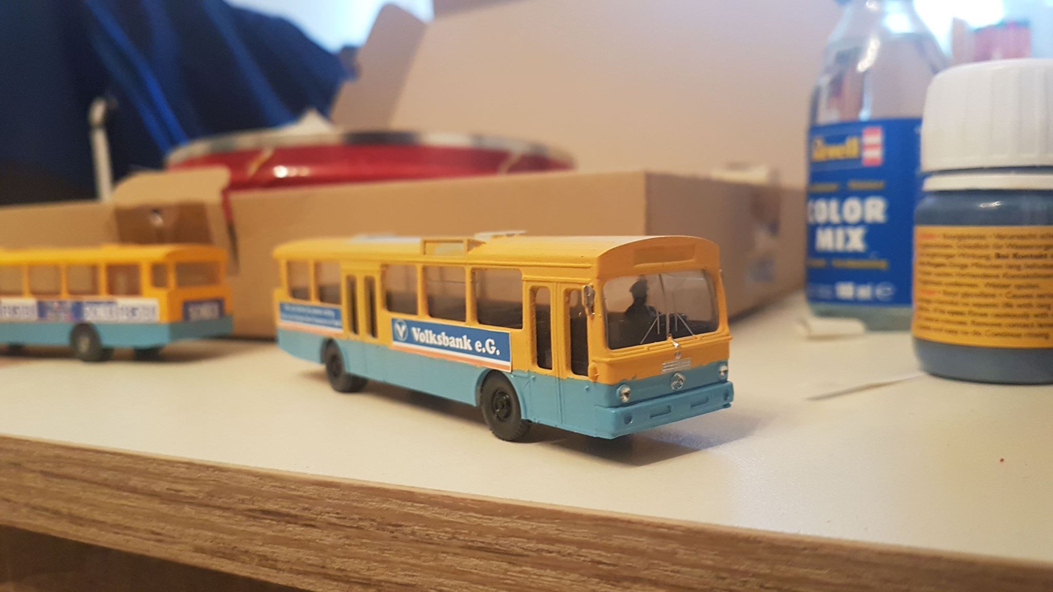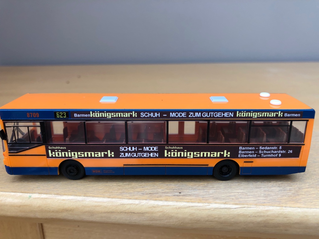Im Maßstab 1:43 entstanden bei Herrn Steingroever zwei MB O305 nach Essener und Wuppertaler Vorbild auf Basis des IXO Modell. Werbung , Beschriftung und Kennzeichen entstanden bei RGModellbau.