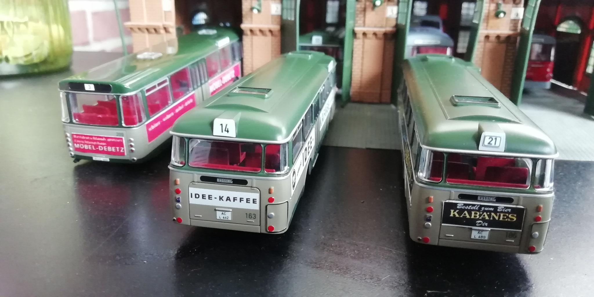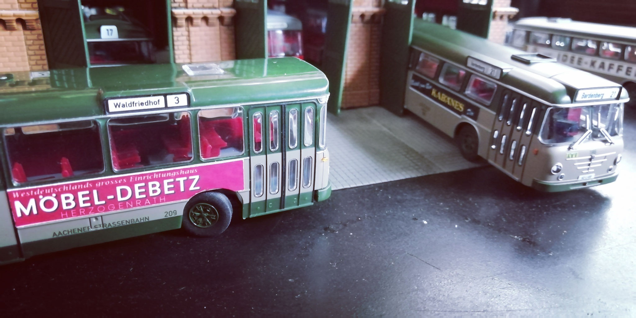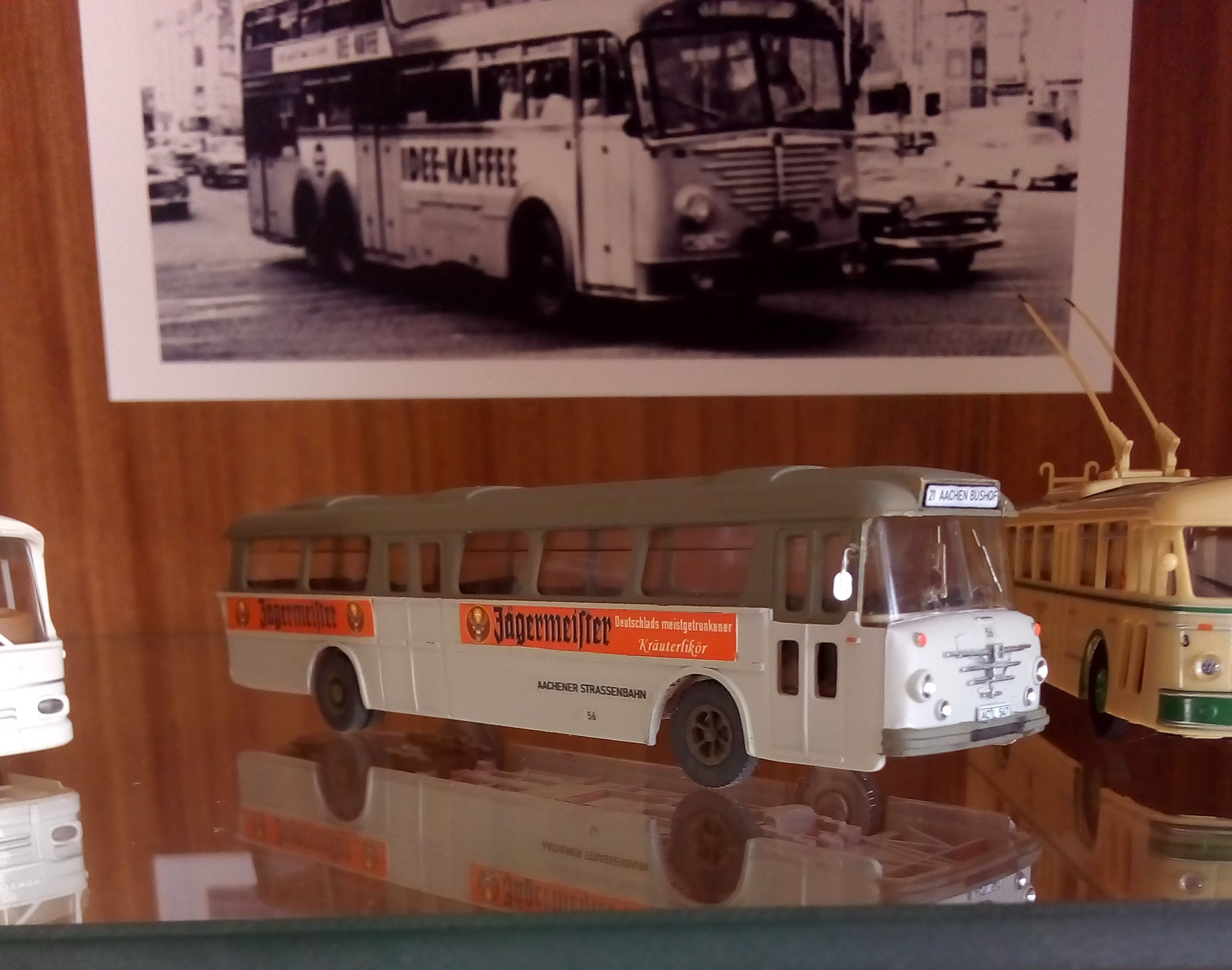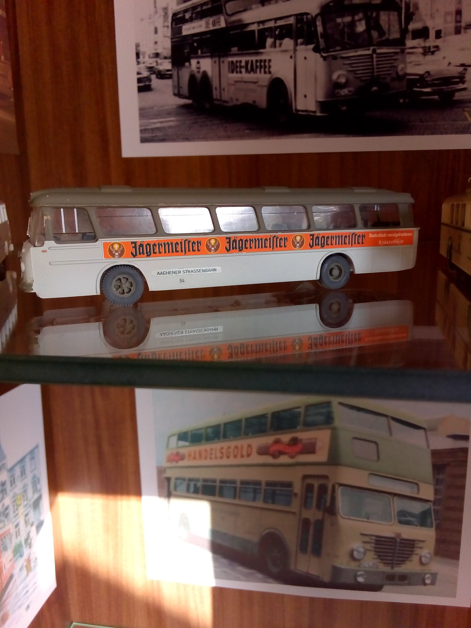 Auf Basis des Büssing Senator von Wiking erstellte Herr Mertens den Wagen der Aachener Straßenbahn mit passender Werbung. Hier ein Büssing Senator (Wiking) sowie einen Büssing Ludewig Aero 1 1/2 Decker.