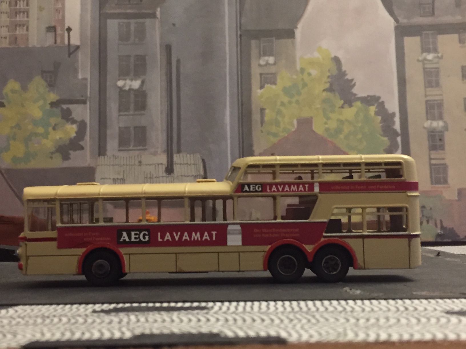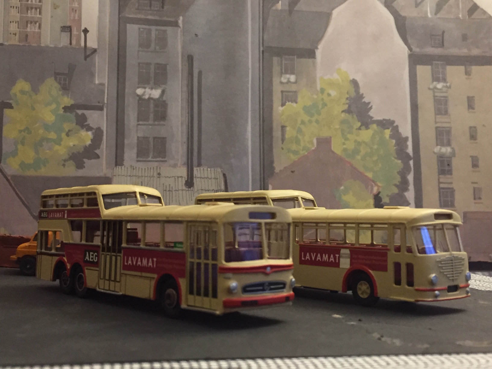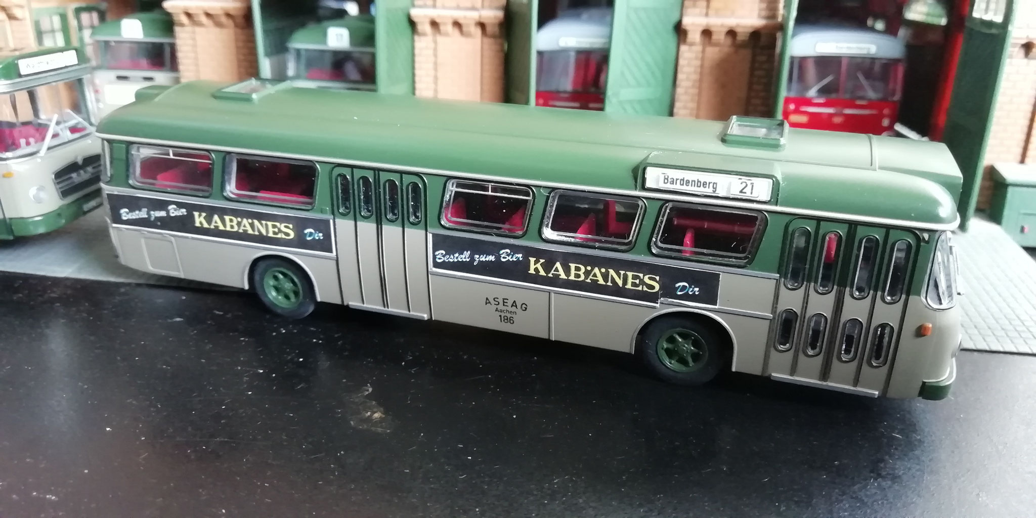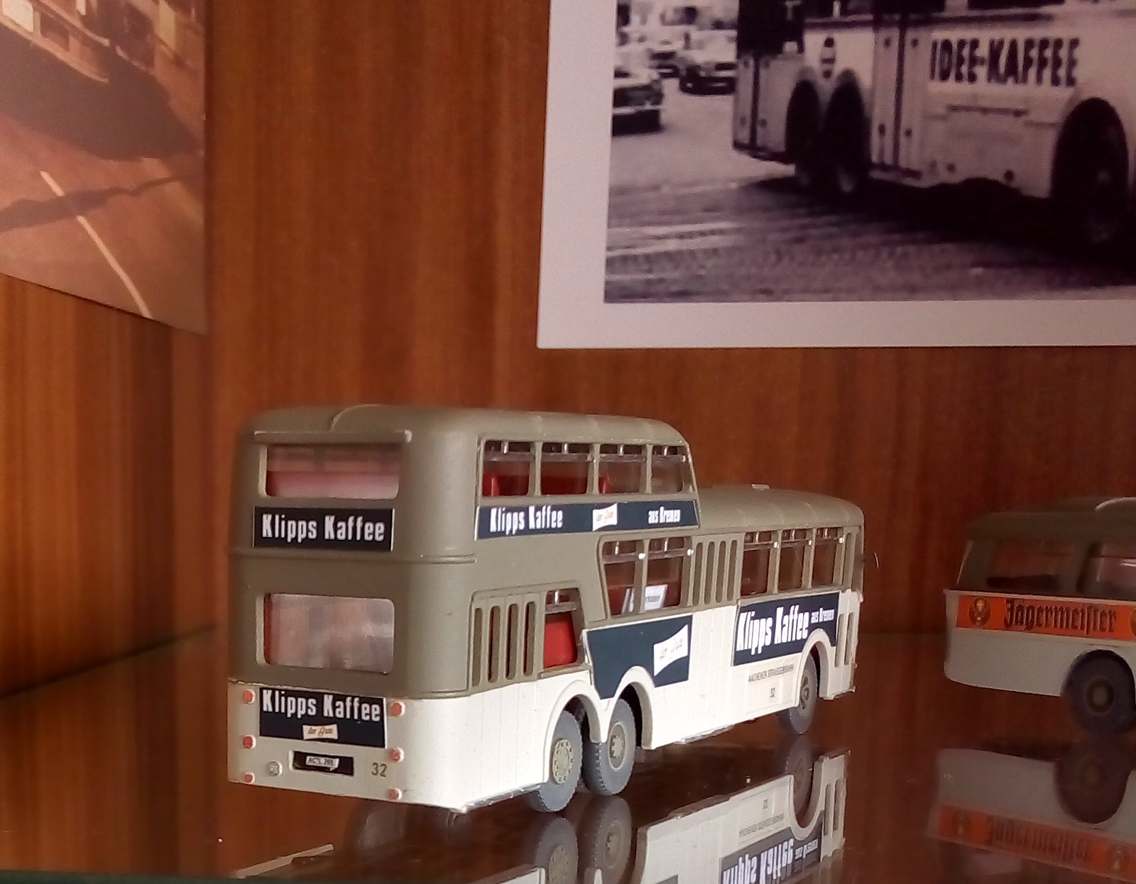 Auf Basis des Büssing Senator von Wiking erstellte Herr Mertens den Wagen der Aachener Straßenbahn mit passender Werbung. Hier ein Büssing Senator (Wiking) sowie einen Büssing Ludewig Aero 1 1/2 Decker.