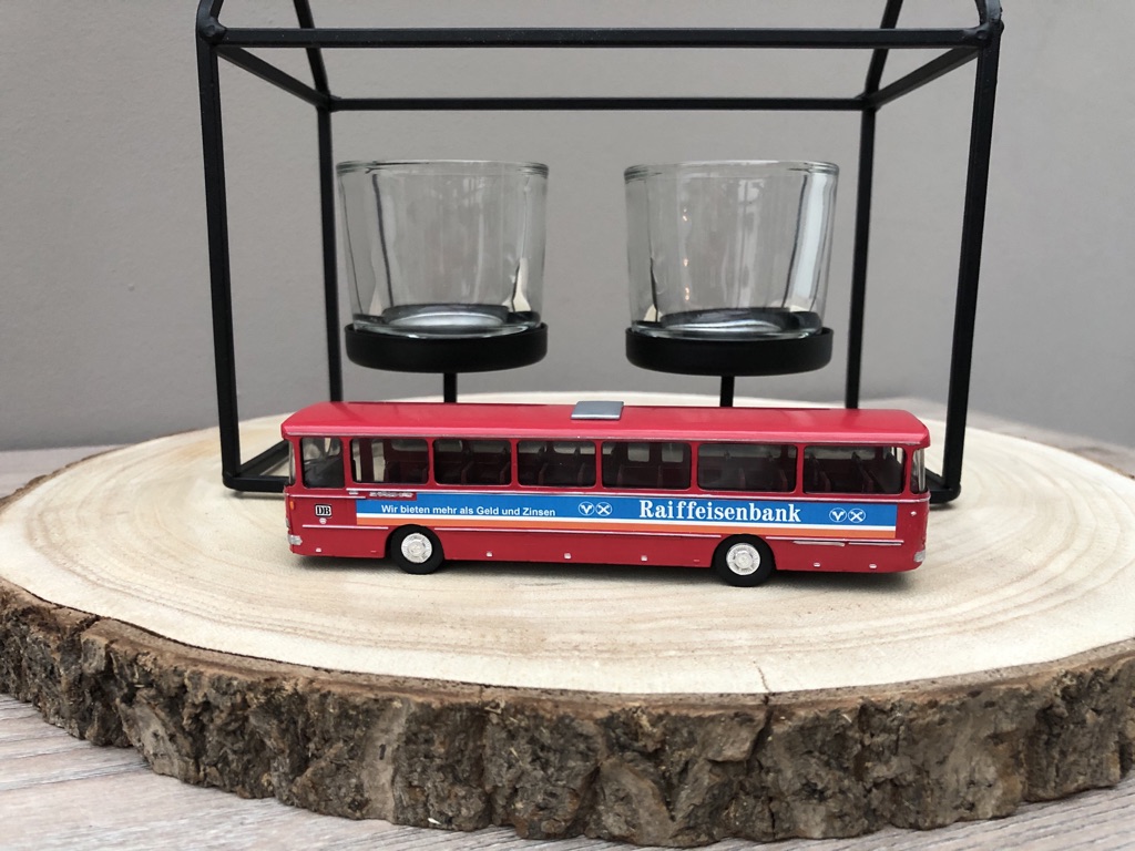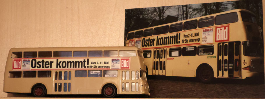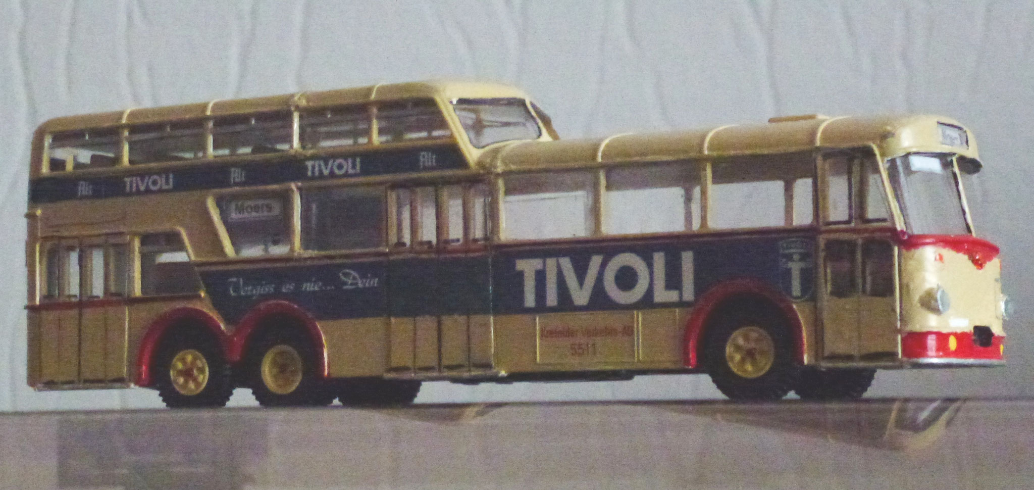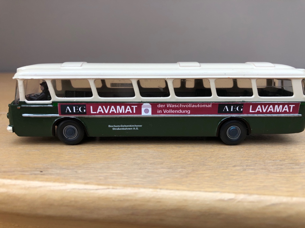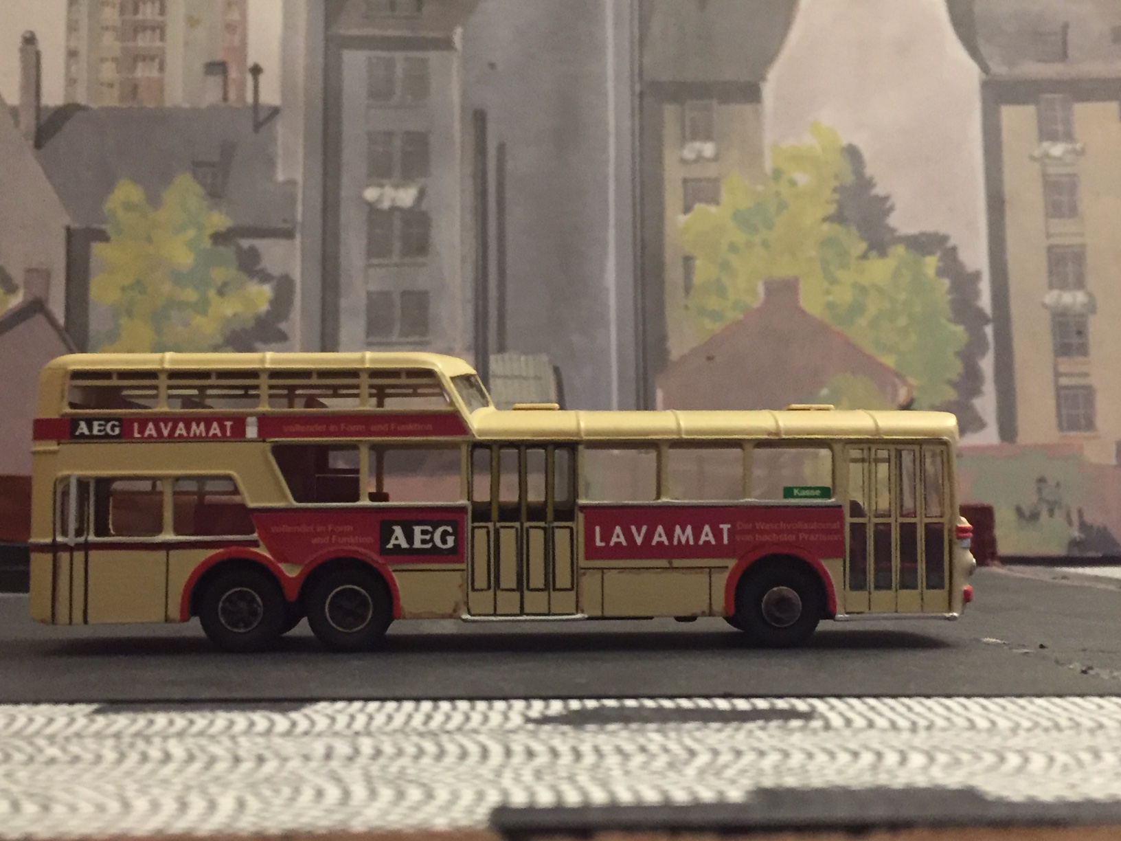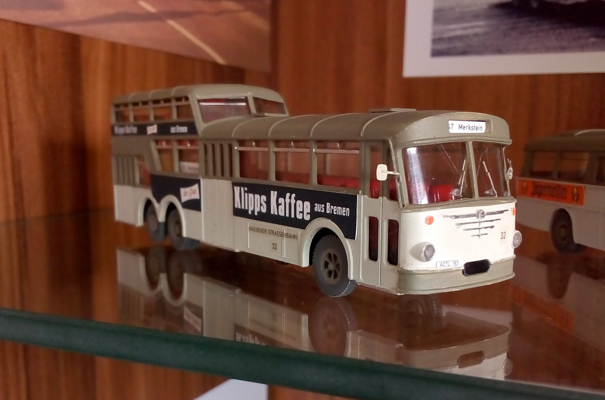 Auf Basis des Büssing Senator von Wiking erstellte Herr Mertens den Wagen der Aachener Straßenbahn mit passender Werbung. Hier ein Büssing Senator (Wiking) sowie einen Büssing Ludewig Aero 1 1/2 Decker.