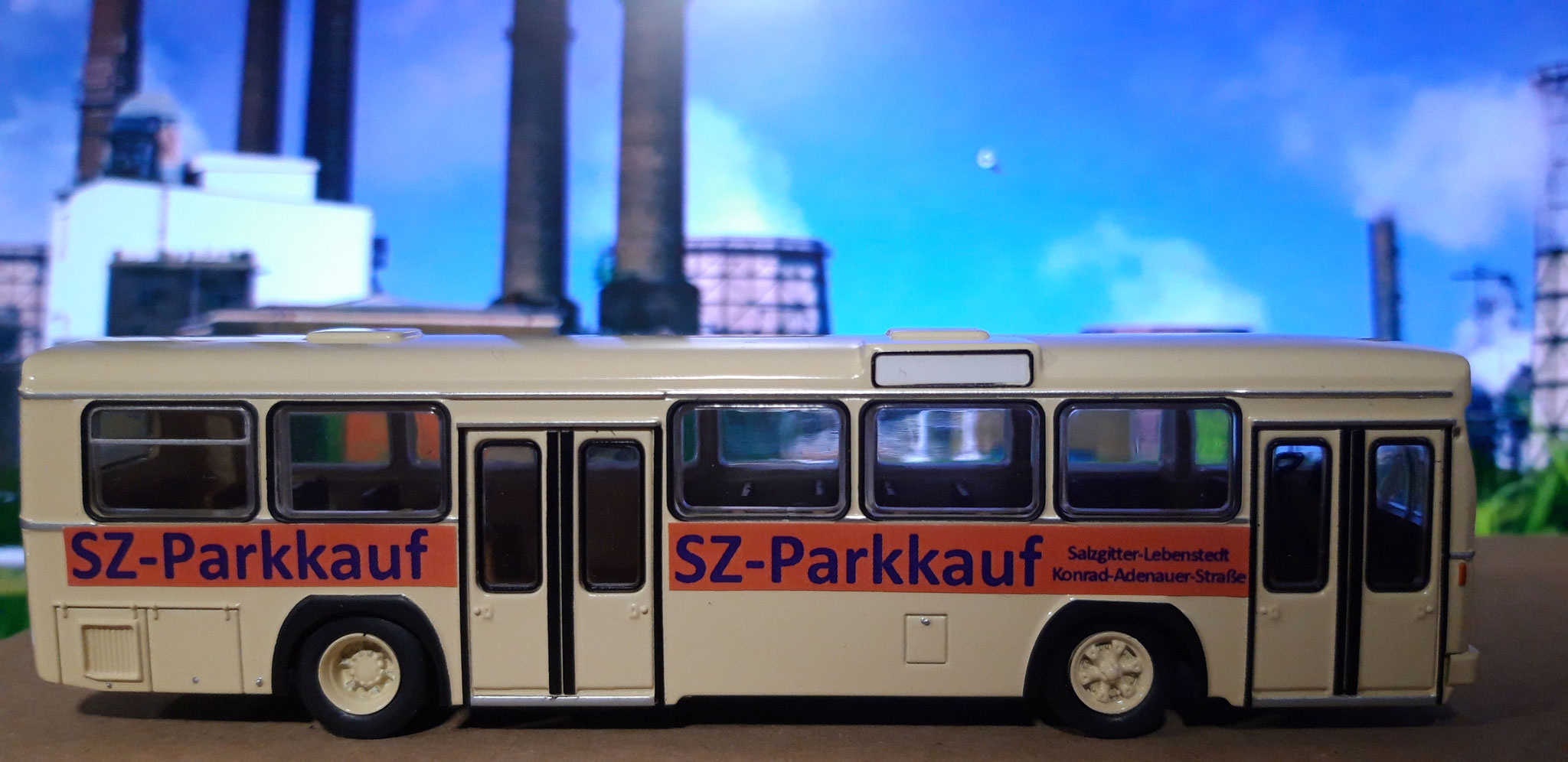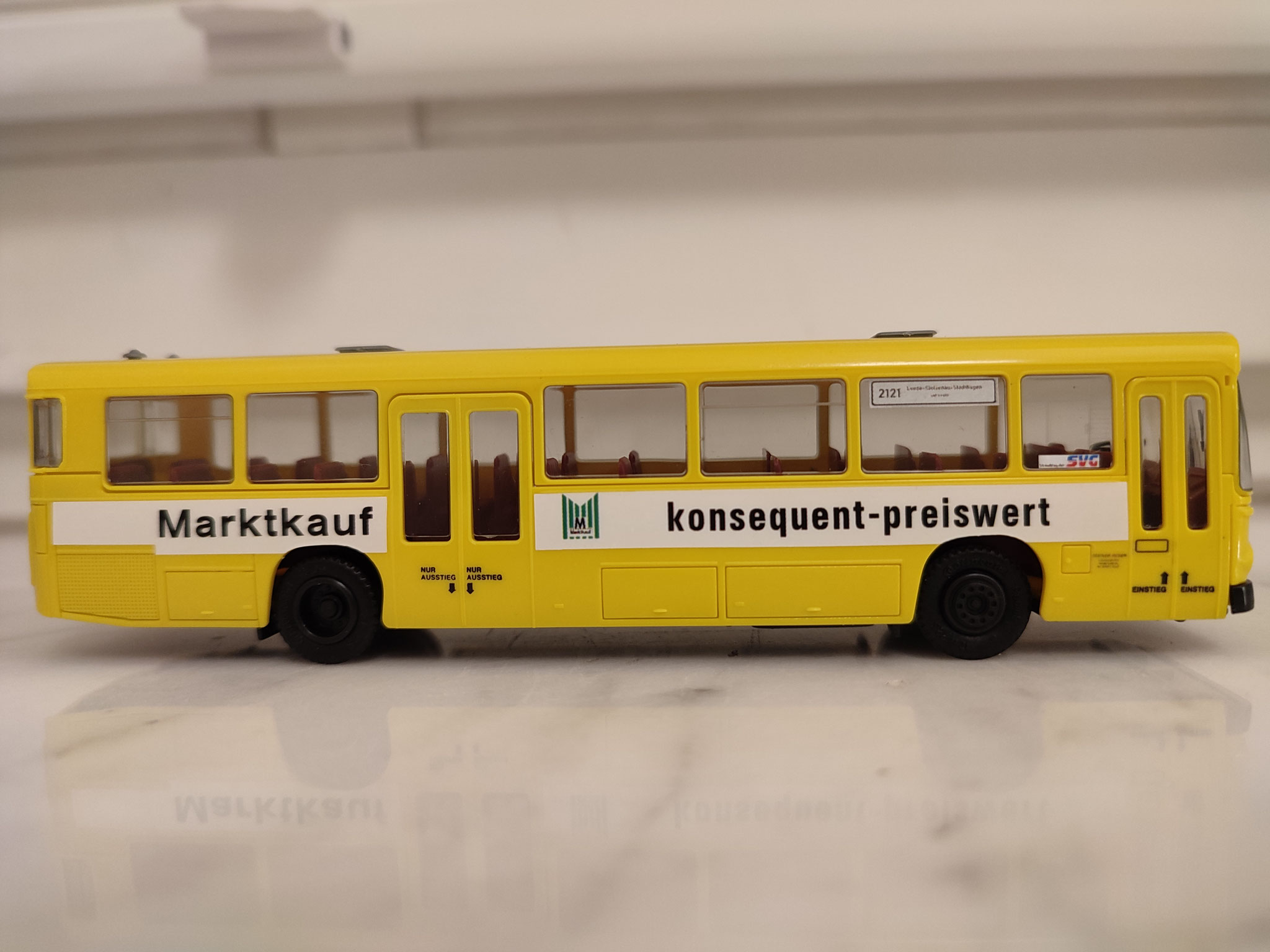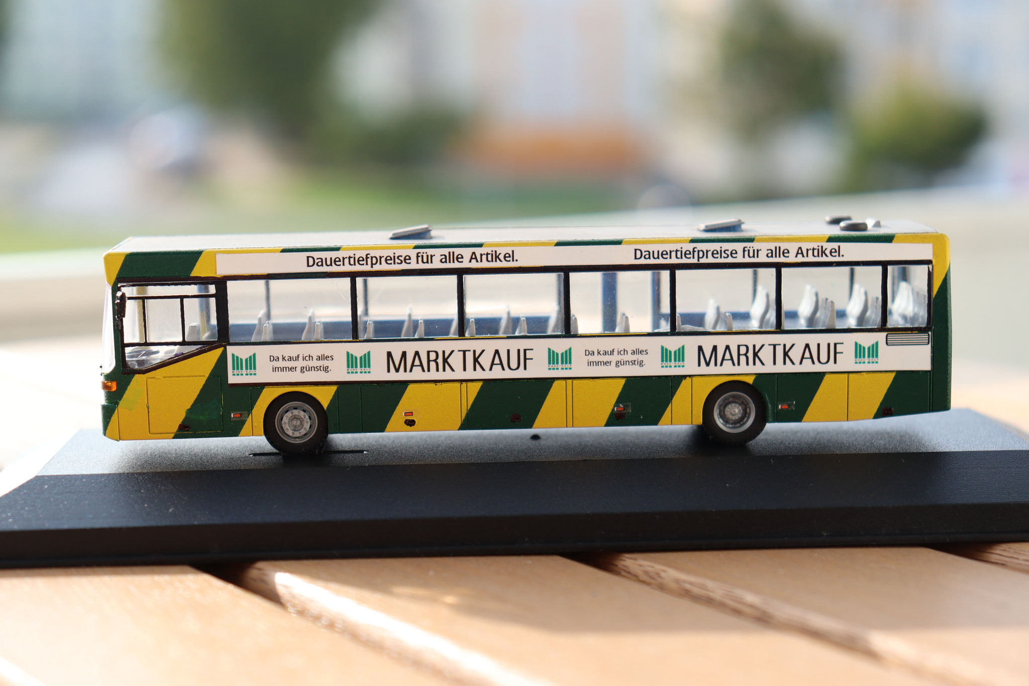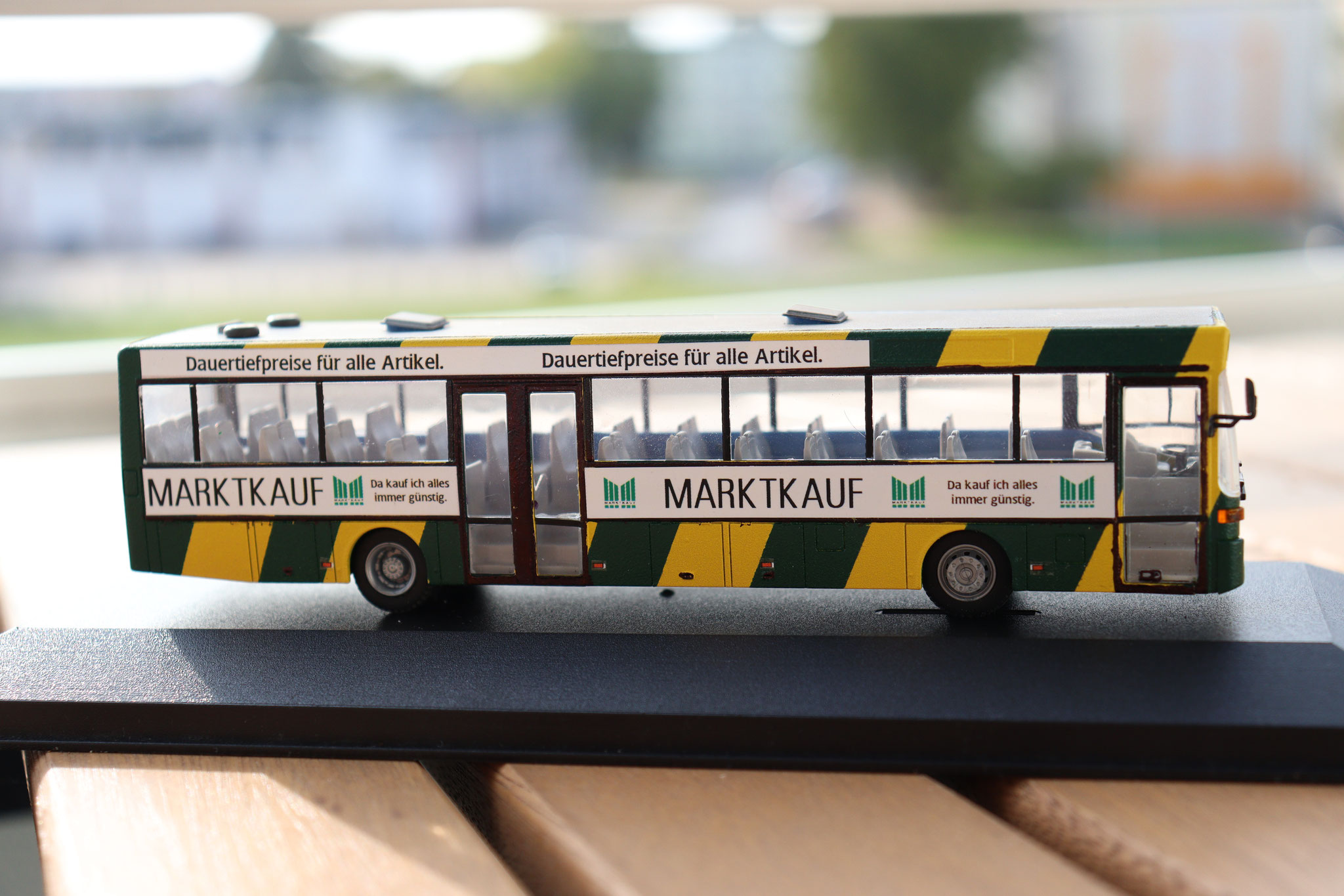 Für Herrn Hellmund entstand auf Basis des MB O407 von Rietze die Marktkaufwerbung. Das Fahrzeug wurde zusätzlich passend lackiert und von mir stammt nur die Werbung selber.