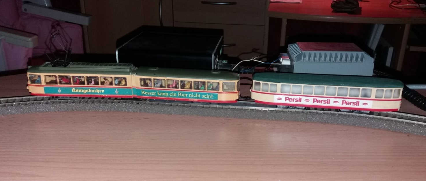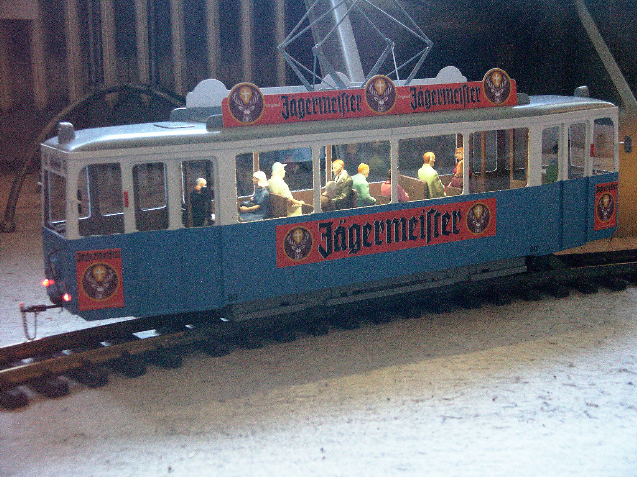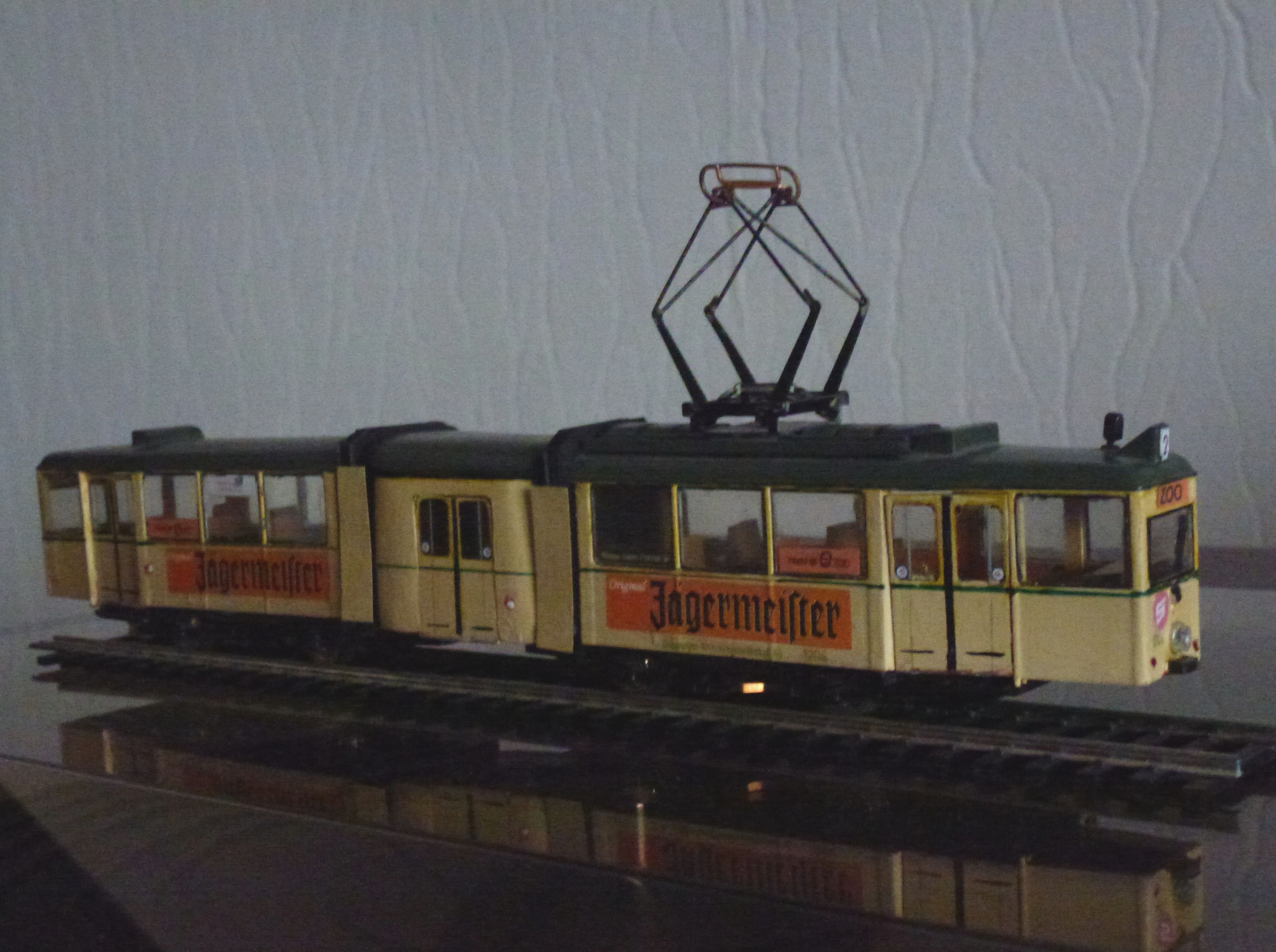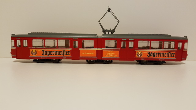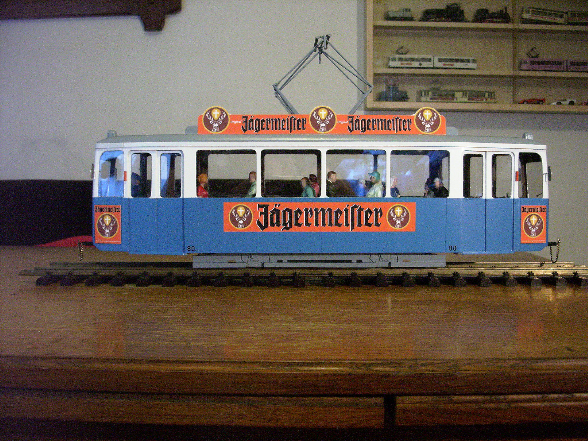 Der 4 Achs Beiwagen ist ein K66 Zweirichtungsbeiwagen (Eigenbau aus Lima Modell) mit der Nummer 1206. Diesem fehlt noch die passende Jägermeisterwerbung.