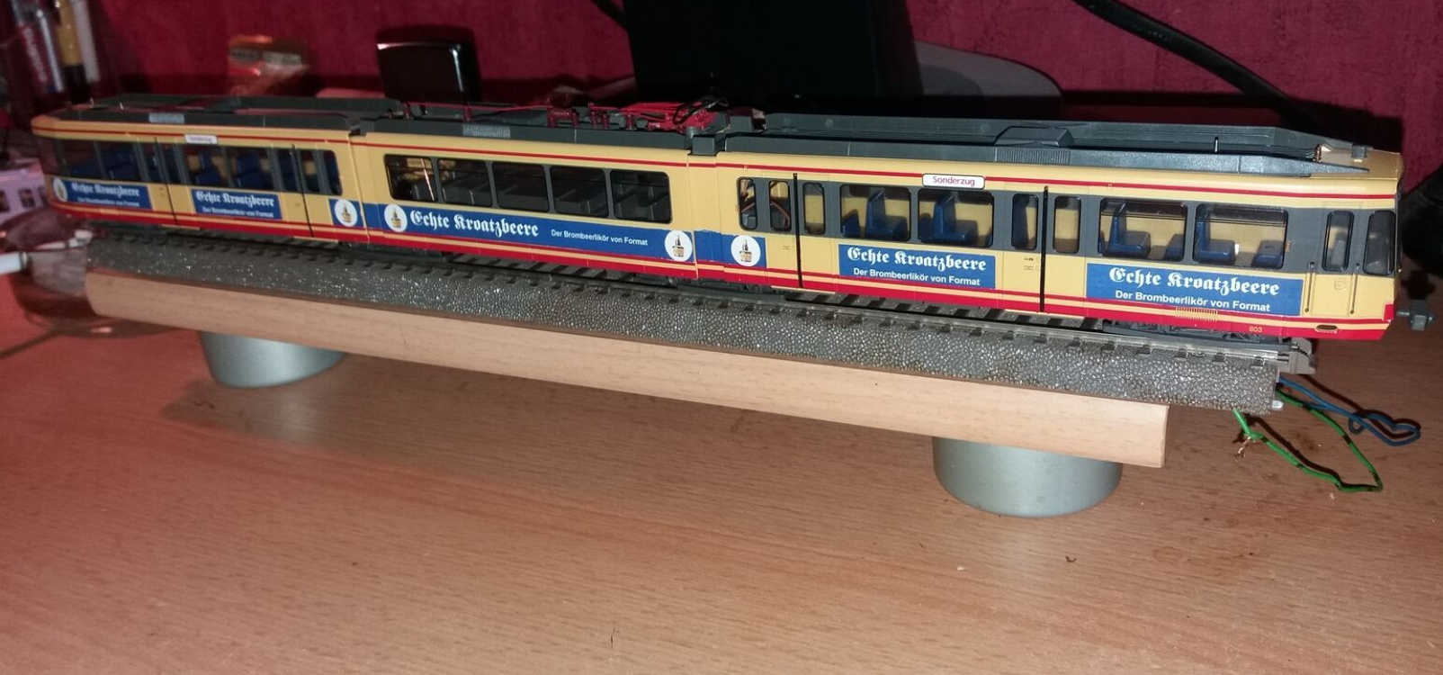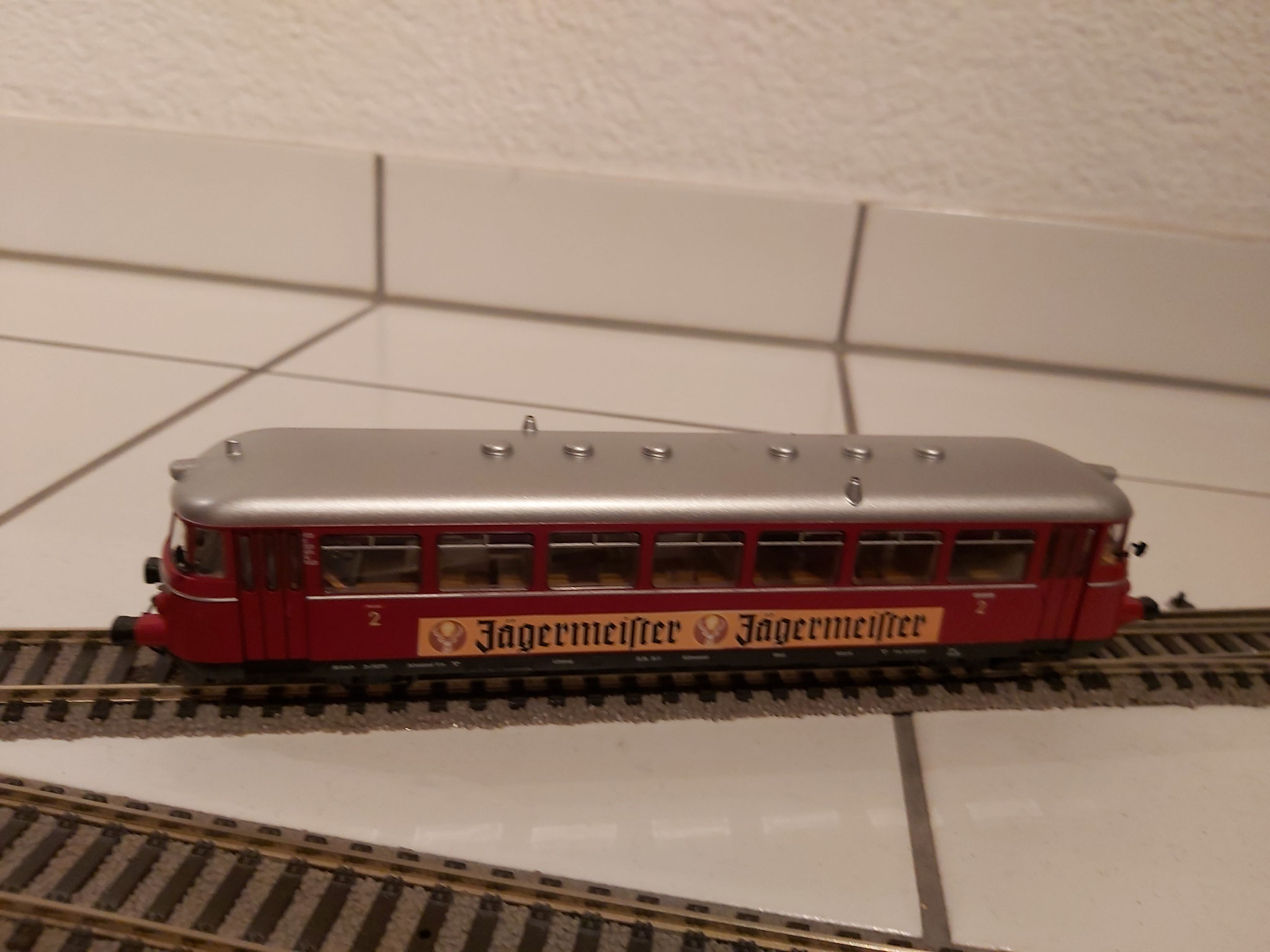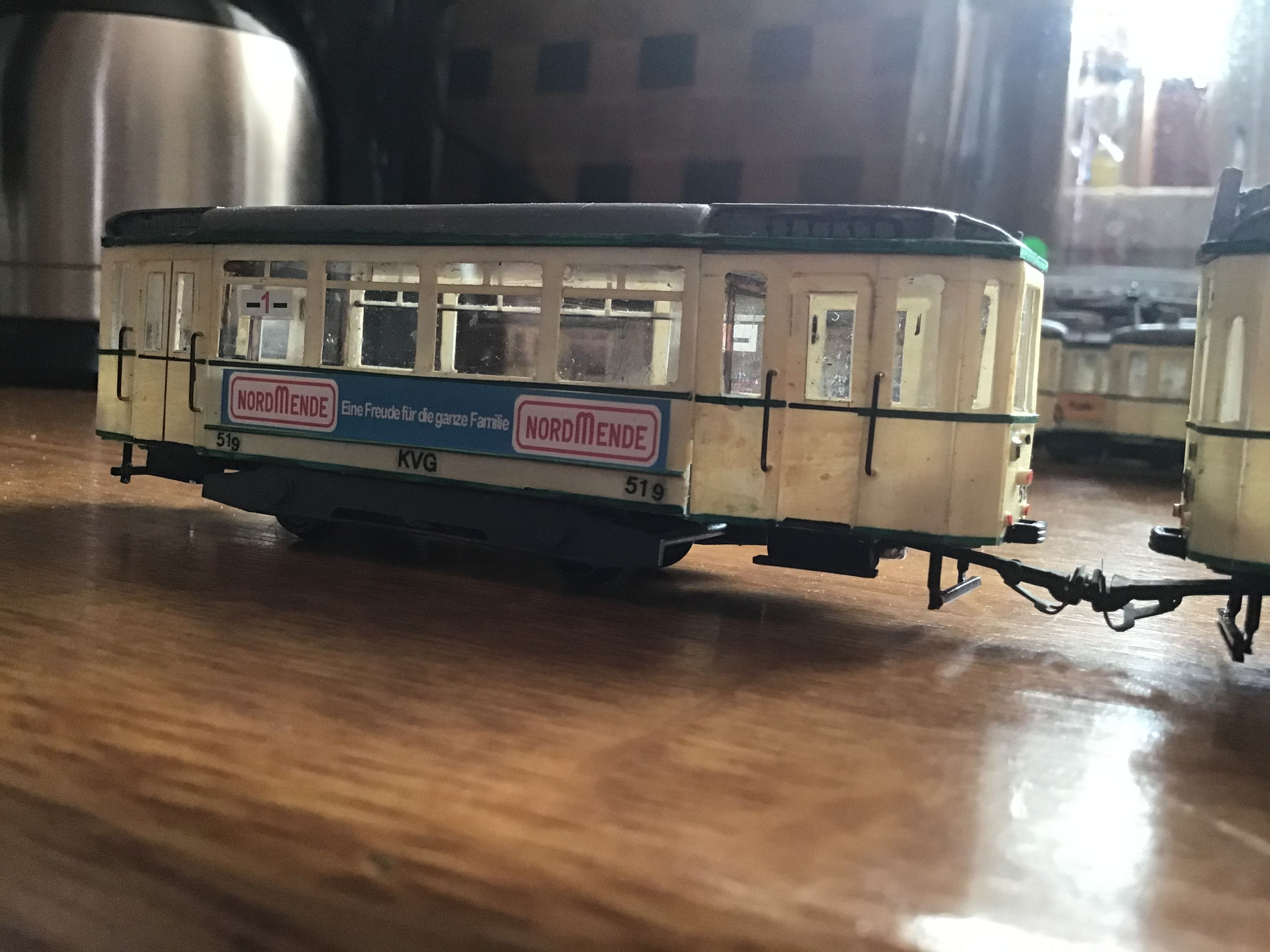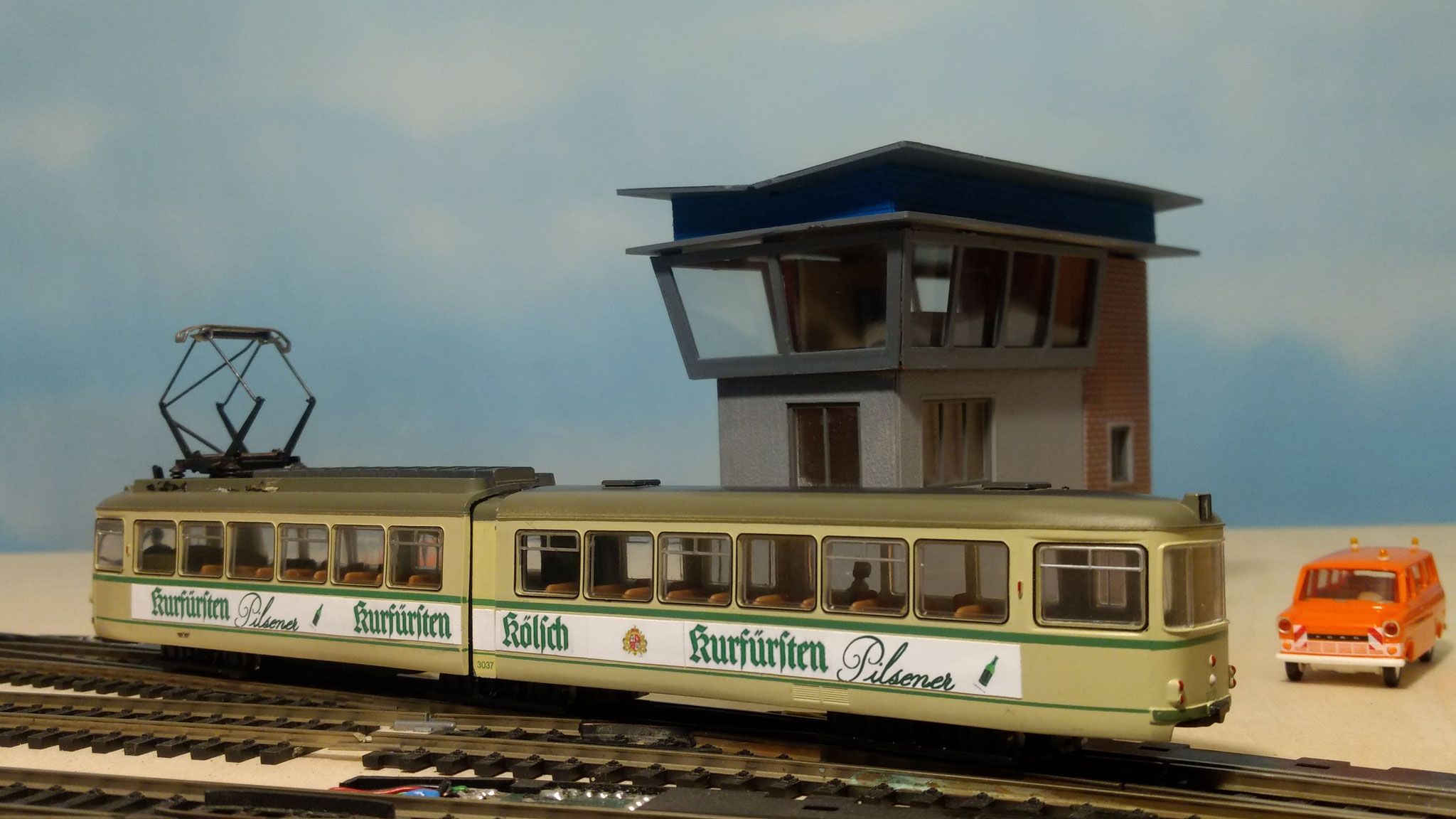 Der 4 Achs Beiwagen ist ein K66 Zweirichtungsbeiwagen (Eigenbau aus Lima Modell) mit der Nummer 1206. Diesem fehlt noch die passende Jägermeisterwerbung.
