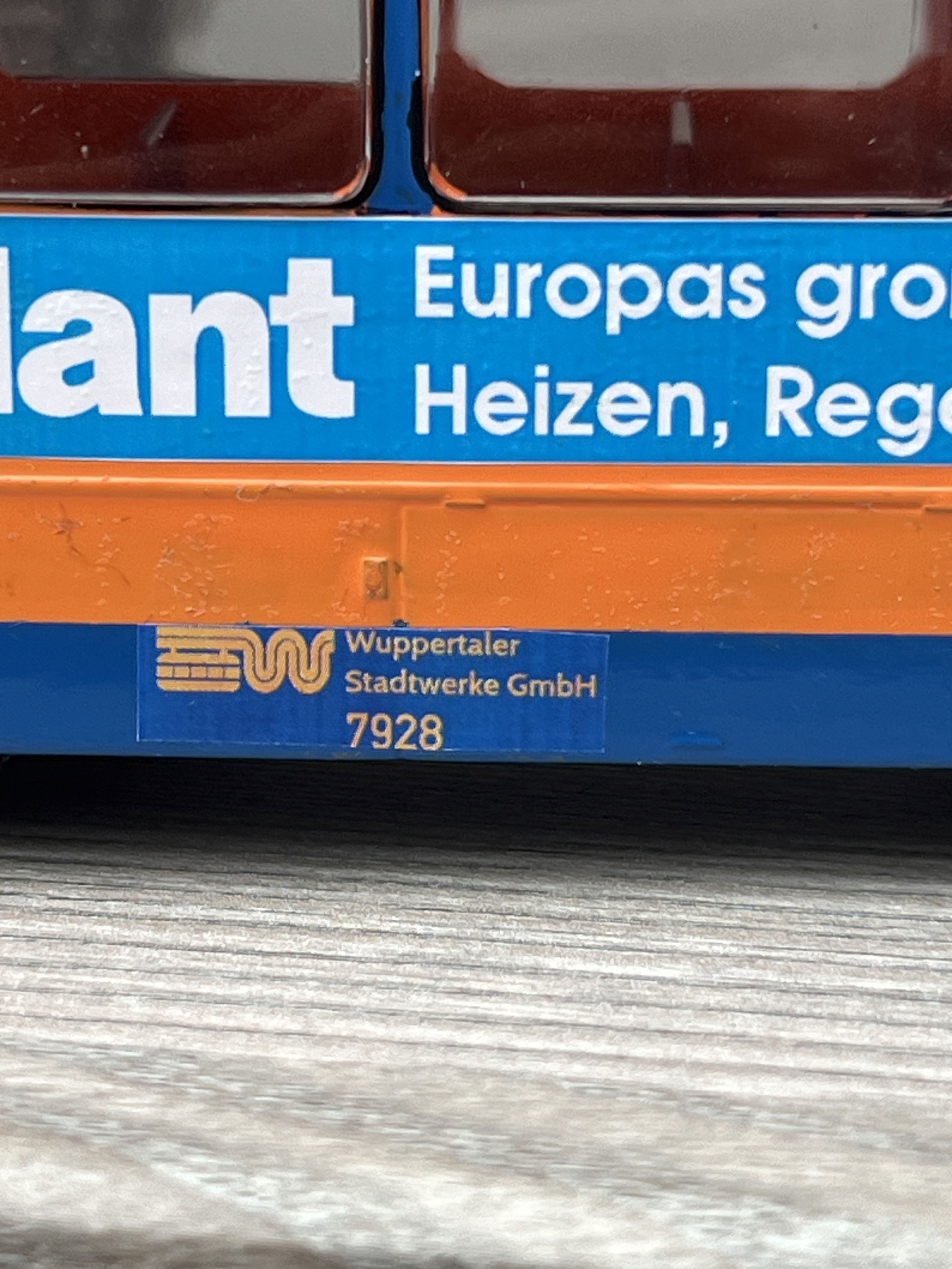 Im Kundenauftrag von Herrn Görsch erstellte ich Werbung für einen Zweirichtungsvierachser mit einfacher Mitteltür. Das Modell ist ein 3D Druck der Firma Guido Mansfeld. Vorbild war Tw 33 der Stadtwerke Neuss im Zustand um 1970.