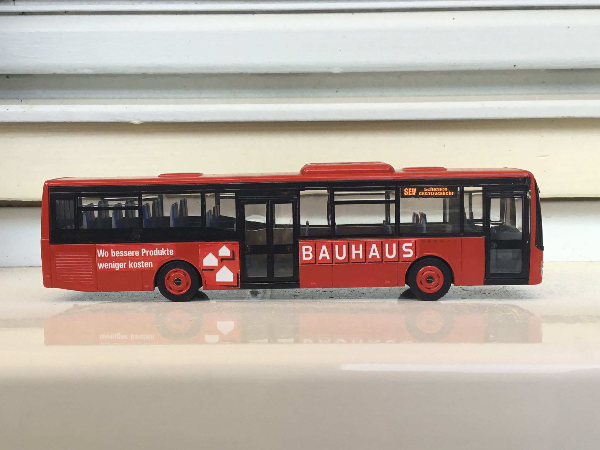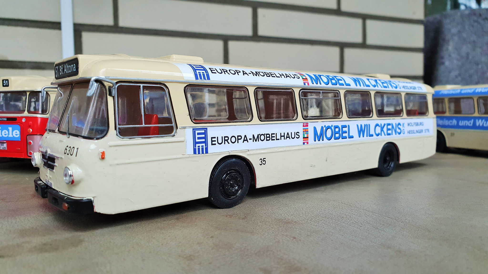 Im Kundenauftrag von M.v.Kreutz (Stadtbus Design) enstanden diverse Werbungen nach Wolfsburger Vorbild im Maßstab 1:43 für den Büssing Senator von IXO.