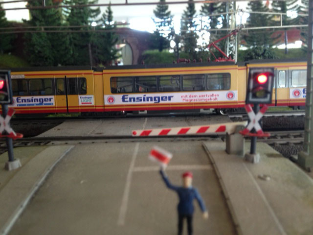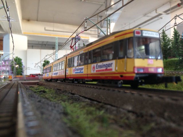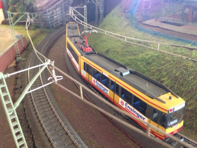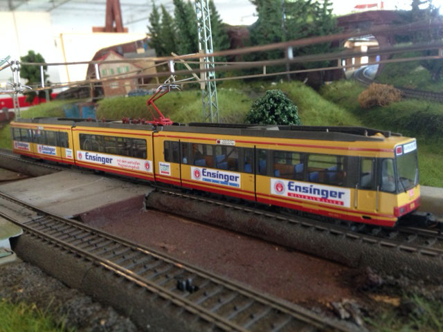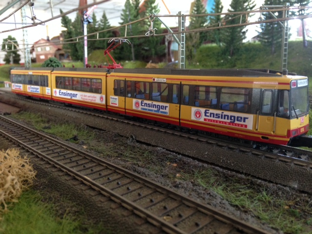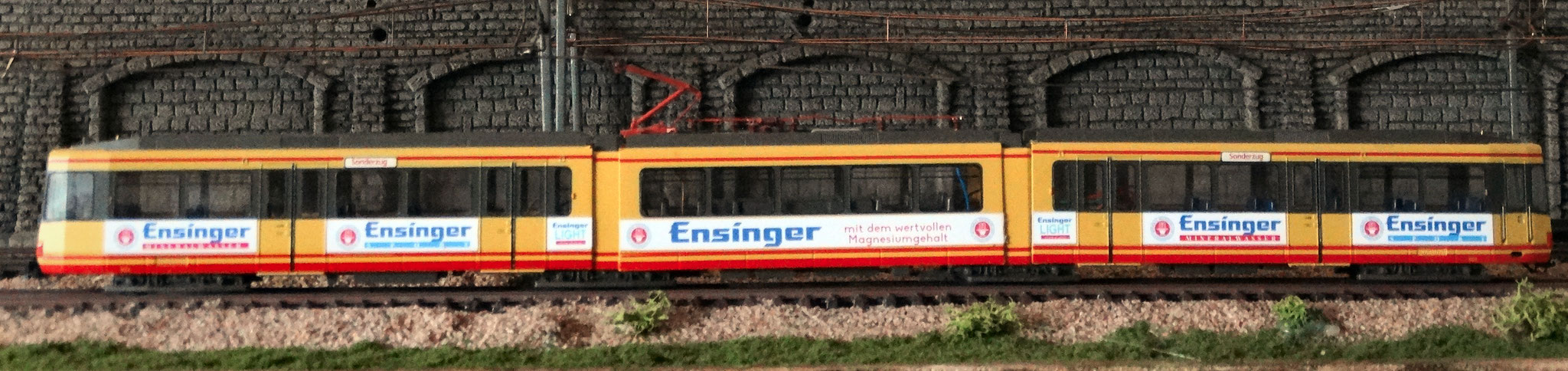 Auf der Anlage "Bruchsal" dreht ein Roco Gt8 100C2 mit Ensinger Werbung seine Runden. Das Fahrzeug gehört F. Seemann der freundlicher Weise die Bilder zur Verfügung stellte. Mehr unter www.sambahn.de