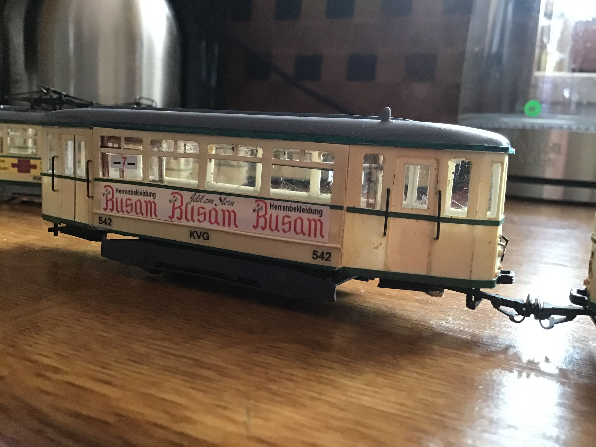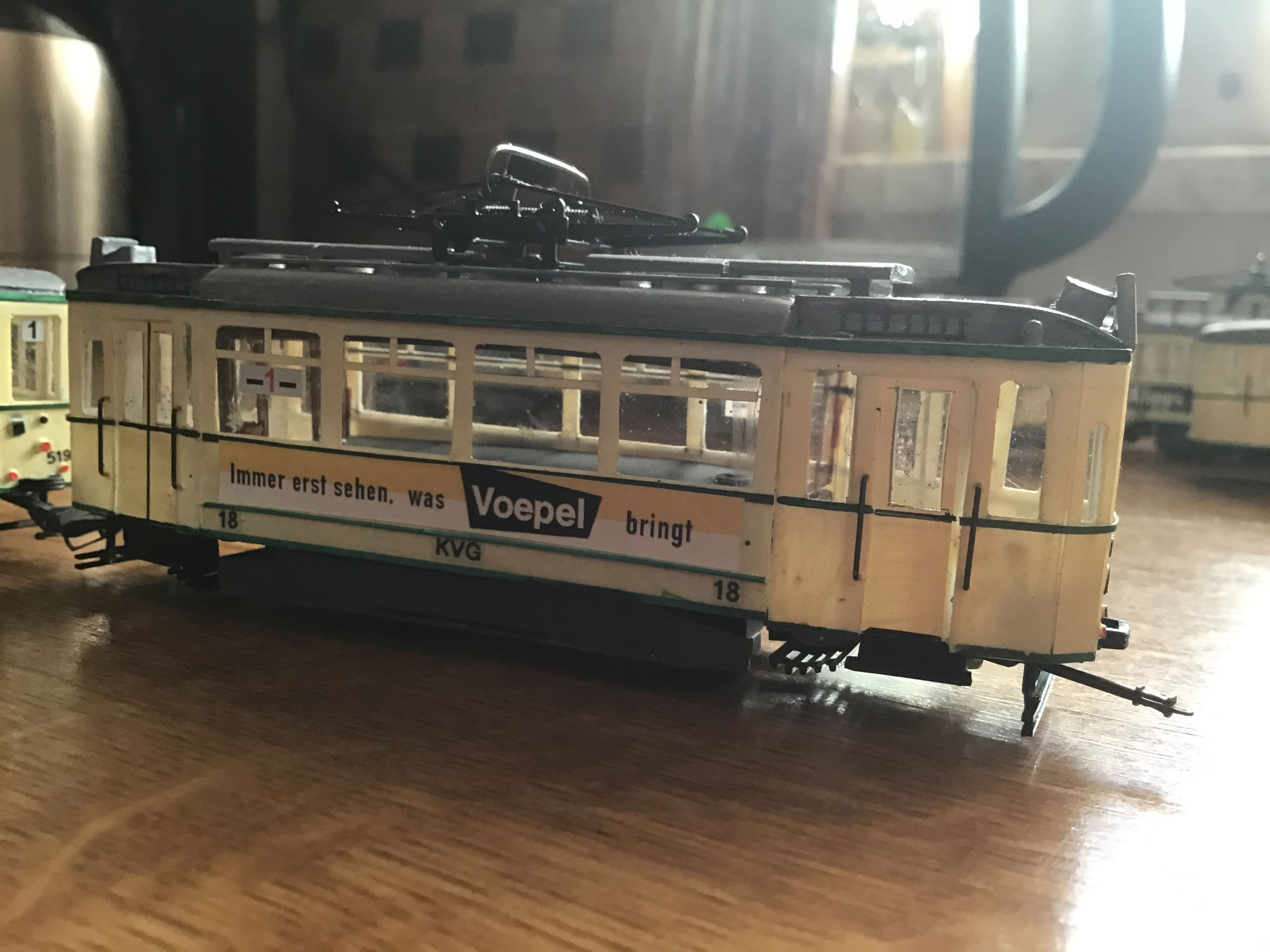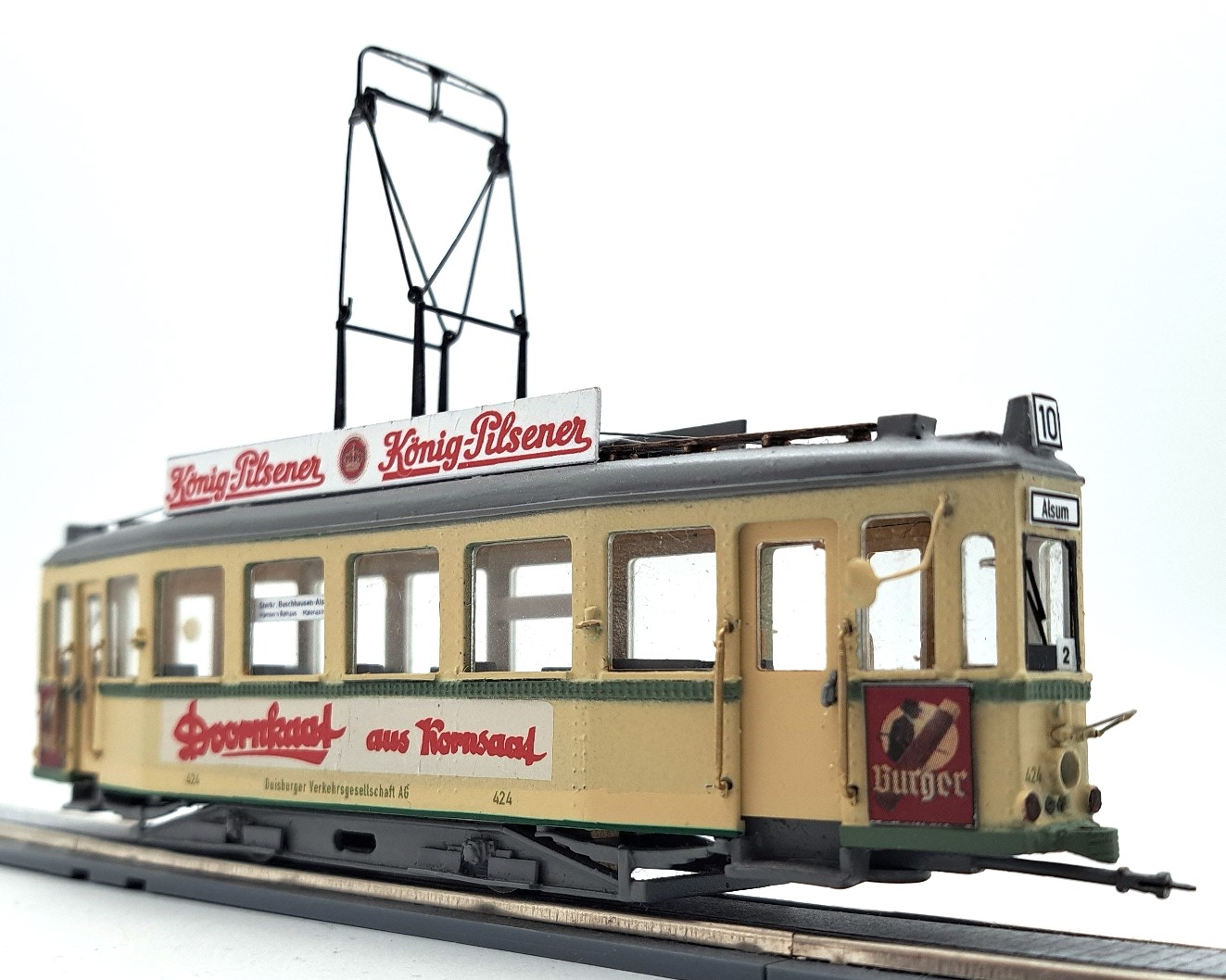 Dieser KSW Beiwagen nach Duisburger Vorbild entstand aus einem Halling "Weißmodell" und wurde von Herrn Vollstedt durch Zurüstteile und Evergreen Profile (Inneneinrichtung) dem Duisburger Vorbild angepasst. Beschriftung und Werbung kam aus diesem Haus.