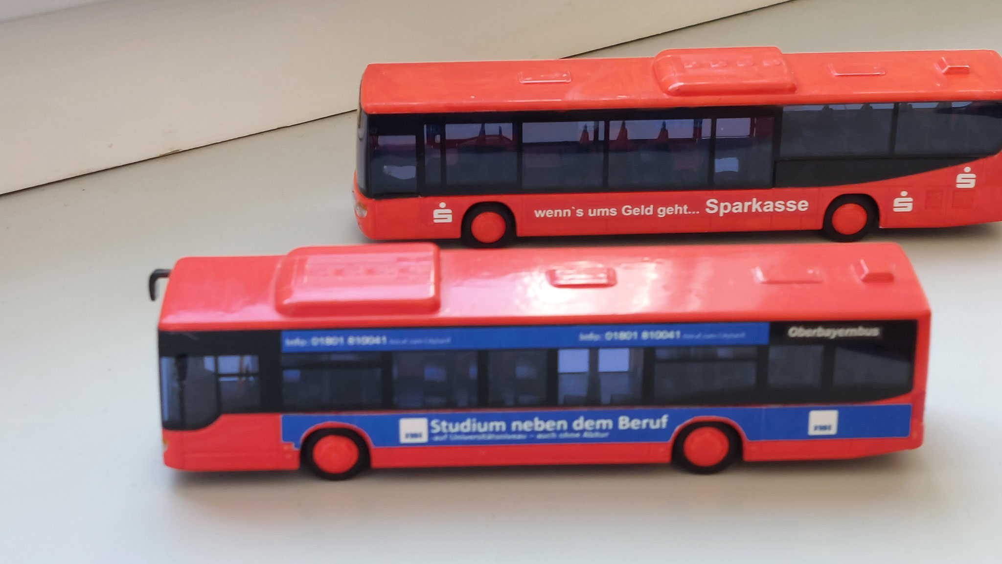 MAN SÜ240 und MB O307 eines Kunden mit angefertigter Werbung.