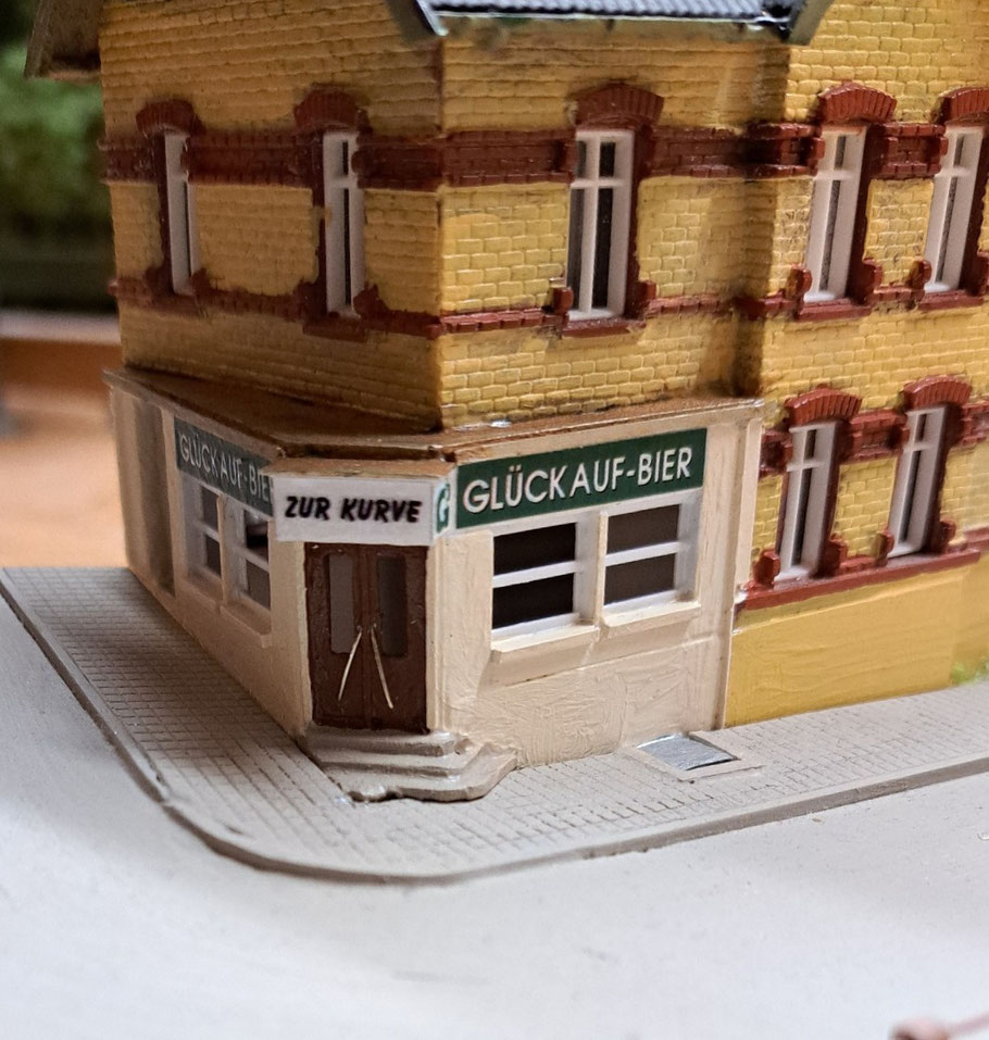 Mal was Anderes! Eckkneipe zur Kurve im Massstab 1:160 erstellt von M.Vollstedt. Die Decals wurde erstellt auf Basis der Straßenbahnwerbung für Düwag Sechsacher nach Bochumer Vorbild.