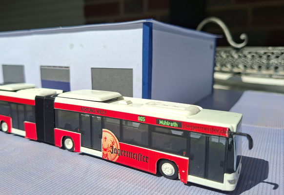 Ein Versuch war die Jägermeisterwerbung auf einen MBO 530G C2 aufzubringen. Leider schlug der Versuch mit einer wasserlöslichen Folie auf dem Modell von AMW fehl. Die Folie wollte nicht auf dem Kunstoff haften bleiben, so dass ich auf die selbstklebende Polyesterfolie zurück gegriffen habe. Vorbild hierzu war ein Berliner Citaro. Hier aber wiederum im Dienst der fiktiven Firma Schmitz. Ausgestattet unter anderem auch mit Zielanzeigern. Die Linie 865 wird im original mit Gelenkbussen der Firma Fücker bedient.