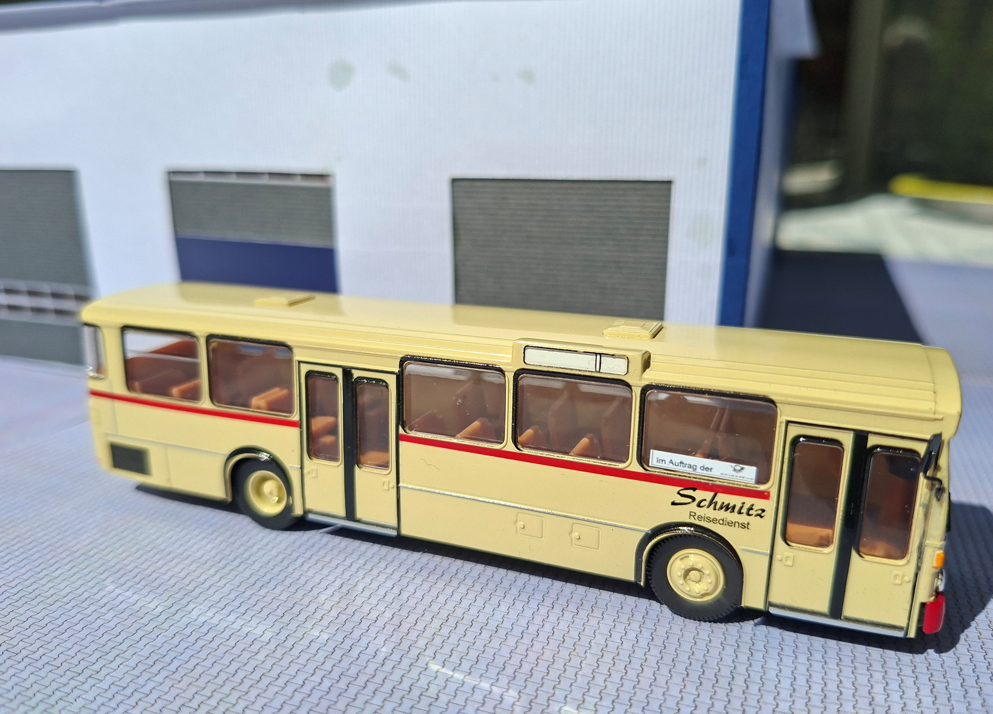 Im Kreis Neuss gab und gibt es immer noch einige Busunternehmen, welche für den BVR und dessen Vorgänger Leistungen fuhren. Hier handelt es sich um ein fiktives Unternehmen mit einem für die rheinische Gegend weit verbreiteten Namen. Ein MB O305 von Brekina, aufgehübscht mit Zierlinien und dem obligaten Im Auftrag Schild im Seitenfenster.